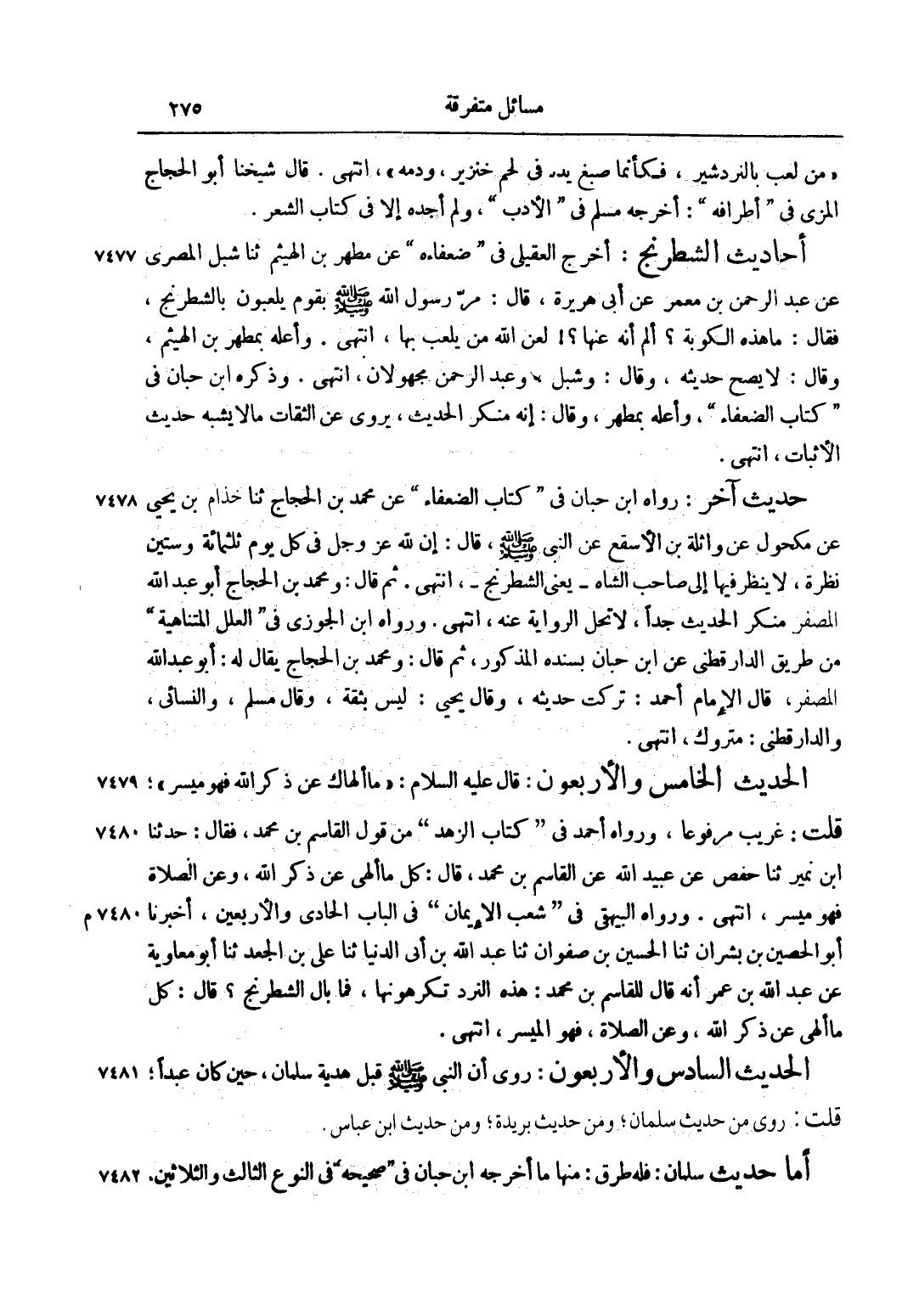 حَدِيثٌ آخَرُ: رَوَاهُ ابْنُ حِبَّانَ فِي كِتَابِ الضُّعَفَاءِ عَنْ مُحَمَّدِ بْنِ الْحَجَّاجِ ثَنَا حِزَامُ بْنُ يَحْيَى عَنْ مَكْحُولٍ عَنْ وَاثِلَةَ بْنِ الْأَسْقَعِ عَنْ النَّبِيِّ صَلَّى اللَّهُ عَلَيْهِ وَسَلَّمَ، قَالَ: "إنَّ لِلَّهِ عَزَّ وَجَلَّ فِي كُلِّ يَوْمٍ ثلثمائة وَسِتِّينَ نَظْرَةً، لَا يَنْظُرُ فِيهَا إلَى صَاحِبِ الشَّاهِ يَعْنِي الشِّطْرَنْجَ"، انْتَهَى. ثُمَّ قَالَ: وَمُحَمَّدُ بْنُ الْحَجَّاجِ أَبُو عَبْدِ اللَّهِ الْمُصَغَّرُ مُنْكَرُ الْحَدِيثِ جِدًّا، لَا تَحِلُّ الرِّوَايَةُ عَنْهُ، انْتَهَى. وَرَوَاهُ ابْنُ الْجَوْزِيِّ فِي الْعِلَلِ الْمُتَنَاهِيَةِ مِنْ طَرِيقِ الدَّارَقُطْنِيِّ عَنْ ابْنِ حِبَّانَ بِسَنَدِهِ الْمَذْكُورِ، ثُمَّ قَالَ: وَمُحَمَّدُ بْنُ الْحَجَّاجِ يُقَالُ لَهُ: أَبُو عَبْدِ اللَّهِ الْمُصَغَّرُ، قَالَ الْإِمَامُ أَحْمَدُ: تَرَكْتُ حَدِيثَهُ، وَقَالَ يَحْيَى: لَيْسَ بِثِقَةٍ، وَقَالَ مُسْلِمٌ، وَالنَّسَائِيُّ، والدارقطني: مَتْرُوكٌ، انْتَهَى.