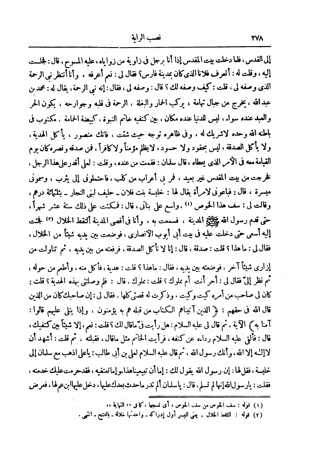 إلَى الْقُدْسِ، فَلَمَّا دَخَلْتُ بَيْتَ الْمَقْدِسِ إذَا أَنَا بِرَجُلٍ فِي زَاوِيَةٍ مِنْ زَوَايَاهُ، عَلَيْهِ الْمُسُوحُ، قَالَ: فَجَلَسْتُ إلَيْهِ، وَقُلْتُ لَهُ: أَتَعْرِفُ فُلَانًا الَّذِي كَانَ بِمَدِينَةِ فَارِسَ؟ فَقَالَ لِي: نَعَمْ أَعْرِفُهُ، وَأَنَا أَنْتَظِرُ نَبِيَّ الرَّحْمَةِ الَّذِي وَصَفَهُ لِي، قُلْتُ: كَيْفَ وَصَفَهُ لَك؟ قَالَ: وَصَفَهُ لِي، فَقَالَ: إنَّهُ نَبِيُّ الرَّحْمَةِ، يُقَالُ لَهُ: مُحَمَّدُ بْنُ عَبْدِ اللَّهِ، يَخْرُجُ مِنْ جِبَالِ تِهَامَةَ، يَرْكَبُ الْحِمَارَ وَالْبَغْلَةَ، الرَّحْمَةُ فِي قَلْبِهِ وَجَوَارِحِهِ، يَكُونُ الْحُرُّ وَالْعَبْدُ عِنْدَهُ سَوَاءً، لَيْسَ لِلدُّنْيَا عِنْدَهُ مَكَانٌ، بَيْنَ كَتِفَيْهِ خَاتَمُ النُّبُوَّةِ، كَبَيْضَةِ الْحَمَامَةِ، مَكْتُوبٌ فِي بَاطِنِهِ اللَّهُ وَحْدَهُ لَا شَرِيكَ لَهُ، وَفِي ظَاهِرِهِ تَوَجَّهْ حَيْثُ شِئْتَ، فَإِنَّك مَنْصُورٌ، يَأْكُلُ الْهَدِيَّةَ، وَلَا يَأْكُلُ الصَّدَقَةَ، لَيْسَ بِحَقُودٍ وَلَا حَسُودٍ، لَا يَظْلِمُ مُؤْمِنًا وَلَا كَافِرًا، فَمَنْ صَدَّقَهُ وَنَصَرَهُ كَانَ يَوْمَ الْقِيَامَةِ مَعَهُ فِي الْأَمْرِ الَّذِي يُعْطَاهُ، قَالَ سَلْمَانُ: فَقُمْتُ مِنْ عِنْدِهِ، وَقُلْت: لَعَلِّي أَقْدِرُ عَلَى هَذَا الرَّجُلِ، فَخَرَجْتُ مِنْ بَيْتِ الْمَقْدِسِ غَيْرَ بَعِيدٍ، فَمَرَّ بِي أَعْرَابٌ مِنْ كَلْبٍ، فَاحْتَمَلُونِي إلَى يَثْرِبَ، وَسَمَّوْنِي مَيْسَرَةَ، قَالَ: فَبَاعُونِي لِامْرَأَةٍ يُقَالُ لَهَا: حُلَيْسَةُ بِنْتُ فُلَانٍ حليف لبني النجار بثلثمائة دِرْهَمٍ، وَقَالَتْ لِي: سِفْ هَذَا الْخَوْصَ1 وَاسْعَ عَلَى بَنَاتِي، قَالَ: فَمَكَثْتُ عَلَى ذَلِكَ سِتَّةَ عَشَرَ شَهْرًا، حَتَّى قَدِمَ رَسُولُ اللَّهِ صَلَّى اللَّهُ عَلَيْهِ وَسَلَّمَ الْمَدِينَةَ، فَسَمِعْتُ بِهِ، وَأَنَا فِي أَقْصَى الْمَدِينَةِ أَلْتَقِطُ الْخِلَالَ2 فَجِئْتُ إلَيْهِ أَسْعَى حَتَّى دَخَلْت عَلَيْهِ فِي بَيْتِ أَبِي أَيُّوبَ الْأَنْصَارِيِّ، فَوَضَعْت بَيْنَ يَدَيْهِ شَيْئًا مِنْ الْخِلَالِ، فَقَالَ لِي: "مَا هَذَا"؟ قُلْت: صَدَقَةٌ، قَالَ: "إنَّا لَا نَأْكُلُ الصَّدَقَةَ"، فَرَفَعْته مِنْ بَيْنَ يَدَيْهِ، ثُمَّ تَنَاوَلْت مِنْ إزَارِي شَيْئًا آخَرَ، فَوَضَعْته بَيْنَ يَدَيْهِ، فَقَالَ: "مَا هَذَا"؟ قُلْت: هَدِيَّةٌ، فَأَكَلَ مِنْهُ، وَأَطْعَمَ مَنْ حَوْلَهُ، ثُمَّ نَظَرَ إلَيَّ فَقَالَ لِي: "أَحُرٌّ أَنْتَ أَمْ مَمْلُوكٌ"؟ قُلْت: مَمْلُوكٌ، قَالَ: "فَلِمَ وَصَلْتنِي بِهَذِهِ الْهَدِيَّةِ"؟ قُلْت: كَانَ لِي صَاحِبٌ مِنْ أَمْرِهِ كَيْتَ وَكَيْتَ، وَذَكَرْت لَهُ قِصَّتِي كُلَّهَا، فَقَالَ لِي: "إنَّ صَاحِبَك كَانَ مِنْ الَّذِينَ قَالَ اللَّهُ فِي حَقِّهِمْ: {الَّذِينَ آتَيْنَاهُمْ الْكِتَابَ مِنْ قَبْلِهِ هُمْ بِهِ يُؤْمِنُونَ، وَإِذَا يُتْلَى عَلَيْهِمْ قَالُوا آمَنَّا بِهِ} " الْآيَةَ، ثُمَّ قَالَ لِي عليه السلام: "هَلْ رَأَيْت فِي مَا قَالَ لَكَ"؟ قُلْت: نَعَمْ، إلَّا شَيْئًا بَيْنَ كَتِفَيْك، قَالَ: فَأَلْقَى عليه السلام رِدَاءَهُ عَنْ كَتِفِهِ، فَرَأَيْت الْخَاتَمَ مِثْلَ مَا قَالَ، فَقَبَّلْته، ثُمَّ قُلْت: أَشْهَدُ أَنْ لَا إلَهَ إلَّا اللَّهُ، وَأَنَّكَ رَسُولُ اللَّهِ، ثُمَّ قَالَ عليه السلام لِعَلِيِّ بْنِ أَبِي طَالِبٍ: "يَا عَلِيُّ اذْهَبْ مَعَ سَلْمَانَ إلَى حُلَيْسَةَ، فَقُلْ لَهَا: إنَّ رَسُولَ اللَّهِ يَقُولُ لَك: إمَّا أَنْ تَبِيعِينَا هَذَا، وَإِمَّا تُعْتِقِيهِ، فَقَدْ حَرُمَتْ عَلَيْكِ خِدْمَتُهُ"، فَقُلْت: يَا رَسُولَ اللَّهِ إنَّهَا لَمْ تُسْلِمْ، قَالَ: " يَا سَلْمَانَ أَلَمْ تَدْرِ مَا حَدَثَ بَعْدَك عَلَيْهَا، دَخَلَ عَلَيْهَا ابْنُ عَمٍّ لَهَا، فَعَرَضَ