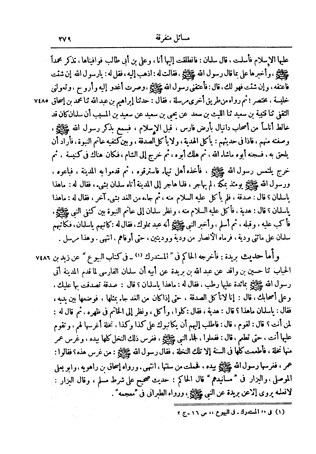 وَأَمَّا حَدِيثُ بُرَيْدَةَ: فَأَخْرَجَهُ الْحَاكِمُ فِي الْمُسْتَدْرَكِ1 فِي كِتَابِ الْبُيُوعِ عَنْ زَيْدِ بْنِ الْحُبَابِ ثَنَا حُسَيْنُ بْنُ وَاقِدٍ عَنْ عَبْدِ اللَّهِ بْنِ بُرَيْدَةَ عَنْ أَبِيهِ أَنَّ سَلْمَانَ الْفَارِسِيِّ لَمَّا قَدِمَ الْمَدِينَةَ أَتَى رَسُولَ اللَّهْ صَلَّى اللَّهُ عَلَيْهِ وَسَلَّمَ بِمَائِدَةٍ عَلَيْهَا رُطَبٌ، فَقَالَ لَهُ: " مَا هَذَا يَا سَلْمَانُ"؟ قَالَ: صَدَقَةٌ تَصَدَّقْتُ بِهَا عَلَيْك، وَعَلَى أَصْحَابِك، قَالَ: "إنَّا لَا نَأْكُلُ الصَّدَقَةَ"، حَتَّى إذَا كَانَ مِنْ الْغَدِ جَاءَ بِمِثْلِهَا، فَوَضَعَهَا بَيْنَ يَدَيْهِ، فَقَالَ: " يَا سَلْمَانُ مَا هَذَا"؟ قَالَ: هَدِيَّةٌ، فَقَالَ: "كُلُوا"، وَأَكَلَ، وَنَظَرَ إلَى الْخَاتَمِ فِي ظَهْرِهِ، ثُمَّ قَالَ لَهُ: "لِمَنْ أَنْتَ"؟ قَالَ: لِقَوْمٍ، قَالَ: "فَاطْلُبْ إلَيْهِمْ أَنْ يُكَاتِبُوك عَلَى كَذَا وَكَذَا، نَخْلَةً أَغْرِسُهَا لَهُمْ، وَتَقُومُ عَلَيْهَا أَنْتَ، حَتَّى تُطْعِمَ"، قَالَ: فَفَعَلُوا، فَجَاءَ النَّبِيُّ صَلَّى اللَّهُ عَلَيْهِ وَسَلَّمَ، فَغَرَسَ ذَلِكَ النَّخْلَ كُلَّهَا بِيَدِهِ، وَغَرَسَ عُمَرُ مِنْهَا نَخْلَةً، فَأَطْعَمَتْ كُلُّهَا فِي السَّنَةِ إلَّا تِلْكَ النَّخْلَةَ، فَقَالَ رَسُولُ اللَّهِ صَلَّى اللَّهُ عَلَيْهِ وَسَلَّمَ: "مَنْ غَرَسَ هَذِهِ"؟ فَقَالُوا: عُمَرُ، فَغَرَسَهَا رَسُولُ اللَّهِ صَلَّى اللَّهُ عَلَيْهِ وَسَلَّمَ بِيَدِهِ، فَحَمَلَتْ مِنْ سَنَتِهَا، انْتَهَى. وَرَوَاهُ إسْحَاقُ بْنُ رَاهْوَيْهِ، وَأَبُو يَعْلَى الْمَوْصِلِيُّ، وَالْبَزَّارُ فِي مَسَانِيدِهِمْ قَالَ الْحَاكِمُ: حَدِيثٌ صَحِيحٌ عَلَى شَرْطِ مُسْلِمٍ، وَقَالَ الْبَزَّارُ: لَا نَعْلَمُهُ يُرْوَى إلَّا عَنْ بُرَيْدَةَ عَنْ النَّبِيِّ صَلَّى اللَّهُ عَلَيْهِ وَسَلَّمَ، وَرَوَاهُ الطَّبَرَانِيُّ فِي مُعْجَمِهِ.