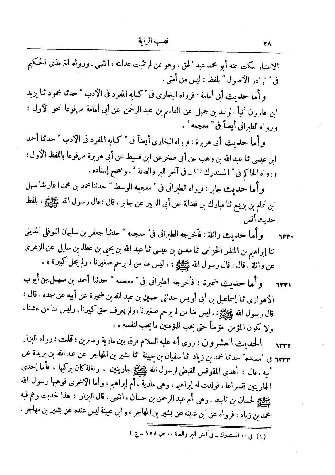 وَأَمَّا حَدِيثُ وَاثِلَةَ: فَأَخْرَجَهُ الطَّبَرَانِيُّ فِي مُعْجَمِهِ حَدَّثَنَا جَعْفَرُ بْنُ سُلَيْمَانَ النَّوْفَلِيُّ الْمَدِينِيُّ ثَنَا إبْرَاهِيمُ بْنُ الْمُنْذِرِ الْحِزَامِيُّ ثَنَا مِسْعَرُ بْنُ عِيسَى ثَنَا عَبْدُ اللَّهِ بْنُ يَحْيَى بْنِ عَطَاءِ بْنِ سَلِيلٍ عَنْ الزُّهْرِيِّ عَنْ وَاثِلَةَ، قَالَ: قَالَ رَسُولُ اللَّهِ صَلَّى اللَّهُ عَلَيْهِ وَسَلَّمَ: "لَيْسَ مِنَّا مَنْ لَمْ يَرْحَمْ صَغِيرَنَا، وَلَمْ يُجِلَّ كَبِيرَنَا".
