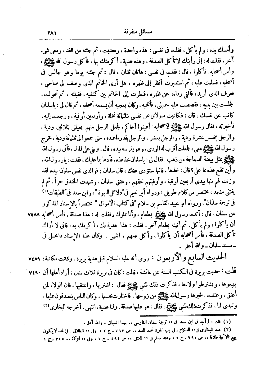 الْحَدِيثُ السَّابِعُ وَالْأَرْبَعُونَ: رُوِيَ أَنَّهُ عليه السلام قَبِلَ هَدِيَّةَ بَرِيرَةَ، وَكَانَتْ مُكَاتَبَةً، قُلْت: حَدِيثُ بَرِيرَةَ فِي الْكُتُبِ السِّتَّةِ عَنْ عَائِشَةَ، قَالَتْ: كَانَ فِي بَرِيرَةَ ثَلَاثُ سُنَنٍ: أَرَادَ أَهْلُهَا أَنْ يَبِيعُوهَا، وَيَشْتَرِطُوا وَلَاءَهَا، فَذَكَرْتُ ذَلِكَ لِلنَّبِيِّ صَلَّى اللَّهُ عَلَيْهِ وَسَلَّمَ فَقَالَ: "اشْتَرِيهَا، وَاعْتِقِيهَا، فَإِنَّ الْوَلَاءَ لِمَنْ أَعْتَقَ"، وَعَتَقَتْ، فَخَيَّرَهَا رَسُولُ اللَّهِ صَلَّى اللَّهُ عَلَيْهِ وَسَلَّمَ مِنْ زَوْجِهَا، فَاخْتَارَتْ نَفْسَهَا، وَكَانَ النَّاسُ يَتَصَدَّقُونَ عَلَيْهَا، وَتُهْدِي لَنَا، فَذَكَرَتْ ذَلِكَ لِلنَّبِيِّ صَلَّى اللَّهُ عَلَيْهِ وَسَلَّمَ فَقَالَ: "هُوَ عَلَيْهَا صَدَقَةٌ، وَلَنَا هَدِيَّةٌ"، انْتَهَى. أَخْرَجَهُ الْبُخَارِيُّ2