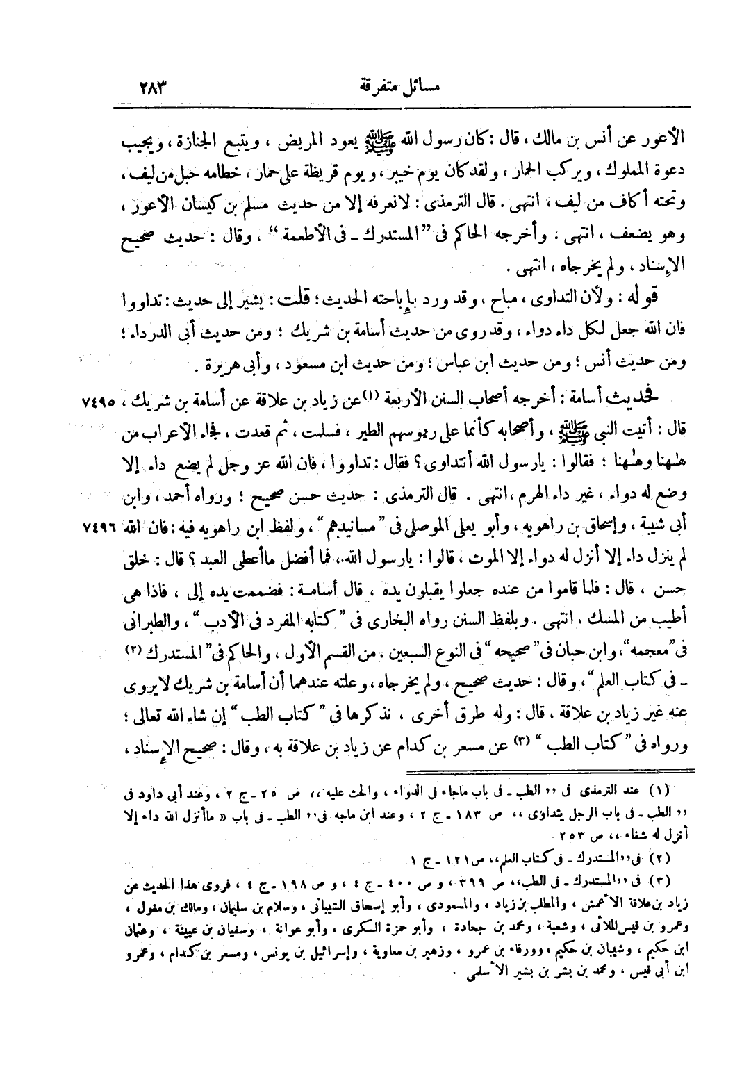 3 في المستدرك في الطب ص 399، وص 400 ج 4، وص 198 ج 4، فروى هذا الحديث زياد بن علاقة الأعمش، والمطلب بن زياد، والمسعودي، وأبو إسحاق الشيباني، وسلام بن سليمان، ومالك بن مغول، وعمرو بن قيس الملائي، وشعبة، ومحمد بن جحادة، وأبو حمزة السكري، وأبو عوانة، وسفيان بن عيينة، وعثمان ابن حكيم، وشيبان ابن حكيم، وورقاء بن عمرو، وزهير بن معاوية، وإسرائيل بن يونس، ومسعر بن كدام، وعمرو ابن أبي قيس، ومحمد بن بشر بن بشير الأسلمي.