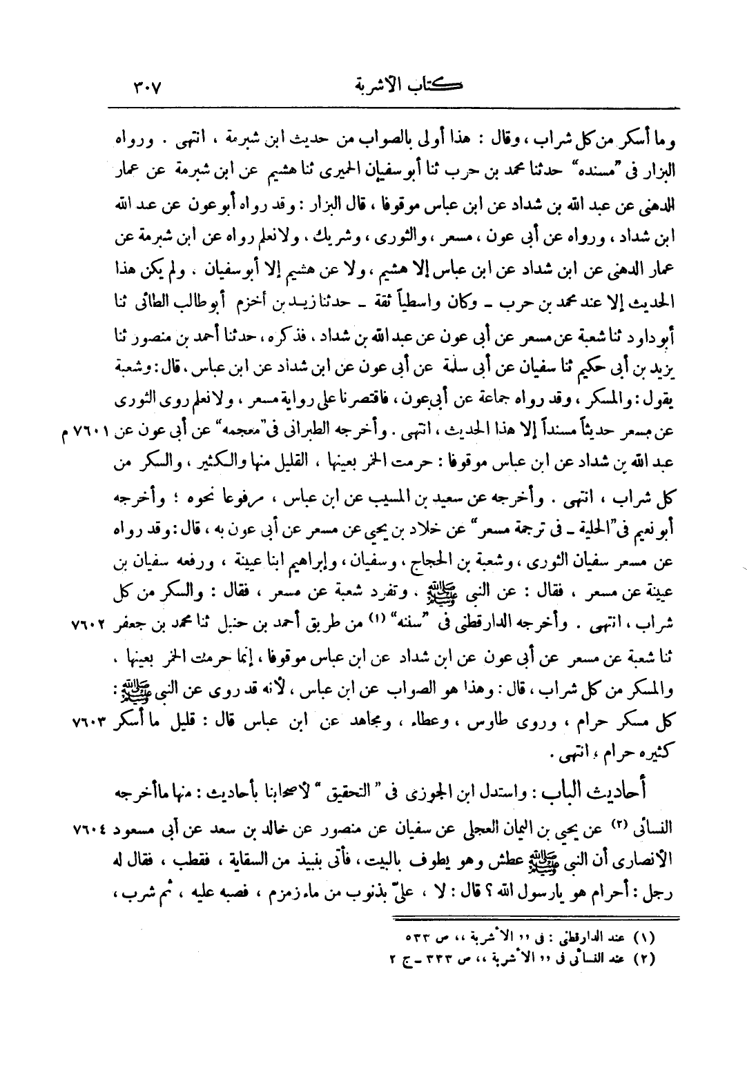 وَمَا أَسْكَرَ مِنْ كُلِّ شَرَابٍ، وَقَالَ هَذَا أَوْلَى بِالصَّوَابِ مِنْ حَدِيثِ ابْنِ شُبْرُمَةَ، انْتَهَى. وَرَوَاهُ الْبَزَّارُ فِي مُسْنَدِهِ حَدَّثَنَا مُحَمَّدُ بْنُ حَرْبٍ ثَنَا أَبُو سُفْيَانَ الْحِمْيَرِيُّ ثَنَا هُشَيْمِ عَنْ ابْنِ شُبْرُمَةَ عَنْ عَمَّارٍ الدُّهْنِيِّ عَنْ عَبْدِ اللَّهِ بْنِ شَدَّادٍ عَنْ ابْنِ عَبَّاسٍ مَوْقُوفًا، قَالَ الْبَزَّارُ: وَقَدْ رَوَاهُ أَبُو عَوْنٍ عَنْ عَبْدِ اللَّهِ بْنِ شَدَّادٍ، وَرَوَاهُ عَنْ أَبِي عَوْنٍ، مِسْعَرٌ، وَالثَّوْرِيُّ، وَشَرِيكٌ، وَلَا نَعْلَمُ رَوَاهُ عَنْ ابْنِ شُبْرُمَةَ عَنْ عَمَّارٍ الدُّهْنِيِّ عَنْ ابْنِ شَدَّادٍ عَنْ ابْنِ عَبَّاسٍ إلَّا هُشَيْمِ، وَلَا عَنْ هُشَيْمِ إلَّا أَبُو سُفْيَانَ، وَلَمْ يَكُنْ هَذَا الْحَدِيثُ إلَّا عِنْدَ مُحَمَّدِ بْنِ حَرْبٍ وَكَانَ وَاسِطِيًّا ثِقَةً حَدَّثَنَا زَيْدُ بن أخرم أَبُو طَالِبٍ الطَّائِيُّ ثَنَا أَبُو دَاوُد ثَنَا شُعْبَةُ عَنْ مِسْعَرٍ عَنْ أَبِي عَوْنٍ عَنْ عَبْدِ اللَّهِ بْنِ شَدَّادٍ، فَذَكَرَهُ، حَدَّثَنَا أَحْمَدُ بْنُ مَنْصُورٍ ثَنَا يَزِيدُ بْنُ أَبِي حَكِيمٍ ثَنَا سُفْيَانُ عَنْ أَبِي سَلَمَةَ عَنْ أَبِي عَوْنٍ عَنْ ابْنِ شَدَّادٍ عَنْ ابْنِ عَبَّاسٍ، قَالَ: وَشُعْبَةُ يَقُولُ: وَالْمُسْكِرُ، وَقَدْ رَوَاهُ جَمَاعَةٌ عَنْ أَبِي عَوْنٍ، فَاقْتَصَرْنَا عَلَى رِوَايَةِ مِسْعَرٍ، وَلَا نَعْلَمُ رَوَى الثَّوْرِيُّ عَنْ مِسْعَرٍ حَدِيثًا مُسْنَدًا إلَّا هَذَا الْحَدِيثَ، انْتَهَى. وَأَخْرَجَهُ الطَّبَرَانِيُّ فِي مُعْجَمِهِ عَنْ أَبِي عَوْنٍ عَنْ عَبْدِ اللَّهِ بْنِ شَدَّادٍ عَنْ ابْنِ عَبَّاسٍ مَوْقُوفًا: حُرِّمَتْ الْخَمْرُ بِعَيْنِهَا، الْقَلِيلُ مِنْهَا وَالْكَثِيرُ، وَالسُّكْرُ مِنْ كُلِّ شَرَابٍ، انْتَهَى. وَأَخْرَجَهُ عَنْ سَعِيدِ بْن الْمُسَيِّبِ عَنْ ابْنِ عَبَّاسٍ، مَرْفُوعًا نَحْوَهُ، وَأَخْرَجَهُ أَبُو نُعَيْمٍ فِي الْحِلْيَةِ فِي تَرْجَمَةِ مِسْعَرٍ عَنْ خَلَّادِ بْنِ يَحْيَى عَنْ مِسْعَرٍ عَنْ أَبِي عَوْنٍ بِهِ، قَالَ: وَقَدْ رَوَاهُ عَنْ مِسْعَرٍ سُفْيَانُ الثَّوْرِيُّ، وَشُعْبَةُ بْنُ الحجاج، وسفيان، وإبراهيم ابنا عُيَيْنَةَ، وَرَفَعَهُ سُفْيَانُ بْنُ عُيَيْنَةَ عَنْ مِسْعَرٍ، فَقَالَ: عَنْ النَّبِيِّ صَلَّى اللَّهُ عَلَيْهِ وَسَلَّمَ، وَتَفَرَّدَ شُعْبَةُ عَنْ مِسْعَرٍ، فَقَالَ: وَالسُّكْرُ مِنْ كُلِّ شَرَابٍ، انْتَهَى. وَأَخْرَجَهُ الدَّارَقُطْنِيُّ فِي سُنَنِهِ1 مِنْ طَرِيقِ أَحْمَدَ بْنِ حَنْبَلٍ ثَنَا مُحَمَّدُ بْنُ جَعْفَرٍ ثَنَا شُعْبَةُ عَنْ مِسْعَرٍ عَنْ أَبِي عَوْنٍ عَنْ ابْنِ شَدَّادٍ عَنْ ابْنِ عَبَّاسٍ مَوْقُوفًا، إنَّمَا حُرِّمَتْ الْخَمْرُ بِعَيْنِهَا، وَالْمُسْكِرُ مِنْ كُلِّ شَرَابٍ، قَالَ: وَهَذَا هُوَ الصَّوَابُ عَنْ ابْنِ عَبَّاسٍ، لِأَنَّهُ قَدْ رُوِيَ عَنْ النَّبِيِّ صَلَّى اللَّهُ عَلَيْهِ وَسَلَّمَ: "كُلُّ مُسْكِرٍ حَرَامٌ"، وَرَوَى طَاوُسٌ، وَعَطَاءٌ، وَمُجَاهِدٌ عَنْ ابْنِ عَبَّاسٍ قَالَ: قَلِيلُ مَا أَسْكَرَ كَثِيرُهُ حَرَامٌ، انْتَهَى.