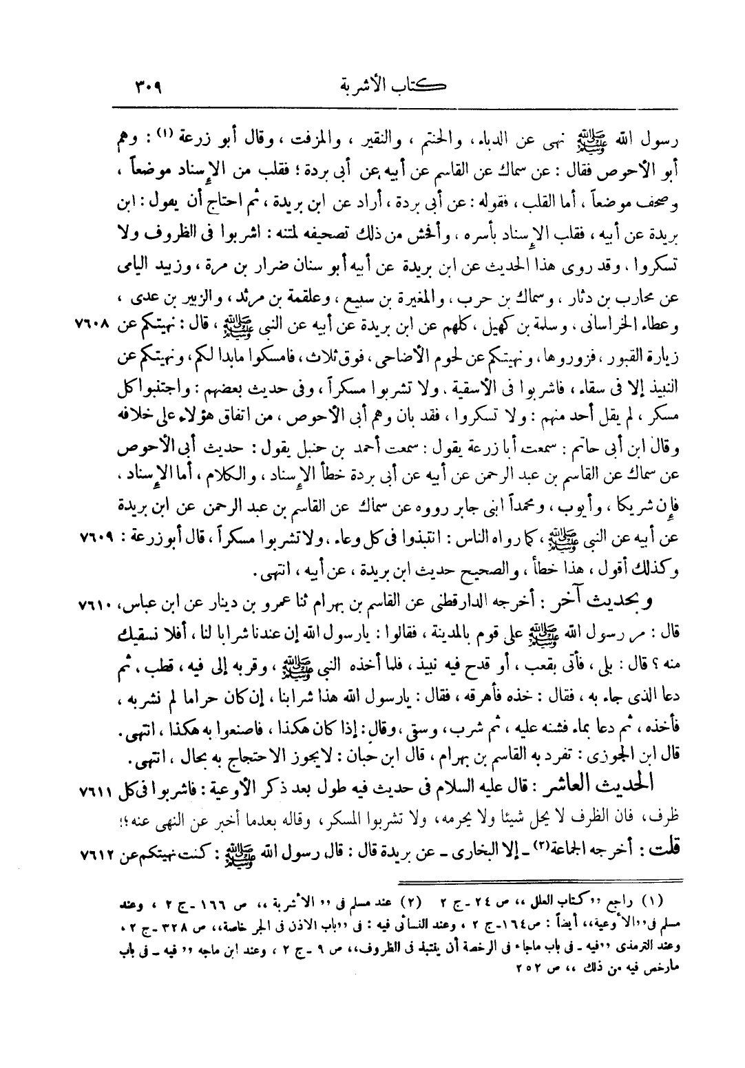 رَسُولَ اللَّهِ صَلَّى اللَّهُ عَلَيْهِ وَسَلَّمَ نهى عن الدباء، والختم، وَالنَّقِيرِ، وَالْمُزَفَّتِ، وَقَالَ أَبُو زُرْعَةَ1: وَهَمَ أَبُو الْأَحْوَصِ فَقَالَ: عَنْ سِمَاكٍ عَنْ الْقَاسِمِ عَنْ أَبِيهِ عَنْ أَبِي بُرْدَةَ، فَقَلَبَ مِنْ الْإِسْنَادِ مَوْضِعًا، وَصَحَّفَ مَوْضِعًا، أَمَّا الْقَلْبُ، فَقَوْلُهُ: عَنْ أَبِي بُرْدَةَ، أَرَادَ عَنْ ابْنِ بُرَيْدَةَ، ثُمَّ احْتَاجَ أَنْ يَقُولَ: ابْنُ بُرَيْدَةَ عَنْ أَبِيهِ، فَقَلَبَ الْإِسْنَادَ بِأَسْرِهِ، وَأَفْحَشُ مِنْ ذَلِكَ تَصْحِيفُهُ لِمَتْنِهِ: اشْرَبُوا فِي الظُّرُوفِ وَلَا تَسْكَرُوا، وَقَدْ رَوَى هَذَا الْحَدِيثَ عَنْ ابْنِ بُرَيْدَةَ عَنْ أَبِيهِ أَبُو سِنَانٍ ضِرَارُ بْنُ مُرَّةَ، وَزُبَيْدٌ الْيَامِيُّ عَنْ مُحَارِبِ بْنِ دِثَارٍ، وَسِمَاكِ بْنِ حَرْبٍ، وَالْمُغِيرَةُ بْنُ سُبَيْعٍ، وَعَلْقَمَةُ بْنُ مَرْثَدٍ، وَالزُّبَيْرُ بْنُ عَدِيٍّ، وَعَطَاءٌ الْخُرَاسَانِيُّ، وَسَلَمَةُ بْنُ كَهَيْلٍ، كُلُّهُمْ عَنْ ابْنِ بُرَيْدَةَ عَنْ أَبِيهِ عَنْ النَّبِيِّ صَلَّى اللَّهُ عَلَيْهِ وَسَلَّمَ، قَالَ: "نَهَيْتُكُمْ عَنْ زِيَارَةِ الْقُبُورِ، فَزُورُوهَا، وَنَهَيْتُكُمْ عَنْ لُحُومِ الْأَضَاحِيّ، فَوْقَ ثَلَاثٍ، فَأَمْسِكُوا مَا بَدَا لَكُمْ، وَنَهَيْتُكُمْ عَنْ النَّبِيذِ إلَّا فِي سِقَاءٍ، فَاشْرَبُوا فِي الْأَسْقِيَةِ، وَلَا تَشْرَبُوا مُسْكِرًا"، وَفِي حَدِيثِ بَعْضِهِمْ: وَاجْتَنِبُوا كُلَّ مُسْكِرٍ، لَمْ يَقُلْ أَحَدٌ مِنْهُمْ: وَلَا تَسْكَرُوا، فَقَدْ بَانَ وَهْمُ أَبِي الْأَحْوَصِ، مِنْ اتِّفَاقِ هَؤُلَاءِ عَلَى خِلَافِهِ وَقَالَ ابْنُ أَبِي حَاتِمٍ: سَمِعْتُ أَبَا زُرْعَةَ يَقُولُ: سَمِعْت أَحْمَدَ بْنَ حَنْبَلٍ يَقُولُ: حَدِيثُ أَبِي الْأَحْوَصِ عَنْ سِمَاكٍ عَنْ الْقَاسِمِ بْنِ عَبْدِ الرَّحْمَنِ عَنْ أَبِيهِ عَنْ أَبِي بُرْدَةَ خَطَأُ الْإِسْنَادِ، وَالْكَلَامِ، أَمَّا الْإِسْنَادُ، فَإِنَّ شَرِيكًا، وَأَيُّوبَ، وَمُحَمَّدًا ابْنَيْ جَابِرٍ رَوَوْهُ عَنْ سِمَاكٍ عَنْ الْقَاسِمِ بْنِ عَبْدِ الرَّحْمَنِ عَنْ ابْنِ بُرَيْدَةَ عَنْ أَبِيهِ عَنْ النَّبِيِّ صَلَّى اللَّهُ عَلَيْهِ وَسَلَّمَ، كَمَا رَوَاهُ النَّاسُ: "انْتَبِذُوا فِي كُلِّ وِعَاءٍ، وَلَا تَشْرَبُوا مُسْكِرًا"، قَالَ أَبُو زُرْعَةَ: وَكَذَلِكَ أَقُولُ: هَذَا خَطَأٌ، وَالصَّحِيحُ حَدِيثُ ابْنِ بُرَيْدَةَ، عَنْ أَبِيهِ، انْتَهَى.