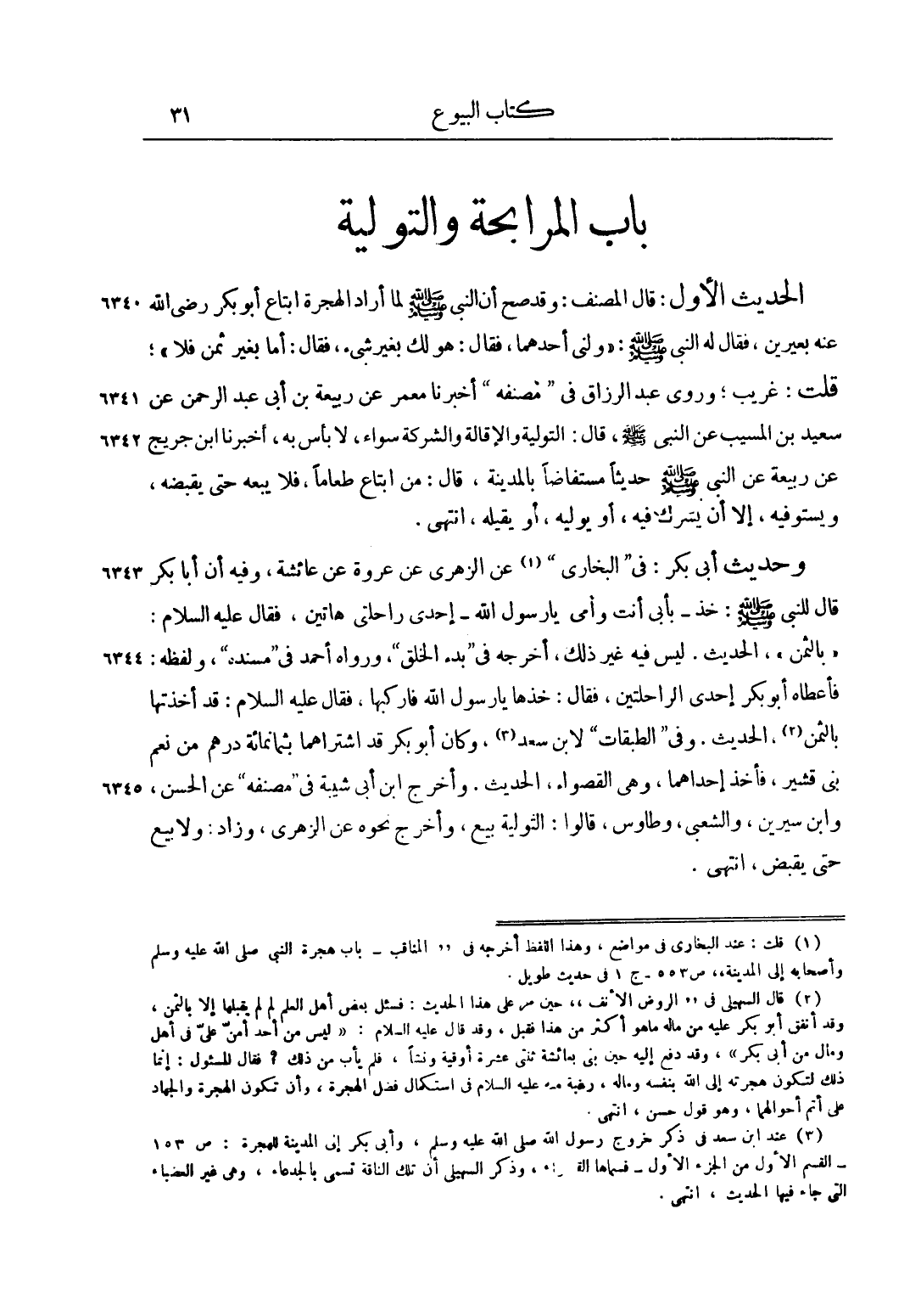وَحَدِيثُ أَبِي بَكْرٍ: فِي الْبُخَارِيِّ1 عَنْ الزُّهْرِيِّ عَنْ عُرْوَةَ عَنْ عَائِشَةَ، وَفِيهِ أَنَّ أَبَا بَكْرٍ قَالَ لِلنَّبِيِّ صَلَّى اللَّهُ عَلَيْهِ وَسَلَّمَ: خُذْ بِأَبِي أَنْتَ وَأُمِّي يَا رَسُولَ اللَّهِ إحْدَى رَاحِلَتَيَّ هَاتَيْنِ، فَقَالَ عليه السلام: "بِالثَّمَنِ"، الْحَدِيثَ. لَيْسَ فِيهِ غَيْرُ ذَلِكَ، أَخْرَجَهُ فِي بَدْءِ الْخَلْقِ، وَرَوَاهُ أَحْمَدُ فِي مُسْنَدِهِ، وَلَفْظُهُ: فَأَعْطَاهُ أَبُو بَكْرٍ إحْدَى الرَّاحِلَتَيْنِ، فَقَالَ: خُذْهَا يَا رَسُولَ اللَّهِ فَارْكَبْهَا، فَقَالَ عليه السلام: "قَدْ أَخَذْتُهَا بِالثَّمَنِ" 2 الْحَدِيثَ. وَفِي الطَّبَقَاتِ لِابْنِ سَعْدٍ3 وَكَانَ أَبُو بَكْرٍ قَدْ اشْتَرَاهُمَا بِثَمَانِمِائَةِ دِرْهَمٍ مِنْ نَعَمِ بَنِي قُشَيْرٍ، فَأَخَذَ إحْدَاهُمَا، وَهِيَ الْقَصْوَاءُ، الْحَدِيثَ. وَأَخْرَجَ ابْنُ أَبِي شَيْبَةَ فِي مُصَنَّفِهِ عَنْ الْحَسَنِ، وَابْنِ سِيرِينَ، وَالشَّعْبِيِّ، وَطَاوُسٍ، قَالُوا: التَّوْلِيَةُ بَيْعٌ، وَأَخْرَجَ نَحْوَهُ عَنْ الزُّهْرِيِّ، وَزَادَ: وَلَا بَيْعَ حَتَّى يَقْبِضَ، انْتَهَى.
