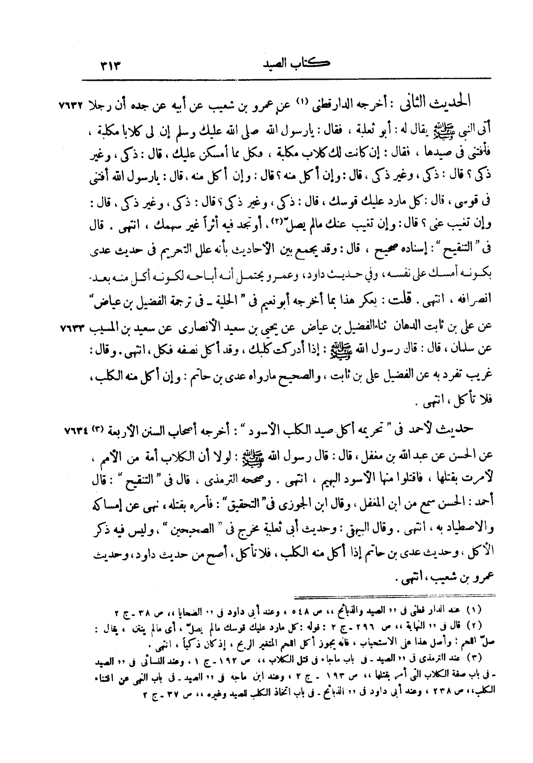 الْحَدِيثُ الثَّانِي: أَخْرَجَهُ الدَّارَقُطْنِيُّ1 عَنْ عَمْرِو بْنِ شُعَيْبٍ عَنْ أَبِيهِ عَنْ جَدِّهِ أَنَّ رَجُلًا أَتَى النَّبِيَّ صَلَّى اللَّهُ عَلَيْهِ وَسَلَّمَ يُقَالُ: لَهُ أَبُو ثَعْلَبَةَ، فَقَالَ: يَا رَسُولَ اللَّهِ صَلَّى اللَّهُ عَلَيْهِ وَسَلَّمَ إنَّ لِي كلاباً مكلبة، فأفتني ففي صَيْدِهَا، فَقَالَ: "إنْ كَانَتْ لَك كِلَابٌ مُكَلَّبَةٌ، فَكُلْ مِمَّا أَمْسَكْنَ عَلَيْك" قَالَ: ذَكِيٌّ، وَغَيْرُ ذَكِيٍّ؟ قَالَ: " ذَكِيٌّ، وَغَيْرُ ذَكِيٍّ"، قَالَ: وَإِنْ أَكَلَ مِنْهُ؟ قَالَ: "وَإِنْ أَكَلَ مِنْهُ"، قَالَ: يَا رَسُولَ اللَّهِ أَفْتِنِي فِي قَوْسِي، قَالَ: " كُلْ مَا رَدَّ عَلَيْك قَوْسُك"، قَالَ: ذَكِيٌّ، وَغَيْرُ ذَكِيٍّ؟ قَالَ: "ذَكِيٌّ، وَغَيْرُ ذَكِيٍّ"، قَالَ: وَإِنْ تَغَيَّبَ عَنِّي؟ قَالَ: "وَإِنْ تَغَيَّبَ عَنْك مَا لَمْ يَصِلْ2 أَوْ تَجِدْ فِيهِ أَثَرًا غَيْرَ سَهْمِك"، انْتَهَى. قَالَ فِي التَّنْقِيحِ: إسْنَادُهُ صَحِيحٌ، قَالَ: وَقَدْ يُجْمَعُ بَيْنَ الْأَحَادِيثِ بِأَنَّهُ عَلَّلَ التَّحْرِيمَ فِي حَدِيثِ عَدِيٍّ بِكَوْنِهِ أَمْسَكَ عَلَى نَفْسِهِ، وَفِي حَدِيثِ دَاوُد، وَعُمَرَ، وَيُحْتَمَلُ أَنَّهُ أَبَاحَهُ لِكَوْنِهِ أَكَلَ مِنْهُ بَعْدَ انْصِرَافِهِ، انْتَهَى. قُلْت: يُعَكَّرُ هَذَا بِمَا أَخْرَجَهُ أَبُو نُعَيْمٍ فِي الْحِلْيَةِ فِي تَرْجَمَةِ الْفُضَيْلِ بْنِ عِيَاضٍ عَنْ عَلِيِّ بْنِ ثَابِتٍ الدَّهَّانِ ثَنَا الْفُضَيْلُ بْنُ عِيَاضٍ عَنْ يَحْيَى بْنِ سَعِيدٍ الْأَنْصَارِيِّ عَنْ سَعِيدِ بْنِ الْمُسَيِّبِ عَنْ سَلْمَانَ، قَالَ: قَالَ رَسُولُ اللَّهِ صَلَّى اللَّهُ عَلَيْهِ وَسَلَّمَ: "إذَا أَدْرَكْت كَلْبَك، وَقَدْ أَكَلَ نِصْفَهُ فَكُلْ"، انْتَهَى. وَقَالَ: غَرِيبٌ تَفَرَّدَ بِهِ عَنْ الْفُضَيْلِ عَلِيُّ بْنُ ثَابِتٍ، وَالصَّحِيحُ مَا رَوَاهُ عَدِيُّ بْنُ حَاتِمٍ: وَإِنْ أَكَلَ مِنْهُ الْكَلْبُ، فَلَا تَأْكُلْ، انْتَهَى.