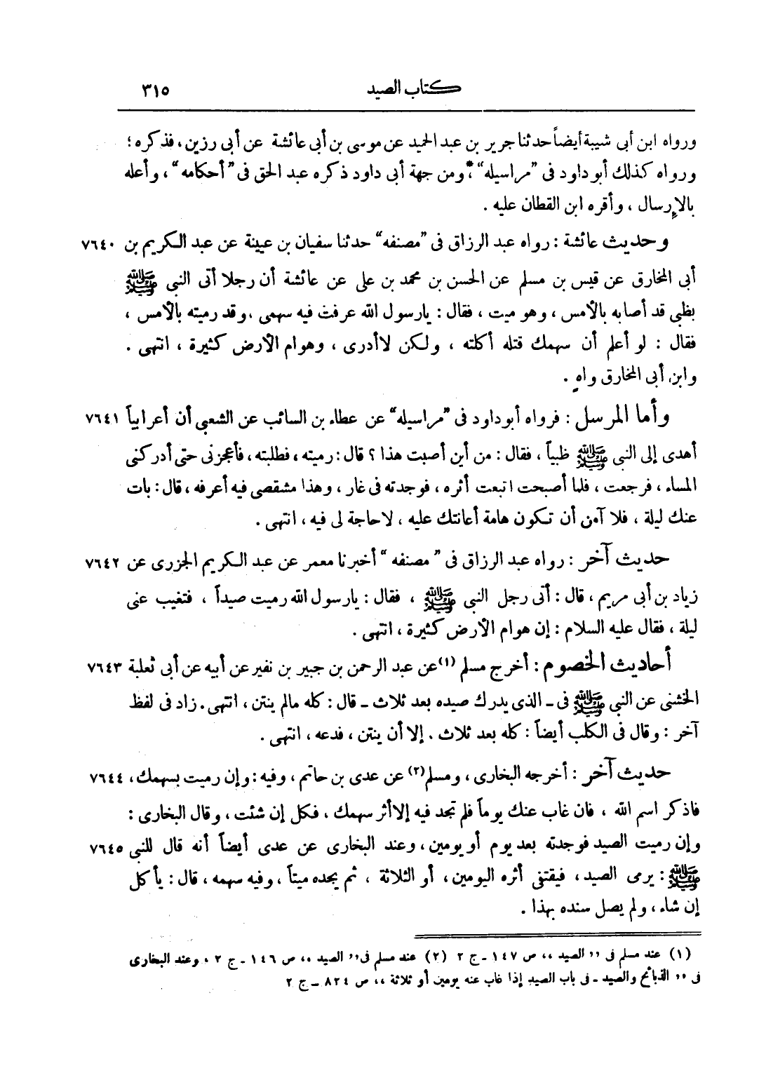 2 عند مسلم في الصيد ص 146 ج 2، وعند البخاري في الذبائح والصيد في باب الصيد إذا غاب عنه يومين أو ثلاثة ص 824 ج 2.