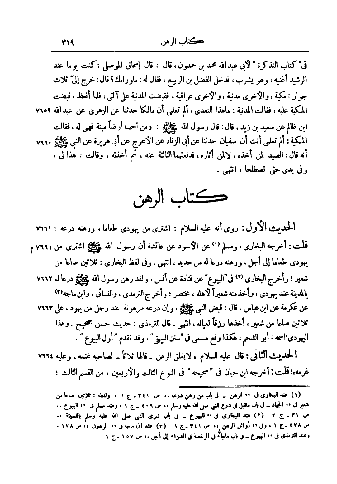 الْحَدِيثُ الْأَوَّلُ: رُوِيَ أَنَّهُ عليه السلام اشْتَرَى مِنْ يَهُودِيٍّ طَعَامًا، وَرَهَنَهُ دِرْعَهُ، قُلْت: أَخْرَجَهُ الْبُخَارِيُّ، وَمُسْلِمٌ1 عَنْ الْأَسْوَدِ عَنْ عَائِشَةَ أَنَّ رَسُولَ اللَّهِ صَلَّى اللَّهُ عَلَيْهِ وَسَلَّمَ اشْتَرَى مِنْ يَهُودِيٍّ طَعَامًا إلَى أَجَلٍ، وَرَهَنَهُ دِرْعًا لَهُ مِنْ حَدِيدٍ، انْتَهَى. وَفِي لَفْظِ الْبُخَارِيِّ: ثَلَاثِينَ صَاعًا مِنْ شَعِيرٍ، وَأَخْرَجَ الْبُخَارِيُّ2 فِي الْبُيُوعِ عَنْ قَتَادَةَ عَنْ أَنَسٍ، وَلَقَدْ رَهَنَ رَسُولُ اللَّهِ صَلَّى اللَّهُ عَلَيْهِ وَسَلَّمَ دِرْعًا لَهُ بِالْمَدِينَةِ عِنْدَ يَهُودِيٍّ، وَأَخَذَ مِنْهُ شَعِيرًا لِأَهْلِهِ، مُخْتَصَرٌ، وَأَخْرَجَ التِّرْمِذِيُّ، وَالنَّسَائِيُّ، وَابْنُ مَاجَهْ3 عَنْ عِكْرِمَةَ عَنْ ابْنِ عَبَّاسٍ: قَالَ قُبِضَ النَّبِيُّ صَلَّى اللَّهُ عَلَيْهِ وَسَلَّمَ، وَإِنَّ دِرْعَهُ مَرْهُونَةٌ عِنْدَ رَجُلٍ مِنْ يَهُودَ، عَلَى ثَلَاثِينَ صَاعًا مِنْ شَعِيرٍ، أَخَذَهَا رِزْقًا لِعِيَالِهِ، انْتَهَى. قَالَ التِّرْمِذِيُّ: حَدِيثٌ حَسَنٌ صَحِيحٌ. وَهَذَا الْيَهُودِيُّ اسْمُهُ: أَبُو الشَّحْمِ، هَكَذَا وَقَعَ مُسَمًّى فِي سُنَنِ الْبَيْهَقِيّ وَقَدْ تَقَدَّمَ أَوَّلَ الْبُيُوعِ.
