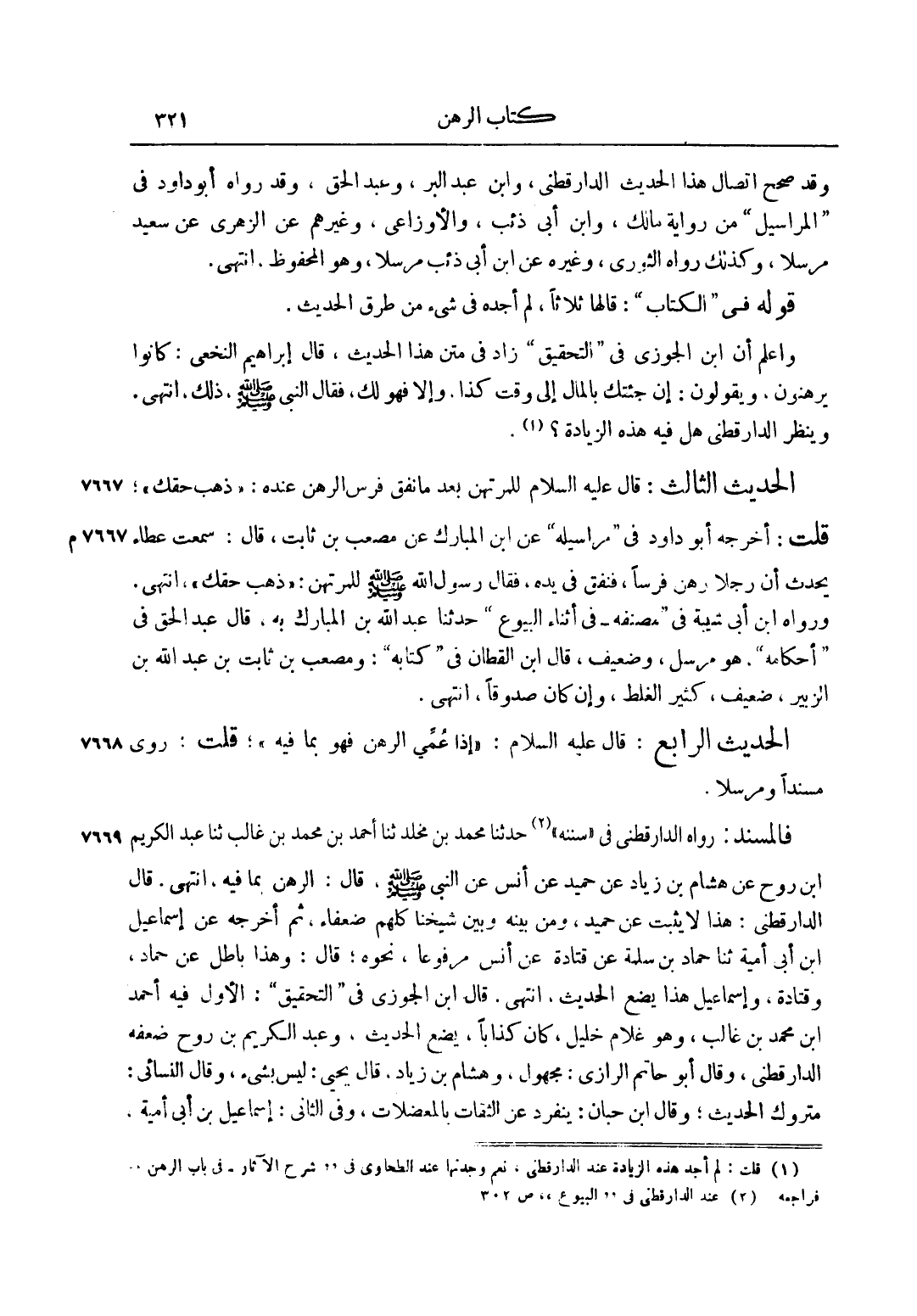 وَاعْلَمْ أَنَّ ابْنَ الْجَوْزِيِّ فِي التَّحْقِيقِ زَادَ فِي مَتْنِ هَذَا الْحَدِيثِ، قَالَ إبْرَاهِيمُ النَّخَعِيّ: كَانُوا يَرْهَنُونَ، وَيَقُولُونَ: إنْ جِئْتُك بِالْمَالِ إلَى وَقْتِ كَذَا، وَإِلَّا فَهُوَ لَك، فَقَالَ النَّبِيُّ صَلَّى اللَّهُ عَلَيْهِ وَسَلَّمَ، ذَلِكَ، انْتَهَى. وَيَنْظُرُ الدَّارَقُطْنِيُّ هَلْ فِيهِ هَذِهِ الزِّيَادَةُ؟ 1.