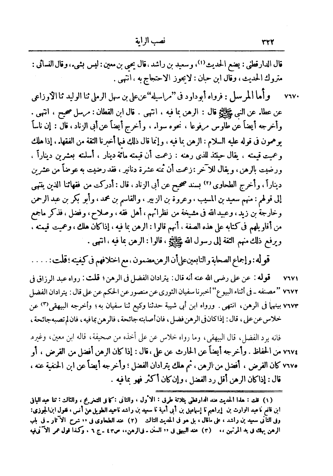 قَوْلُهُ: وَإِجْمَاعُ الصَّحَابَةِ وَالتَّابِعِينَ عَلَى أَنَّ الرَّهْنَ مَضْمُونٌ، مَعَ اخْتِلَافِهِمْ فِي كَيْفِيَّتِهِ، قُلْت: قَوْلُهُ: عَنْ عَلِيٍّ رضي الله عنه أَنَّهُ قَالَ: يَتَرَادَّانِ الْفَضْلَ فِي الرَّهْنِ، قُلْت: رَوَاهُ عَبْدُ الرَّزَّاقِ فِي مُصَنَّفِهِ فِي أَثْنَاءِ الْبُيُوعِ أَخْبَرْنَا سُفْيَانُ الثَّوْرِيُّ عَنْ مَنْصُورٍ عَنْ الْحَكَمِ عَنْ عَلِيٍّ قَالَ: يَتَرَادَّانِ الْفَضْلَ بَيْنَهُمَا فِي الرَّهْنِ، انْتَهَى. وَرَوَاهُ ابْنُ أَبِي شَيْبَةَ حَدَّثَنَا وَكِيعٌ ثَنَا سُفْيَانُ بِهِ، وَأَخْرَجَهُ الْبَيْهَقِيُّ3 عَنْ خِلَاسٍ عَنْ عَلِيٍّ، قَالَ: إذَا كَانَ فِي الرَّهْنِ فَضْلٌ، فَإِنْ أَصَابَتْهُ جَائِحَةٌ، فَالرَّهْنُ بِمَا فِيهِ، فَإِنْ لَمْ تُصِبْهُ جَائِحَةٌ، فَإِنَّهُ يُرَدُّ الْفَضْلُ، قَالَ الْبَيْهَقِيُّ: وَمَا رَوَاهُ خِلَاسٌ عَنْ عَلِيٍّ أَخَذَهُ مِنْ صَحِيفَةٍ، قَالَ ابْنُ مَعِينٍ، وَغَيْرُهُ مِنْ الْحُفَّاظِ: وَأَخْرَجَهُ أَيْضًا عَنْ الْحَارِثِ عَنْ عَلِيٍّ، قَالَ: إذَا كَانَ الرَّهْنُ أَفْضَلَ مِنْ الْقَرْضِ، أَوْ كَانَ الْقَرْضُ، أَفْضَلَ مِنْ الرَّهْنِ، ثُمَّ هَلَكَ يَتَرَادَّانِ الْفَضْلَ، وَأَخْرَجَهُ أَيْضًا عَنْ ابْنِ الْحَنَفِيَّةِ عَنْهُ، قَالَ: إذَا كَانَ الرَّهْنُ أَقَلَّ رُدَّ الْفَضْلُ، وَإِنْ كَانَ أَكْثَرَ فَهُوَ بِمَا فِيهِ.