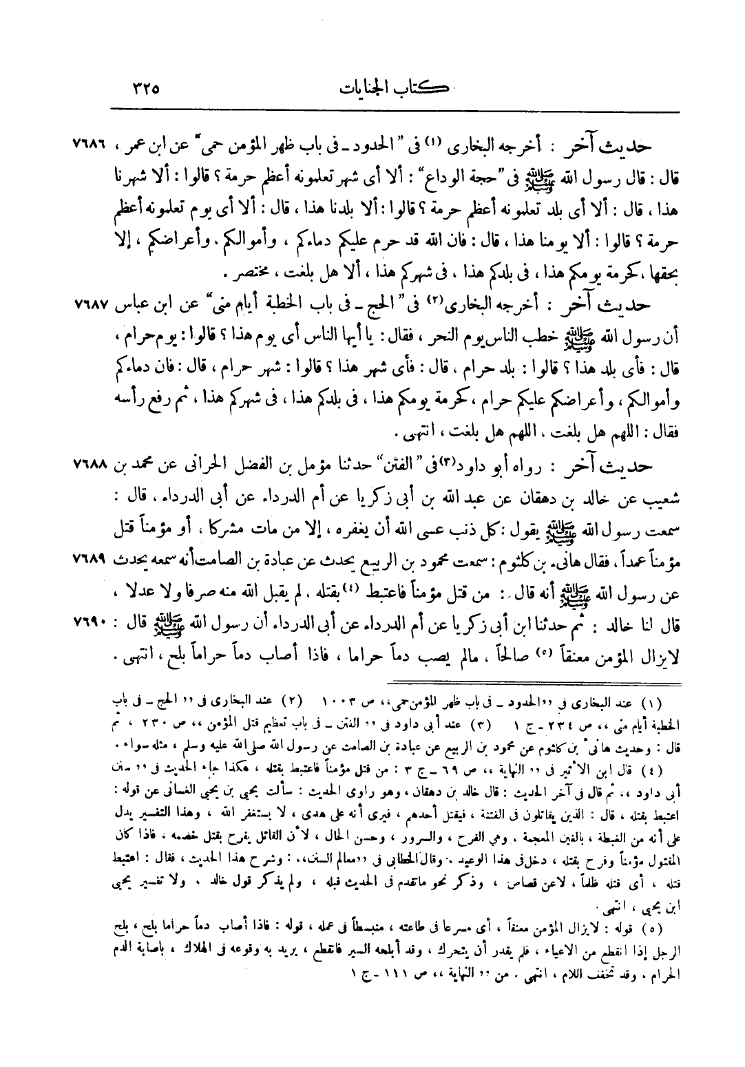 1 عند مسلم في القصاص في باب تغليظ تحريم الدماء والأعراض ص 60 ج 2، وعند البخاري في الفتن في باب قول النبي صَلَّى اللَّهُ عَلَيْهِ وَسَلَّمَ: "لا ترجعوا بعدي كفاراً" ص 1048 ج 2، وغيره.
