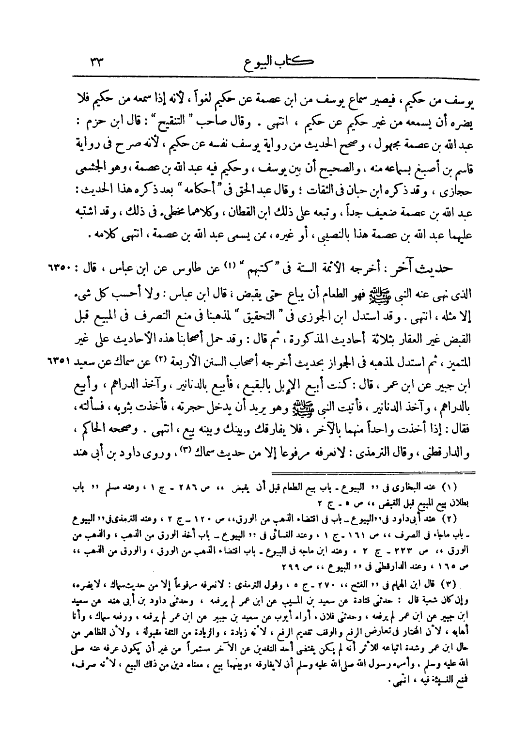 يُوسُفَ مِنْ حَكِيمٍ، فَيَصِيرُ سَمَاعُ يُوسُفَ مِنْ ابْنِ عِصْمَةَ عَنْ حَكِيمٍ لَغْوًا، لِأَنَّهُ إذَا سَمِعَهُ مِنْ حَكِيمٍ فَلَا يَضُرُّهُ أَنْ يَسْمَعَهُ مِنْ غَيْرِ حَكِيمٍ عَنْ حَكِيمٍ، انْتَهَى. وَقَالَ صَاحِبُ التَّنْقِيحِ: قَالَ ابْنُ حَزْمٍ: عَبْدُ اللَّهِ بْنُ عِصْمَةَ مَجْهُولٌ، وَصَحَّحَ الْحَدِيثَ مِنْ رِوَايَةِ يُوسُفَ نَفْسِهِ عَنْ حَكِيمٍ، لِأَنَّهُ صَرَّحَ فِي رِوَايَةِ قَاسِمِ بْنِ أَصْبَغَ بِسَمَاعِهِ مِنْهُ، وَالصَّحِيحُ أَنَّ بَيْنَ يُوسُفَ، وَحَكِيمٍ فِيهِ عَبْدَ اللَّهِ بْنَ عِصْمَةَ، وَهُوَ الْجُشَمِيُّ حِجَازِيٌّ، وَقَدْ ذَكَرَهُ ابْنُ حِبَّانَ فِي الثِّقَاتِ، وَقَالَ عَبْدُ الْحَقِّ فِي أَحْكَامِهِ بَعْدَ ذِكْرِهِ هَذَا الْحَدِيثَ: عَبْدُ اللَّهِ بْنُ عِصْمَةَ ضَعِيفٌ جِدًّا، وَتَبِعَهُ عَلَى ذَلِكَ ابْنُ الْقَطَّانِ، وَكِلَاهُمَا مُخْطِئٌ فِي ذَلِكَ، وَقَدْ اشْتَبَهَ عَلَيْهِمَا عَبْدُ اللَّهِ بْنُ عِصْمَةَ هَذَا بِالنُّصَيْبِيِّ، أَوْ غَيْرِهِ، مِمَّنْ يُسَمَّى عَبْدَ اللَّهِ بْنَ عِصْمَةَ، انْتَهَى كَلَامُهُ.