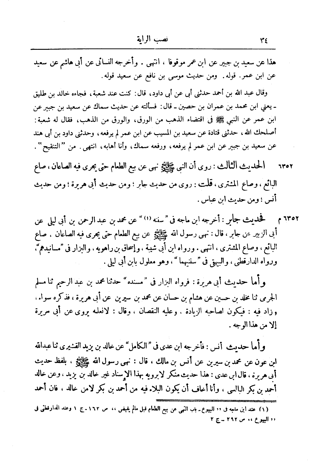 الْحَدِيثُ الثَّالِثُ: رُوِيَ أَنَّ النَّبِيَّ صَلَّى اللَّهُ عَلَيْهِ وَسَلَّمَ نَهَى عَنْ بَيْعِ الطَّعَامِ حَتَّى يَجْرِيَ فِيهِ الصَّاعَانِ، صَاعُ الْبَائِعِ، وَصَاعُ الْمُشْتَرِي، قُلْت رُوِيَ مِنْ حَدِيثِ جَابِرٍ، وَمِنْ حَدِيثِ أَبِي هُرَيْرَةَ، وَمِنْ حَدِيثِ أَنَسٍ، وَمِنْ حَدِيثِ ابْنِ عَبَّاسٍ.