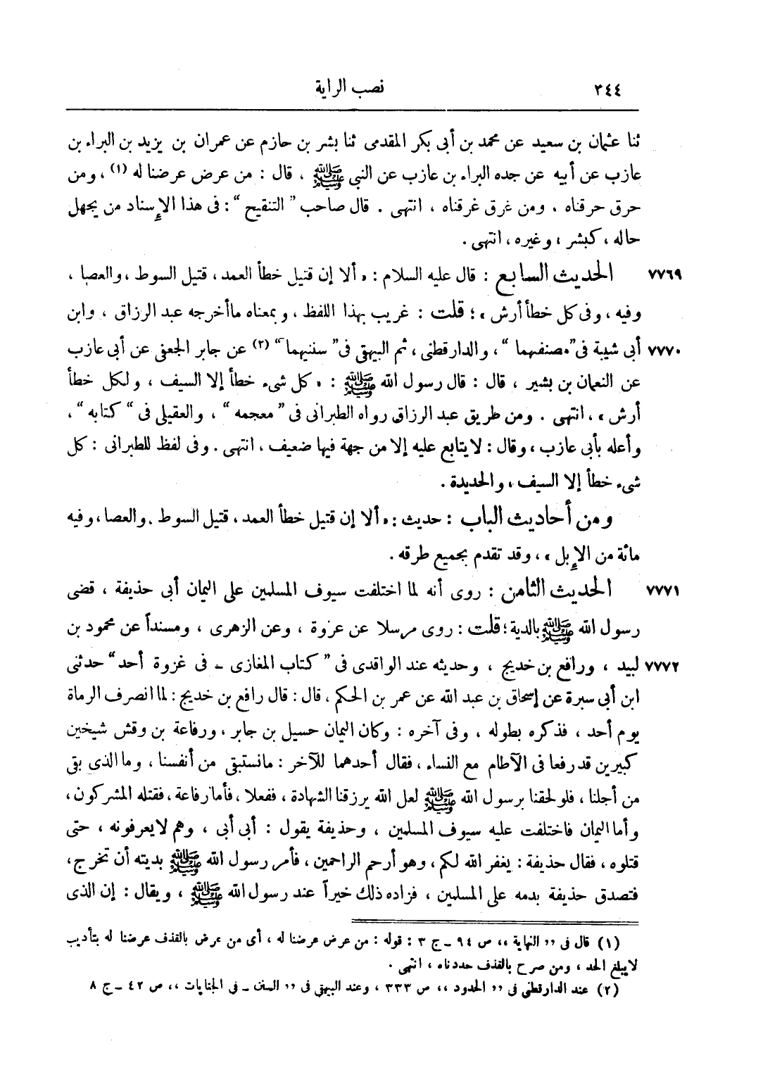 الْحَدِيثُ السَّابِعُ: قَالَ عليه السلام: "أَلَا إنَّ قَتِيلَ خَطَإِ الْعَمْدِ، قَتِيلُ السَّوْطِ، وَالْعَصَا، وَفِيهِ، وَفِي كُلِّ خَطَأٍ أَرْشٌ"، قُلْت: غَرِيبٌ بِهَذَا اللَّفْظِ، وَبِمَعْنَاهُ مَا أَخْرَجَهُ عَبْدُ الرَّزَّاقِ، وَابْنُ أَبِي شَيْبَةَ فِي مصنفهما، والدارقطني، ثُمَّ الْبَيْهَقِيُّ فِي سننيهما2 عن جابر الْجُعْفِيِّ عَنْ أَبِي عَازِبٍ عَنْ النُّعْمَانِ بْنِ بَشِيرٍ، قَالَ: قَالَ رَسُولُ اللَّهِ صَلَّى اللَّهُ عَلَيْهِ وَسَلَّمَ: "كُلُّ شَيْءٍ خَطَأٌ إلَّا السَّيْفَ، وَلِكُلِّ خَطَأٍ أَرْشٌ"، انْتَهَى. وَمِنْ طَرِيقِ عَبْدِ الرَّزَّاقِ رَوَاهُ الطَّبَرَانِيُّ فِي مُعْجَمِهِ، وَالْعُقَيْلِيُّ فِي كِتَابِهِ، وَأَعَلَّهُ بِأَبِي عَازِبٍ، وَقَالَ: لَا يُتَابَعُ عَلَيْهِ إلَّا مِنْ جِهَةٍ فِيهَا ضَعِيفٌ، انْتَهَى. وَفِي لَفْظٍ لِلطَّبَرَانِيِّ: كُلُّ شَيْءٍ خَطَأٌ إلَّا السَّيْفَ، وَالْحَدِيدَةَ.