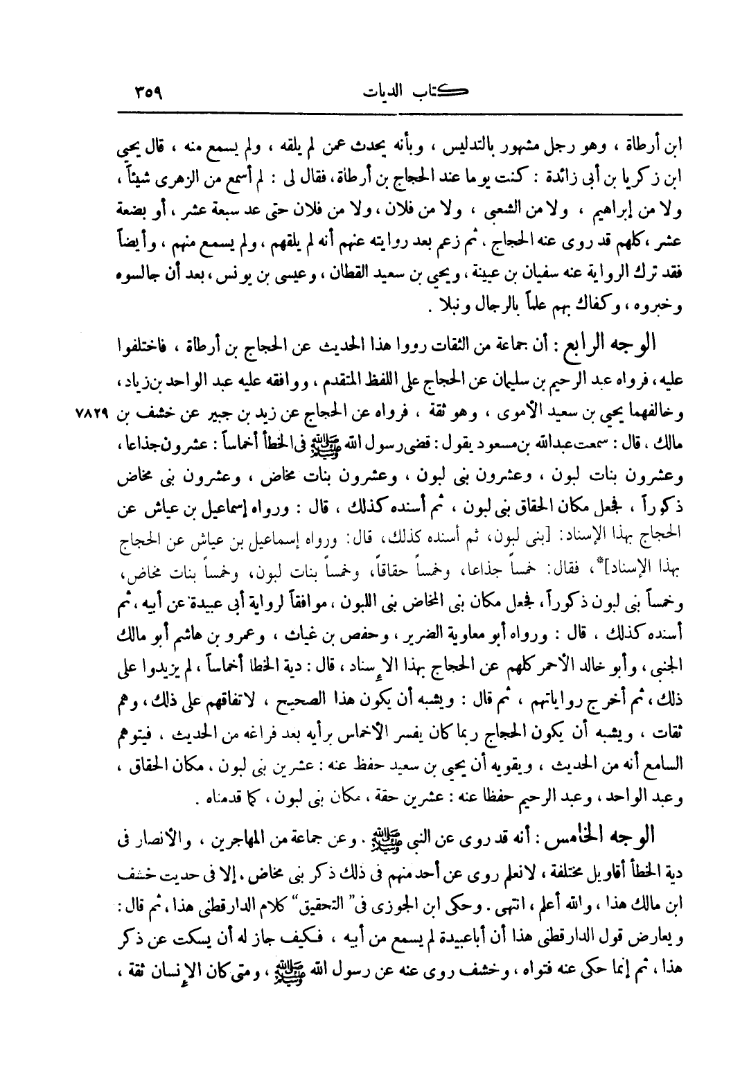 الْوَجْهُ الرَّابِعُ: أَنَّ جَمَاعَةً مِنْ الثِّقَاتِ رَوَوْا هَذَا الْحَدِيثَ عَنْ الْحَجَّاجِ بْنِ أَرْطَاةَ، فَاخْتَلَفُوا عَلَيْهِ، فَرَوَاهُ عَبْدُ الرَّحِيمِ بْنُ سُلَيْمَانَ عَنْ الْحَجَّاجِ عَلَى اللَّفْظِ الْمُتَقَدِّمِ، وَوَافَقَهُ عَلَيْهِ عَبْدُ الْوَاحِدِ بْنُ زِيَادٍ، وَخَالَفَهُمَا يَحْيَى بْنُ سَعِيدٍ الْأُمَوِيُّ، وَهُوَ ثِقَةٌ، فَرَوَاهُ عَنْ الْحَجَّاجِ عَنْ زَيْدِ بْنِ جُبَيْرٍ عَنْ خِشْفِ بْنِ مَالِكٍ، قَالَ: سَمِعْتُ عَبْدَ اللَّهِ بْنَ مَسْعُودٍ يَقُولُ: قَضَى رَسُولُ اللَّهِ صَلَّى اللَّهُ عَلَيْهِ وَسَلَّمَ فِي الْخَطَإِ أَخْمَاسًا: عِشْرُونَ جِذَاعًا، وَعِشْرُونَ بَنَاتِ لَبُونٍ، وَعِشْرُونَ بَنِي لَبُونٍ، وَعِشْرُونَ بَنَاتِ مَخَاضٍ، وَعِشْرُونَ بَنِي مَخَاضٍ ذُكُورًا، فَجَعَلَ مَكَانَ الْحِقَاقِ بَنِي لَبُونٍ، ثُمَّ أَسْنَدَهُ كَذَلِكَ، قَالَ: وَرَوَاهُ إسْمَاعِيلُ بْنُ عَيَّاشٍ عَنْ الْحَجَّاجِ بِهَذَا الْإِسْنَادِ: بَنِي لَبُونٍ، ثُمَّ أَسْنَدَهُ كَذَلِكَ، قَالَ: وَرَوَاهُ إسْمَاعِيلُ بْنُ عَيَّاشٍ عَنْ الْحَجَّاجِ بِهَذَا الْإِسْنَادِ , فَقَالَ: {خُمُسًا جِذَاعًا , خُمُسًا حِقَاقًا , وَخُمُسًا بَنَاتِ لَبُونٍ , وَخُمُسًا بَنَاتِ مَخَاضٍ , وَخُمُسًا بَنِي لَبُونٍ ذُكُورًا} , فَجَعَلَ مَكَانَ بَنِي الْمَخَاضِ بَنِي اللَّبُونِ , مُوَافِقًا لِرِوَايَةِ أَبِي عُبَيْدَةَ عَنْ أَبِيهِ , ثُمَّ أَسْنَدَهُ كَذَلِكَ , قَالَ: وَرَوَاهُ أَبُو مُعَاوِيَةَ الضَّرِيرُ، وَحَفْصُ بْنُ غِيَاثٍ، وَعَمْرُو بْنُ هَاشِمٍ أَبُو مَالِكٍ الْجَنْبِيُّ، وَأَبُو خَالِدٍ الْأَحْمَرُ كُلُّهُمْ عَنْ الْحَجَّاجِ بِهَذَا الْإِسْنَادِ، قال: دية الخطأ أخماساً لَمْ يَزِيدُوا عَلَى ذَلِكَ، ثُمَّ أَخْرَجَ رِوَايَاتِهِمْ، ثُمَّ قَالَ: وَيُشْبِهُ أَنْ يَكُونَ هَذَا الصَّحِيحَ، لِاتِّفَاقِهِمْ عَلَى ذَلِكَ، وَهُمْ ثِقَاتٌ، وَيُشْبِهُ أَنْ يَكُونَ الْحَجَّاجُ رُبَّمَا كَانَ يُفَسِّرُ الْأَخْمَاسَ بِرَأْيِهِ بَعْدَ فَرَاغِهِ مِنْ الْحَدِيثِ، فَيَتَوَهَّمُ السَّامِعُ أَنَّهُ مِنْ الْحَدِيثِ، وَيُقَوِّيهِ أَنَّ يَحْيَى بْنَ سَعِيدٍ حَفِظَ عَنْهُ: عِشْرِينَ بَنِي لَبُونٍ، مَكَانَ الْحِقَاقِ، وَعَبْدُ الْوَاحِدِ، وَعَبْدُ الرَّحِيمِ حَفِظَا عَنْهُ: عِشْرِينَ حِقَّةً، مَكَانَ بَنِي لَبُونٍ، كَمَا قَدَّمْنَاهُ.