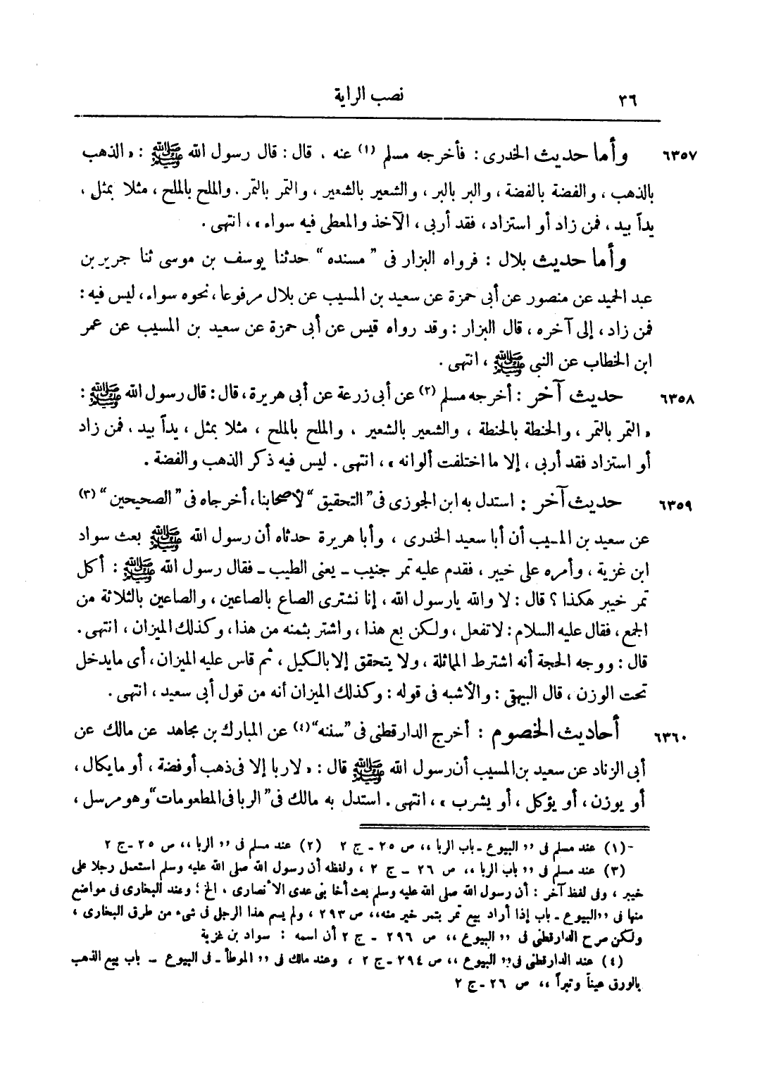 أَحَادِيثُ الْخُصُومِ: أَخْرَجَ الدَّارَقُطْنِيُّ فِي سُنَنِهِ4 عَنْ الْمُبَارَكِ بْنِ مُجَاهِدٍ عَنْ مَالِكٍ عَنْ أَبِي الزِّنَادِ عَنْ سَعِيدِ بْنِ الْمُسَيِّبِ أَنَّ رَسُولَ اللَّهِ صَلَّى اللَّهُ عَلَيْهِ وَسَلَّمَ قَالَ: "لَا رِبَا إلَّا فِي ذَهَبٍ أَوْ فِضَّةٍ، أَوْ مَا يُكَالُ، أَوْ يُوزَنُ، أَوْ يُؤْكَلُ، أَوْ يُشْرَبُ"، انْتَهَى. اسْتَدَلَّ بِهِ مَالِكٌ فِي الرِّبَا فِي الْمَطْعُومَاتِ وَهُوَ مُرْسَلٌ،