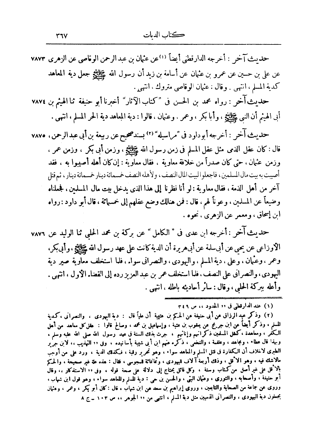 حَدِيثٌ آخَرُ: أَخْرَجَهُ أَبُو دَاوُد فِي مَرَاسِيلِهِ2 بِسَنَدٍ صَحِيحٍ عَنْ رَبِيعَةَ بْنِ أَبِي عَبْدِ الرَّحْمَنِ، قَالَ: كَانَ عَقْلُ الذِّمِّيِّ مِثْلَ عَقْلِ الْمُسْلِمِ فِي زَمَنِ رَسُولِ اللَّهِ صَلَّى اللَّهُ عَلَيْهِ وَسَلَّمَ، وَزَمَنِ أَبِي بَكْرٍ، وَزَمَنِ عُمَرَ، وَزَمَنِ عُثْمَانَ، حَتَّى كَانَ صَدْرًا مِنْ خِلَافَةِ مُعَاوِيَةَ، فَقَالَ مُعَاوِيَةُ: إنْ كَانَ أَهْلُهُ أُصِيبُوا بِهِ، فَقَدْ أُصِيبَ بِهِ بَيْتُ مَالِ الْمُسْلِمِينَ، فَاجْعَلُوا لِبَيْتِ الْمَالِ النِّصْفَ، وَلِأَهْلِهِ النِّصْفَ خَمْسَمِائَةِ دِينَارٍ، ثُمَّ قُتِلَ آخَرُ مِنْ أَهْلِ الذِّمَّةِ، فَقَالَ مُعَاوِيَةُ: لَوْ أَنَّا نَظَرْنَا إلَى هَذَا الَّذِي يَدْخُلُ بَيْتَ مَالِ الْمُسْلِمِينَ فَجَعَلْنَاهُ وَضِيعًا عَنْ الْمُسْلِمِينَ، وَعَوْنًا لَهُمْ، قَالَ: فَمِنْ هُنَالِكَ وَضَعَ عَقْلَهُمْ إلَى خَمْسِمِائَةٍ، قَالَ أَبُو دَاوُد: رَوَاهُ ابْنُ إسْحَاقَ، وَمَعْمَرٌ عَنْ الزُّهْرِيِّ، نَحْوَهُ.