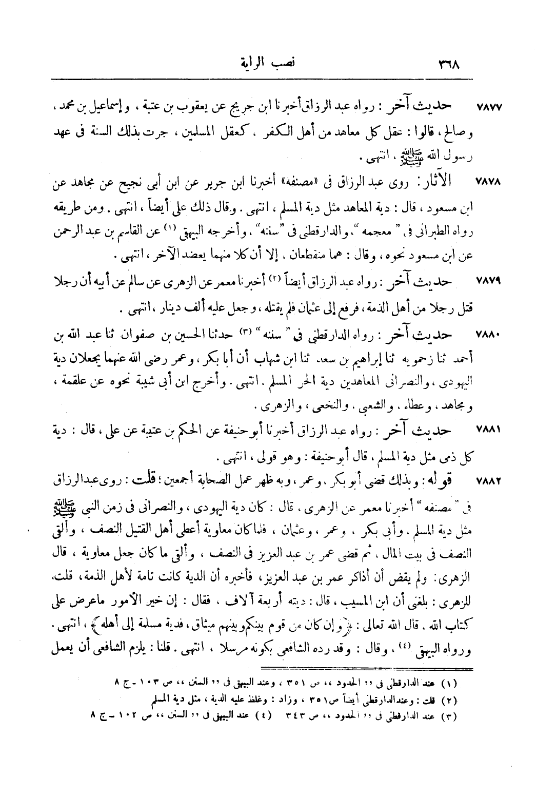 حَدِيثٌ آخَرُ: رَوَاهُ الدَّارَقُطْنِيُّ فِي سُنَنِهِ3 حَدَّثَنَا الْحُسَيْنُ بْنُ صَفْوَانَ ثَنَا عَبْدُ اللَّهِ بْنُ أَحْمَدَ ثنا زحمويه ثَنَا إبْرَاهِيمُ بْنُ سَعْدٍ ثَنَا ابْنُ شِهَابٍ أَنَّ أَبَا بَكْرٍ، وَعُمَرَ رضي الله عنهما يَجْعَلَانِ دِيَةَ الْيَهُودِيِّ، وَالنَّصْرَانِيِّ الْمُعَاهَدَيْنِ دِيَةَ الْحُرِّ الْمُسْلِمِ، انْتَهَى. وَأَخْرَجَ ابْنُ أَبِي شَيْبَهُ نَحْوَهُ عَنْ عَلْقَمَةَ، وَمُجَاهِدٍ، وَعَطَاءٍ، وَالشَّعْبِيِّ، وَالنَّخَعِيِّ، وَالزُّهْرِيِّ.