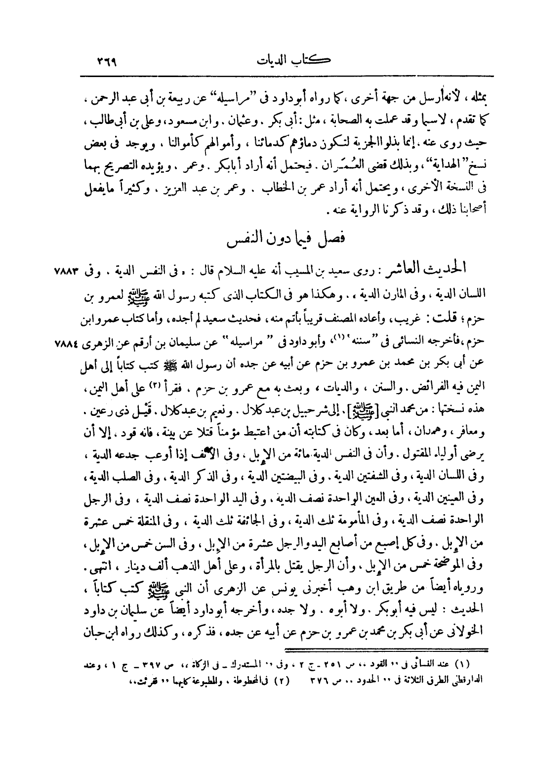 الْحَدِيثُ الْعَاشِرُ: رَوَى سَعِيدُ بْنُ الْمُسَيِّبِ أَنَّهُ عليه السلام قَالَ: " فِي النَّفْسِ الدِّيَةُ، وَفِي اللِّسَانِ الدِّيَةُ، وَفِي الْمَارِنِ الدِّيَةُ"، وَهَكَذَا هُوَ فِي الْكِتَابِ الَّذِي كَتَبَهُ رَسُولُ اللَّهِ صَلَّى اللَّهُ عَلَيْهِ وَسَلَّمَ لِعَمْرِو بْنِ حَزْمٍ، قُلْتُ: غَرِيبٌ، وَأَعَادَهُ الْمُصَنِّفُ قَرِيبًا بِأَتَمَّ مِنْهُ، فَحَدِيثُ سَعِيدٍ لَمْ أَجِدْهُ، وَأَمَّا كِتَابُ عَمْرِو بْنِ حَزْمٍ، فَأَخْرَجَهُ النَّسَائِيّ فِي سُنَنِهِ1, وَأَبُو دَاوُد فِي مَرَاسِيلِهِ عَنْ سُلَيْمَانَ بْنِ أَرْقَمَ عَنْ الزُّهْرِيِّ عَنْ أَبِي بَكْرِ بْنِ مُحَمَّدِ بْنِ حَزْمٍ عَنْ أَبِيهِ عَنْ جَدِّهِ أَنَّ رَسُولَ اللَّهِ صَلَّى اللَّهُ عَلَيْهِ وَسَلَّمَ كَتَبَ كِتَابًا إلَى أَهْلِ الْيَمَنِ فِيهِ الْفَرَائِضُ، وَالسُّنَنُ، وَالدِّيَاتُ، وَبَعَثَ بِهِ مَعَ عَمْرِو بْنِ حَزْمٍ، فَقَرَأَ2 عَلَى أَهْلِ الْيَمَنِ، هَذِهِ نُسْخَتُهَا: مِنْ مُحَمَّدٍ النَّبِيِّ [صَلَّى اللَّهُ عَلَيْهِ وَسَلَّمَ] ، إلَى شُرَحْبِيلَ بْنِ عَبْدِ كَلَالٍ، وَنُعَيْمِ بْنِ عَبْدِ كَلَالٍ، قِيلَ: ذِي رُعَيْنٍ، وَمَعَافِرَ، وَهَمْدَانَ، أَمَّا بَعْدُ، وَكَانَ فِي كِتَابَتِهِ أَنَّ مَنْ اعْتَبَطَ مُؤْمِنًا قَتْلًا عَنْ بَيِّنَةٍ، فَإِنَّهُ قَوَدٌ، إلَّا أَنْ يَرْضَى أَوْلِيَاءُ الْمَقْتُولِ، وَأَنَّ فِي النَّفْسِ الدِّيَةَ مِائَةً مِنْ الْإِبِلِ، وَفِي الْأَنْفِ إذَا أوعب جَدْعُهُ الدِّيَةُ، وَفِي اللِّسَانِ الدِّيَةُ، وَفِي الشَّفَتَيْنِ الدِّيَةُ، وَفِي الْبَيْضَتَيْنِ الدِّيَةُ، وَفِي الذَّكَرِ الدِّيَةُ، وَفِي الصُّلْبِ الدِّيَةُ، وَفِي الْعَيْنَيْنِ الدِّيَةُ، وَفِي الْعَيْنِ الْوَاحِدَةِ نِصْفُ الدِّيَةِ، وَفِي الْيَدِ الْوَاحِدَةِ نِصْفُ الدِّيَةِ، وَفِي الرِّجْلِ الْوَاحِدَةِ نِصْفُ الدِّيَةِ، وَفِي الْمَأْمُومَةِ ثُلُثُ الدِّيَةِ، وَفِي الْجَائِفَةِ ثُلُثُ الدِّيَةِ، وَفِي الْمُنَقِّلَةِ خَمْسَ عَشْرَةَ مِنْ الْإِبِلِ، وَفِي كُلِّ أُصْبُعٍ مِنْ أَصَابِعِ الْيَدِ وَالرِّجْلِ عَشَرَةٌ مِنْ الْإِبِلِ، وَفِي السِّنِّ خَمْسٌ مِنْ الْإِبِلِ، وَفِي الْمُوضِحَةِ خَمْسٌ مِنْ الْإِبِلِ، وَإِنَّ الرَّجُلَ يُقْتَلْ بِالْمَرْأَةِ، وَعَلَى أَهْلِ الذَّهَبِ أَلْفُ دِينَارٍ، انْتَهَى. وَرَوَيَاهُ أَيْضًا مِنْ طَرِيقِ ابْنِ وَهْبٍ أَخْبَرَنِي يُونُسُ عَنْ الزُّهْرِيِّ أَنَّ النَّبِيَّ صَلَّى اللَّهُ عَلَيْهِ وَسَلَّمَ كَتَبَ كِتَابًا، الْحَدِيثَ، لَيْسَ فِيهِ أَبُو بَكْرٍ، وَلَا أَبُوهُ، ولاجده، وَأَخْرَجَهُ أَبُو دَاوُد أَيْضًا عَنْ سُلَيْمَانَ بْنِ دَاوُد الْخَوْلَانِيِّ عَنْ أَبِي بَكْرِ بْنِ مُحَمَّدِ بْنِ عَمْرِو بْنِ حَزْمٍ عَنْ أَبِيهِ عَنْ جَدِّهِ، فَذَكَرَهُ، وَكَذَلِكَ رَوَاهُ ابْنُ حِبَّانَ