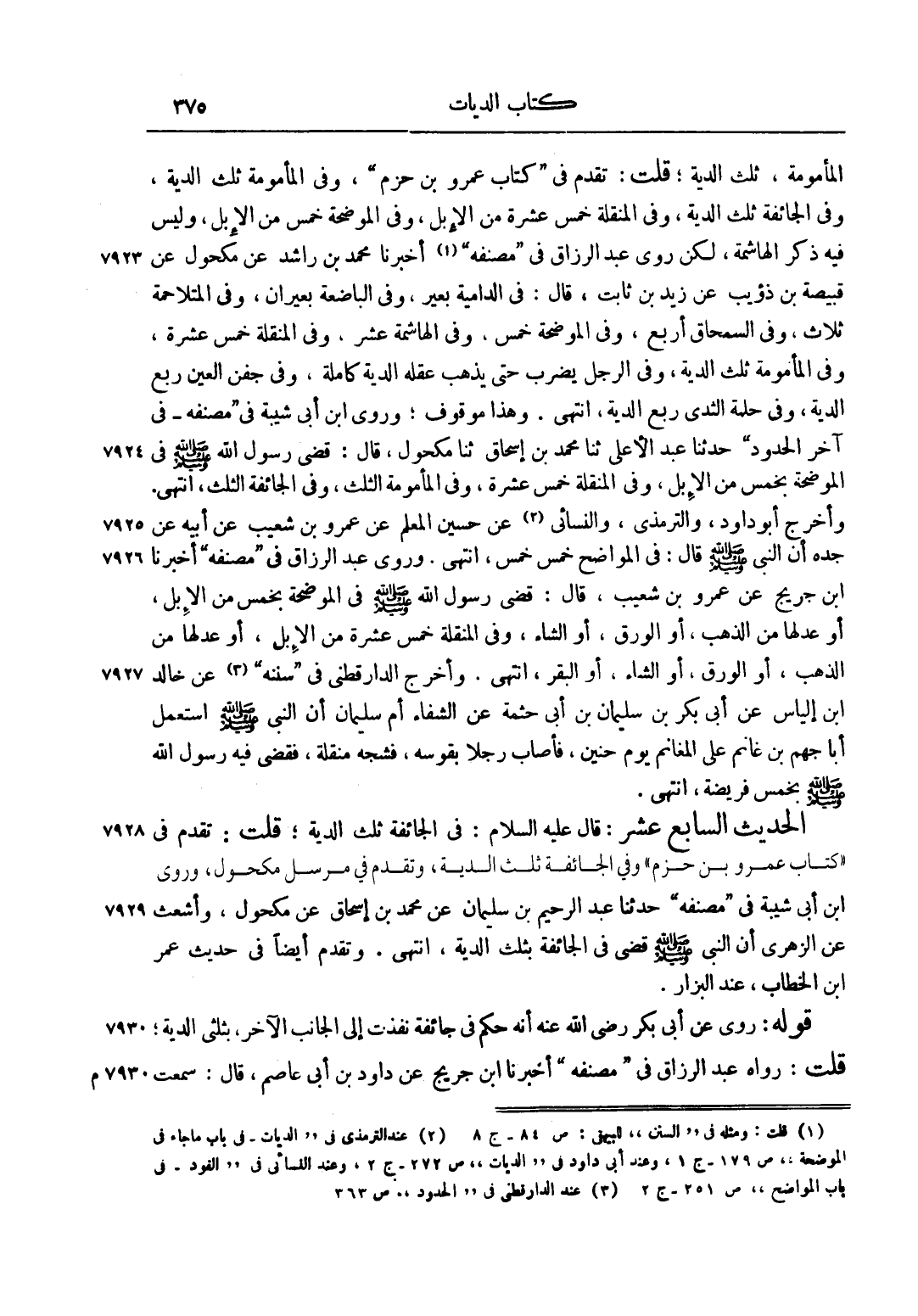 الْمَأْمُومَةِ، ثُلُثُ الدِّيَةِ"، قُلْتُ: تَقَدَّمَ فِي كِتَابِ عَمْرِو بْنِ حَزْمٍ، وَفِي الْمَأْمُومَةِ ثُلُثُ الدِّيَةِ، وَفِي الْجَائِفَةِ ثُلُثُ الدِّيَةِ، وَفِي الْمُنَقِّلَةِ خَمْسَ عَشْرَةَ مِنْ الْإِبِلِ، وَفِي الْمُوضِحَةِ خَمْسٌ مِنْ الْإِبِلِ، وَلَيْسَ فِيهِ ذِكْرُ الْهَاشِمَةِ، لَكِنْ رَوَى عَبْدُ الرَّزَّاقِ فِي مُصَنَّفِهِ1 أَخْبَرَنَا مُحَمَّدُ بْنُ رَاشِدٍ عَنْ مَكْحُولٍ عَنْ قَبِيصَةَ بْنِ ذُؤَيْبٍ عَنْ زَيْدِ بْنِ ثَابِتٍ، قَالَ: فِي الدَّامِيَةِ بَعِيرٌ، وَفِي الْبَاضِعَةِ بَعِيرَانِ، وَفِي الْمُتَلَاحِمَةِ ثَلَاثٌ، وَفِي السِّمْحَاقِ أَرْبَعٌ، وَفِي الْمُوضِحَةِ خَمْسٌ، وَفِي الْهَاشِمَةِ عَشْرٌ، وَفِي الْمُنَقِّلَةِ خَمْسَ عَشْرَةَ، وَفِي الْمَأْمُومَةِ ثُلُثُ الدِّيَةِ، وَفِي الرَّجُلِ يُضْرَبُ حَتَّى يَذْهَبَ عَقْلُهُ الدِّيَةُ كَامِلَةً، وَفِي جَفْنِ الْعَيْنِ رُبْعُ الدِّيَةِ، وَفِي حَلَمَةِ الثَّدْيِ رُبْعُ الدِّيَةِ، انْتَهَى. وَهَذَا مَوْقُوفٌ، وَرَوَى ابْنُ أَبِي شَيْبَةَ فِي مُصَنَّفِهِ فِي آخِرِ الْحُدُودِ حَدَّثَنَا عَبْدُ الْأَعْلَى ثَنَا مُحَمَّدُ بْنُ إسْحَاقَ ثَنَا مَكْحُولٌ، قَالَ: قَضَى رَسُولُ اللَّهِ صَلَّى اللَّهُ عَلَيْهِ وَسَلَّمَ فِي الْمُوضِحَةِ بِخَمْسٍ مِنْ الْإِبِلِ، وَفِي الْمُنَقِّلَةِ خَمْسَ عَشْرَةَ، وَفِي الْمَأْمُومَةِ الثُّلُثُ، وَفِي الْجَائِفَةِ الثُّلُثُ، انْتَهَى. وَأَخْرَجَ أَبُو دَاوُد، وَالتِّرْمِذِيُّ، وَالنَّسَائِيُّ2 عَنْ حُسَيْنٍ الْمُعَلِّمِ عَنْ عَمْرِو بْنِ شُعَيْبٍ عَنْ أَبِيهِ عَنْ جَدِّهِ أَنَّ النَّبِيَّ صَلَّى اللَّهُ عَلَيْهِ وَسَلَّمَ قال: "في المواضح خَمْسٌ خَمْسٌ"، انْتَهَى. وَرَوَى عَبْدُ الرَّزَّاقِ فِي مُصَنَّفِهِ أَخْبَرَنَا ابْنُ جُرَيْجٍ عَنْ عَمْرِو بْنِ شُعَيْبٍ، قَالَ: قَضَى رَسُولُ اللَّهِ صَلَّى اللَّهُ عَلَيْهِ وَسَلَّمَ فِي الْمُوضِحَةِ بِخَمْسٍ مِنْ الْإِبِلِ، أَوْ عَدْلِهَا مِنْ الذَّهَبِ، أَوْ الْوَرِقِ، أَوْ الشَّاءِ، وَفِي الْمُنَقِّلَةِ خَمْسَ عَشْرَةَ مِنْ الْإِبِلِ، أَوْ عَدْلُهَا مِنْ الذَّهَبِ، أَوْ الْوَرِقِ، أَوْ الشَّاءِ، أَوْ الْبَقَرِ، انْتَهَى. وَأَخْرَجَ الدَّارَقُطْنِيُّ فِي سُنَنِهِ3 عَنْ خَالِدِ بْنِ إلْيَاسَ عَنْ أَبِي بَكْرِ بْنِ سُلَيْمَانَ بْنِ أَبِي حَثْمَةَ عَنْ الشِّفَاءِ أُمِّ سُلَيْمَانَ أَنَّ النَّبِيَّ صَلَّى اللَّهُ عَلَيْهِ وَسَلَّمَ اسْتَعْمَلَ أَبَا جَهْمِ بْنَ غَانِمٍ يَوْمَ حُنَيْنٍ، فَأَصَابَ رَجُلًا بِقَوْسِهِ، فَشَجَّهُ مُنَقِّلَةً، فَقَضَى فِيهِ رَسُولُ اللَّهِ صَلَّى اللَّهُ عَلَيْهِ وَسَلَّمَ بِخَمْسٍ فَرِيضَةً، انْتَهَى.