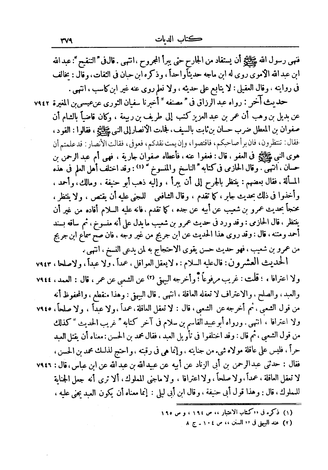 حَدِيثٌ آخَرُ: رَوَاهُ عَبْدُ الرَّزَّاقِ فِي مُصَنَّفِهِ أَخْبَرَنَا سُفْيَانُ الثَّوْرِيُّ عَنْ يَحْيَى بْنِ الْمُغِيرَةِ عَنْ بُدَيْلُ بْنِ وَهْبٍ أَنَّ عُمَرَ بْنَ عَبْدِ الْعَزِيزِ كَتَبَ إلَى طَرِيفِ بْنِ رَبِيعَةَ، وَكَانَ قَاضِيًا بِالشَّامِّ أَنَّ صَفْوَانَ بْنَ الْمُعَطِّلِ ضَرَبَ حَسَّانَ بْنَ ثَابِتٍ بِالسَّيْفِ، فَجَاءَتْ الْأَنْصَارُ إلَى النَّبِيِّ صَلَّى اللَّهُ عَلَيْهِ وَسَلَّمَ، فَقَالُوا: الْقَوَدُ، فَقَالَ: "يَنْتَظِرُ، فَإِنْ بَرَأَ صَاحِبُكُمْ، فَاقْتَصُّوا، وَإِنْ يَمُتْ نُقِدْكُمْ"، فَعُوفِيَ، فَقَالَتْ الْأَنْصَارُ: قَدْ عَلِمْتُمْ أَنَّ هَوَى النَّبِيِّ صَلَّى اللَّهُ عَلَيْهِ وَسَلَّمَ فِي الْعَفْوِ، قَالَ: فَعَفَوْا عَنْهُ، فَأَعْطَاهُ صَفْوَانُ جَارِيَةً، فَهِيَ أُمُّ عَبْدِ الرَّحْمَنِ بْنِ حَسَّانَ، انْتَهَى. وَقَالَ الْحَازِمِيُّ فِي كِتَابِهِ النَّاسِخِ وَالْمَنْسُوخِ1: وَقَدْ اخْتَلَفَ أَهْلُ الْعِلْمِ فِي هَذِهِ الْمَسْأَلَةِ، فَقَالَ بَعْضُهُمْ: يَنْتَظِرُ بِالْجُرْحِ إلَى أَنْ يَبْرَأَ، وَإِلَيْهِ ذَهَبَ أَبُو حنيقة، وَمَالِكٌ، وَأَحْمَدُ، وَأَخَذُوا فِي ذَلِكَ بِحَدِيثِ جَابِرٍ، كَمَا تَقَدَّمَ، وَقَالَ الشَّافِعِيُّ: لِلْمَجْنِيِّ عَلَيْهِ أَنْ يَقْتَصَّ، وَلَا يَنْتَظِرَ، مُحْتَجًّا بِحَدِيثِ عَمْرِو بْنِ شُعَيْبٍ عَنْ أَبِيهِ عَنْ جَدِّهِ، كَمَا تَقَدَّمَ، فَإِنَّهُ عليه السلام أَقَادَهُ مِنْ غَيْرِ أَنْ يَنْتَظِرَ، قَالَ الْحَازِمِيُّ: وَقَدْ وَرَدَ فِي حَدِيثِ عَمْرِو بْنِ شُعَيْبٍ مَا يَدُلُّ عَلَى أَنَّهُ مَنْسُوخٌ، ثُمَّ سَاقَهُ بِسَنَدِ أَحْمَدَ وَمَتْنِهِ، قَالَ: وَقَدْ رُوِيَ هَذَا الْحَدِيثُ عَنْ ابْنِ جُرَيْجٍ مِنْ غَيْرِ وَجْهٍ، فَإِنْ صَحَّ سَمَاعُ ابْنِ جُرَيْجٍ مِنْ عَمْرِو بْنِ شُعَيْبٍ، فَهُوَ حَدِيثٌ حَسَنٌ يَقْوَى الِاحْتِجَاجُ بِهِ لِمَنْ يَدَّعِي النَّسْخَ، انْتَهَى.