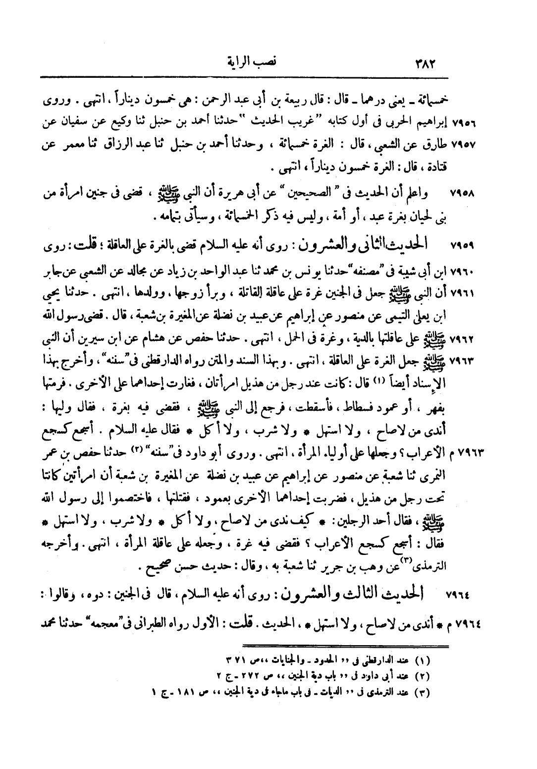 الْحَدِيثُ الثَّانِي وَالْعِشْرُونَ: رُوِيَ أَنَّهُ عليه السلام قَضَى بِالْغُرَّةِ عَلَى الْعَاقِلَةِ، قُلْت: رَوَى ابْنُ أَبِي شَيْبَةَ فِي مُصَنَّفِهِ حَدَّثَنَا يُونُسُ بْنُ مُحَمَّدٍ ثَنَا عَبْدُ الْوَاحِدِ بْنُ زِيَادٍ عَنْ مُجَالِدٍ عَنْ الشَّعْبِيِّ عَنْ جَابِرٍ أَنَّ النَّبِيَّ صَلَّى اللَّهُ عَلَيْهِ وَسَلَّمَ جَعَلَ فِي الْجَنِينِ غُرَّةً عَلَى عَاقِلَةِ الْقَاتِلَةِ، وَبَرَّأَ زَوْجَهَا، وَوَلَدَهَا، انْتَهَى. حَدَّثَنَا يَحْيَى بْنُ يَعْلَى التَّيْمِيُّ عَنْ مَنْصُورٍ عَنْ إبْرَاهِيمَ عَنْ عُبَيْدِ بْنِ نَضْلَةَ عَنْ الْمُغِيرَةِ بْنِ شُعْبَةَ، قَالَ: قَضَى رَسُولُ اللَّهِ صَلَّى اللَّهُ عَلَيْهِ وَسَلَّمَ عَلَى عَاقِلَتِهَا بِالدِّيَةِ، وَغُرَّةٍ فِي الْحَمْلِ، انْتَهَى. حَدَّثَنَا حَفْصٌ عَنْ هِشَامٍ عَنْ ابْنِ سِيرِينَ أَنَّ النَّبِيَّ صَلَّى اللَّهُ عَلَيْهِ وَسَلَّمَ جَعَلَ الْغُرَّةَ عَلَى الْعَاقِلَةِ، انْتَهَى. وَبِهَذَا السَّنَدِ وَالْمَتْنِ رَوَاهُ الدَّارَقُطْنِيُّ فِي سُنَنِهِ، وَأَخْرَجَ بِهَذَا الْإِسْنَادِ أَيْضًا1 قَالَ: كَانَتْ عِنْدَ رَجُلٍ مِنْ هُذَيْلٍ امْرَأَتَانِ، فَغَارَتْ إحْدَاهُمَا عَلَى الْأُخْرَى، فَرَمَتْهَا بِفِهْرٍ، أَوْ عَمُودِ فُسْطَاطٍ، فَأَسْقَطَتْ، فَرَجَعَ إلَى النَّبِيِّ صَلَّى اللَّهُ عَلَيْهِ وَسَلَّمَ، فَقَضَى فِيهِ بِغُرَّةٍ، فَقَالَ وَلِيُّهَا: أَنَدِي مَنْ لَا صَاحَ، وَلَا اسْتَهَلَّ وَلَا شَرِبَ، وَلَا أَكَلَ فَقَالَ عليه السلام: "أَسَجْعٌ كَسَجْعِ الْأَعْرَابِ"؟ وَجَعَلَهَا عَلَى أَوْلِيَاءِ الْمَرْأَةِ، انْتَهَى. وَرَوَى أَبُو دَاوُد فِي سُنَنِهِ2 حَدَّثَنَا حَفْصُ بْنُ عُمَرَ النَّمَرِيُّ ثَنَا شُعْبَةُ عَنْ مَنْصُورٍ عَنْ إبْرَاهِيمَ عَنْ عُبَيْدِ بْنِ نَضْلَةَ عَنْ الْمُغِيرَةِ بْنِ شُعْبَةَ أَنَّ امْرَأَتَيْنِ كَانَتَا تَحْتَ رَجُلٍ مِنْ هُذَيْلٍ، فَضَرَبَتْ إحْدَاهُمَا الْأُخْرَى بِعَمُودٍ، فَقَتَلَتْهَا، فَاخْتَصَمُوا إلَى رَسُولِ اللَّهِ صَلَّى اللَّهُ عَلَيْهِ وَسَلَّمَ فَقَالَ أَحَدُ الرَّجُلَيْنِ: كَيْفَ نَدِي مَنْ لَا صَاحَ، وَلَا أَكَلَ وَلَا شَرِبَ، وَلَا اسْتَهَلَّ فَقَالَ: "أَسَجْعٌ كَسَجْعِ الْأَعْرَابِ"؟ فَقَضَى فِيهِ غُرَّةً، وَجَعَلَهُ عَلَى عَاقِلَةِ الْمَرْأَةِ، انْتَهَى. وَأَخْرَجَهُ التِّرْمِذِيُّ3 عَنْ وَهْبِ بْنِ جَرِيرٍ ثَنَا شُعْبَةُ بِهِ، وَقَالَ: حَدِيثٌ حَسَنٌ صَحِيحٌ.