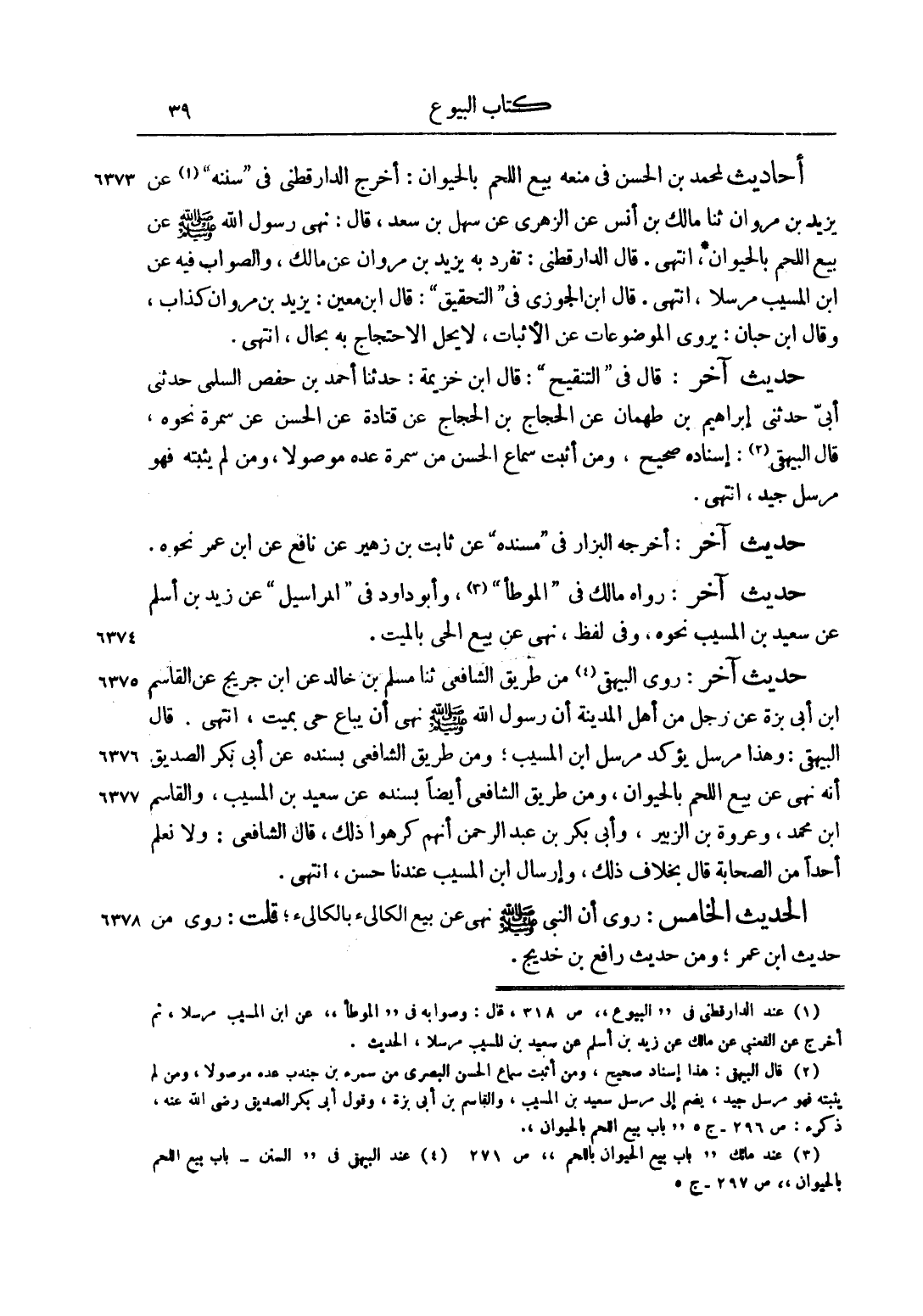 أَحَادِيثُ لِمُحَمَّدِ بْنِ الْحَسَنِ فِي مَنْعِهِ بَيْعَ اللَّحْمِ بِالْحَيَوَانِ: أَخْرَجَ الدَّارَقُطْنِيُّ فِي سُنَنِهِ1 عَنْ يَزِيدَ بْنِ مَرْوَانَ ثَنَا مَالِكُ بْنُ أَنَسٍ عَنْ الزُّهْرِيِّ عَنْ سَهْلِ بْنِ سَعْدٍ، قَالَ: نَهَى رَسُولُ اللَّهِ صَلَّى اللَّهُ عَلَيْهِ وَسَلَّمَ عَنْ بَيْعِ اللَّحْمِ بِالْحَيَوَانِ، انْتَهَى. قَالَ الدَّارَقُطْنِيُّ، تَفَرَّدَ بِهِ يَزِيدُ بْنُ مَرْوَانَ عَنْ مَالِكٍ، وَالصَّوَابُ فِيهِ عَنْ ابْنِ الْمُسَيِّبِ مُرْسَلًا، انْتَهَى. قَالَ ابْنُ الْجَوْزِيِّ فِي التَّحْقِيقِ: قَالَ ابْنُ مَعِينٍ: يَزِيدُ بْنُ مَرْوَانَ كَذَّابٌ، وَقَالَ ابْنُ حِبَّانَ: يَرْوِي الْمَوْضُوعَاتِ عَنْ الْأَثْبَاتِ، لَا يَحِلُّ الِاحْتِجَاجُ بِهِ بِحَالٍ، انْتَهَى.