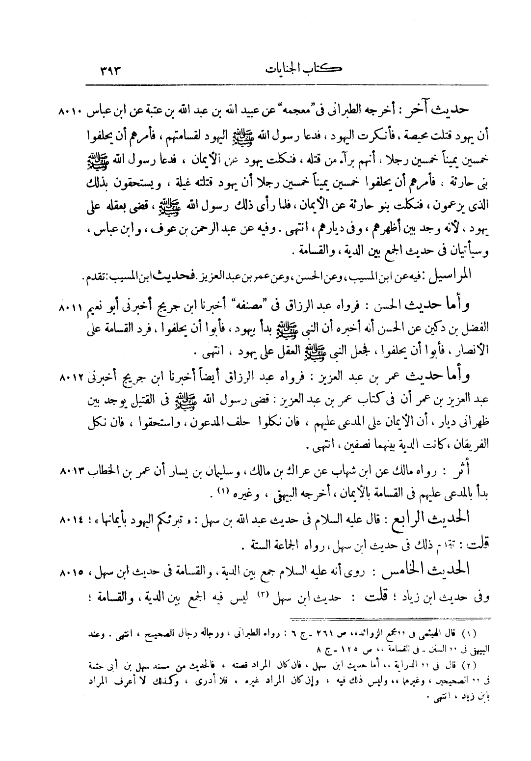 حَدِيثٌ آخَرُ: أَخْرَجَهُ الطَّبَرَانِيُّ فِي مُعْجَمِهِ عَنْ عُبَيْدِ اللَّهِ بْنِ عَبْدِ اللَّهِ بْنِ عُتْبَةَ عَنْ ابْنِ عَبَّاسٍ أَنَّ يَهُودَ قَتَلَتْ مُحَيِّصَةُ، فَدَعَا رَسُولُ اللَّهِ صَلَّى اللَّهُ عَلَيْهِ وَسَلَّمَ الْيَهُودَ لِقَسَامَتِهِمْ، فَأَمَرَهُمْ أَنْ يَحْلِفُوا خَمْسِينَ يَمِينًا خَمْسِينَ رَجُلًا، أَنَّهُمْ بُرَآءُ مِنْ قَتْلِهِ، فَنَكَلَتْ يَهُودُ عَنْ الْأَيْمَانِ، فَدَعَا رَسُولُ اللَّهِ صَلَّى اللَّهُ عَلَيْهِ وَسَلَّمَ بَنِي حَارِثَةَ، فَأَمَرَهُمْ أَنْ يَحْلِفُوا خَمْسِينَ يَمِينًا خَمْسِينَ رَجُلًا أَنَّ يَهُودَ قَتَلَتْهُ غِيلَةً، وَيَسْتَحِقُّونَ بِذَلِكَ الَّذِي يَزْعُمُونَ، فَنَكَلَتْ بَنُو حَارِثَةَ عَنْ الْأَيْمَانِ، فَلَمَّا رَأَى ذَلِكَ رَسُولُ اللَّهِ صَلَّى اللَّهُ عَلَيْهِ وَسَلَّمَ، قَضَى بِعَقْلِهِ عَلَى يَهُودَ، لِأَنَّهُ وُجِدَ بَيْنَ أَظْهُرِهِمْ، وَفِي دِيَارِهِمْ، انْتَهَى. وَفِيهِ عَنْ عَبْدِ الرَّحْمَنِ بْنِ عَوْفٍ، وَابْنِ عَبَّاسٍ، وَسَيَأْتِيَانِ فِي حَدِيثِ الْجَمْعِ بَيْنَ الدِّيَةِ، وَالْقَسَامَةِ.