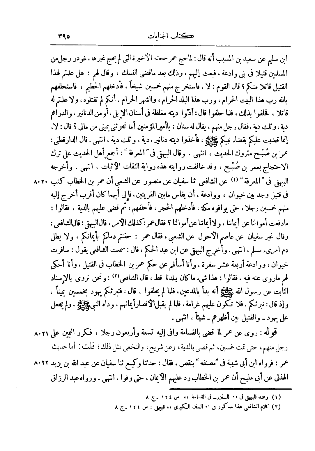 بْنِ سُلَيْمٍ عَنْ سَعِيدِ بْنِ الْمُسَيِّبِ أَنَّهُ قَالَ: لَمَّا حَجَّ عُمَرُ حَجَّتَهُ الْأَخِيرَةَ الَّتِي لَمْ يَحُجَّ غَيْرَهَا، غُودِرَ رَجُلٌ مِنْ الْمُسْلِمِينَ قَتِيلًا فِي بَنِي وَادِعَةَ، فبعث إليهم، وذلك بعد ما قَضَى النُّسُكَ وَقَالَ لَهُمْ: هَلْ عَلِمْتُمْ لِهَذَا الْقَتِيلِ قَاتِلًا مِنْكُمْ؟ قَالَ الْقَوْمُ: لَا، فَاسْتَخْرَجَ مِنْهُمْ خَمْسِينَ شَيْخًا، فَأَدْخَلَهُمْ الْحَطِيمَ، فَاسْتَحْلَفَهُمْ بِاَللَّهِ رَبِّ هَذَا الْبَيْتِ الْحَرَامِ، وَرَبِّ هَذَا الْبَلَدِ الْحَرَامِ، وَالشَّهْرِ الْحَرَامِ، أَنَّكُمْ لَمْ تَقْتُلُوهُ، وَلَا عَلِمْتُمْ لَهُ قَاتِلًا، فَحَلَفُوا بِذَلِكَ، فَلَمَّا حَلَفُوا قَالَ: أَدُّوا دِيَتَهُ مُغَلَّظَةً فِي أَسْنَانِ الْإِبِلِ، أَوْ مِنْ الدَّنَانِيرِ، وَالدَّرَاهِمِ دِيَةٌ، وَثُلُثُ دِيَةٍ، فَقَالَ رَجُلٌ مِنْهُمْ، يُقَالُ لَهُ سِنَانٌ: يَا أَمِيرَ الْمُؤْمِنِينَ أَمَا تُجْزِئُنِي يَمِينِي مِنْ مَالِي؟ قَالَ: لَا، إنَّمَا قَضَيْتُ عَلَيْكُمْ بِقَضَاءِ نَبِيِّكُمْ صَلَّى اللَّهُ عَلَيْهِ وَسَلَّمَ، فَأَخَذُوا دِيَتَهُ دَنَانِيرَ، وَثُلُثُ دِيَةٍ، انْتَهَى. قَالَ الدَّارَقُطْنِيُّ: عُمَرُ بْنُ صُبَيْحٍ مَتْرُوكُ الْحَدِيثِ، انْتَهَى. وَقَالَ الْبَيْهَقِيُّ فِي الْمَعْرِفَةِ: أَجْمَعَ أَهْلُ الْحَدِيثِ عَلَى تَرْكِ الِاحْتِجَاجِ بِعُمَرَ بْنِ صُبَيْحٍ، وَقَدْ خَالَفَتْ رِوَايَتُهُ هَذِهِ رِوَايَةَ الثِّقَاتِ الْأَثْبَاتِ، انْتَهَى. وَأَخْرَجَهُ الْبَيْهَقِيُّ فِي الْمَعْرِفَةِ1 عَنْ الشَّافِعِيِّ ثَنَا سُفْيَانُ عَنْ مَنْصُورٍ عَنْ الشَّعْبِيِّ أَنَّ عُمَرَ بْنَ الْخَطَّابِ كَتَبَ فِي قَتِيلٍ وُجِدَ بين خيوان، ووداعة، أَنْ يُقَاسَ مَا بَيْنَ الْقَرْيَتَيْنِ، فَإِلَى أَيِّهِمَا كَانَ أَقْرَبَ أَخْرَجَ إلَيْهِ مِنْهُمْ خَمْسِينَ رَجُلًا، حَتَّى يُوَافُوهُ مَكَّةَ، فَأَدْخَلَهُمْ الْحِجْرَ، فَأَحْلَفَهُمْ، ثُمَّ قَضَى عَلَيْهِمْ بِالدِّيَةِ، فَقَالُوا: مَا دَفَعَتْ أَمْوَالُنَا عَنْ أَيْمَانِنَا، وَلَا أَيْمَانُنَا عَنْ أَمْوَالِنَا؟ فَقَالَ عُمَرُ: كَذَلِكَ الْأَمْرُ، قَالَ الْبَيْهَقِيُّ: قَالَ الشَّافِعِيُّ: وَقَالَ غَيْرُ سُفْيَانَ عَنْ عَاصِمٍ الْأَحْوَلِ عَنْ الشَّعْبِيِّ، فَقَالَ عُمَرُ: حَقَنْتُمْ دِمَاءَكُمْ بِأَيْمَانِكُمْ، وَلَا يُطَلُّ دَمُ امْرِئٍ مُسْلِمٍ، انْتَهَى. وَأَخْرَجَ الْبَيْهَقِيُّ عَنْ ابْنِ عَبْدِ الْحَكَمِ، قَالَ: سَمِعْت الشَّافِعِيَّ يَقُولُ: سَافَرْتُ خيوان، ووداعة أربعة عشر سَفْرَةً، وَأَنَا أَسْأَلُهُمْ عَنْ حُكْمِ عُمَرَ بْنِ الْخَطَّابِ فِي الْقَتِيلِ، وَأَنَا أَحْكِي لَهُمْ مَا رُوِيَ عَنْهُ فِيهِ، فَقَالُوا: هَذَا شَيْءٌ مَا كَانَ بِبَلَدِنَا قَطُّ، قَالَ الشَّافِعِيُّ2 وَنَحْنُ نَرْوِي بِالْإِسْنَادِ الثَّابِتِ عَنْ رَسُولِ اللَّهِ صَلَّى اللَّهُ عَلَيْهِ وَسَلَّمَ أَنَّهُ بَدَأَ بِالْمُدَّعِينَ، فَلَمَّا لَمْ يَحْلِفُوا، قَالَ: "فَتُبْرِئُكُمْ يَهُودُ بِخَمْسِينَ يَمِينًا"، وَإِذْ قَالَ: تُبْرِئُكُمْ فَلَا تَكُونُ عَلَيْهِمْ غَرَامَةٌ، فَلَمَّا لَمْ يَقْبَلْ الْأَنْصَارَ أَيْمَانَهُمْ، وَدَاهُ النَّبِيُّ صَلَّى اللَّهُ عَلَيْهِ وَسَلَّمَ، وَلَمْ يَجْعَلْ عَلَى يَهُودَ وَالْقَتِيلُ بَيْنَ أَظْهُرِهِمْ شَيْئًا، انْتَهَى.