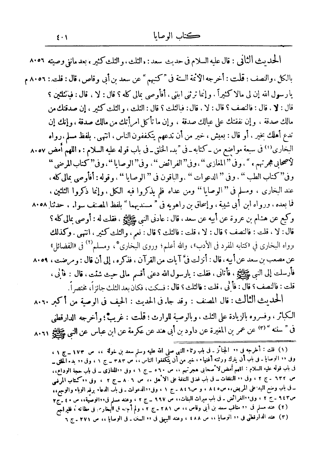 الْحَدِيثُ الثَّانِي: قَالَ عليه السلام فِي حَدِيثِ سَعْدٍ: "الثُّلُثُ، وَالثُّلُثُ كَثِيرٌ" , بَعْدَ مَا نَفَى وَصِيَّتَهُ بِالْكُلِّ، وَالنِّصْفِ، قُلْت: أَخْرَجَهُ الْأَئِمَّةُ السِّتَّةُ فِي كُتُبِهِمْ عَنْ سَعْدِ بْنِ أَبِي وَقَّاصٍ، قَالَ: قُلْت: يَا رَسُولَ اللَّهِ إنَّ لِي مَالًا كَثِيرًا، وَإِنَّمَا تَرِثُنِي ابْنَتِي، أَفَأُوصِي بِمَالِي كُلِّهِ؟ قَالَ: "لَا"، قَالَ: فَبِالثُّلُثَيْنِ؟ قَالَ: "لَا"، قَالَ: فَالنِّصْفُ؟ قَالَ: "لَا"، قَالَ: فَبِالثُّلُثِ؟ قَالَ: "الثُّلُثُ، وَالثُّلُثُ كَثِيرٌ، إنَّ صَدَقَتَك مِنْ مَالِكَ صَدَقَةٌ، وَإِنَّ نَفَقَتَك عَلَى عِيَالِك صَدَقَةٌ، وَإِنَّ مَا تَأْكُلُ امْرَأَتُك مِنْ مَالِك صَدَقَةٌ، وَإِنَّك أَنْ تَدَعَ أَهْلَك بِخَيْرٍ"، أَوْ قَالَ: "بِعَيْشٍ، خَيْرٌ مِنْ أَنْ تَدَعَهُمْ يَتَكَفَّفُونَ النَّاسَ"، انْتَهَى. بِلَفْظِ مُسْلِمٍ، رَوَاهُ الْبُخَارِيُّ1 فِي سَبْعَةِ مَوَاضِعَ مِنْ كِتَابِهِ فِي بَدْءِ الْخَلْقِ فِي بَابِ قَوْلِهِ عليه السلام: "اللَّهُمَّ أَمْضِ لِأَصْحَابِي هِجْرَتَهُمْ"، وَفِي الْمَغَازِي، وَفِي الْفَرَائِضِ وَفِي الْوَصَايَا، وَفِي كِتَابِ الْمَرْضَى وَفِي كِتَابِ الطِّبِّ، وَفِي الدَّعَوَاتِ، وَالْبَاقُونَ فِي الْوَصَايَا، وَقَوْلُهُ: أَفَأُوصِي بِمَالِي كُلِّهِ، عِنْدَ الْبُخَارِيِّ، وَمُسْلِمٍ فِي الْوَصَايَا وَمَنْ عَدَاهُ فَلَمْ يَذْكُرُوا فِيهِ الْكُلَّ، وَإِنَّمَا ذَكَرُوا الثُّلُثَيْنِ، فَمَا بَعْدَهُ، وَرَوَاهُ ابْنُ أَبِي شَيْبَةَ، وَإِسْحَاقُ بْنُ رَاهْوَيْهِ فِي مُسْنَدَيْهِمَا بِلَفْظِ الْمُصَنِّفِ سَوَاءً حَدَّثَنَا وَكِيعٌ عَنْ هِشَامِ بْنِ عُرْوَةَ عَنْ أَبِيهِ عَنْ سَعْدٍ، قَالَ: عَادَنِي النَّبِيُّ صَلَّى اللَّهُ عَلَيْهِ وَسَلَّمَ، فَقُلْت لَهُ: أُوصِي بِمَالِي كُلِّهِ؟ قَالَ: "لَا"، قُلْت: فَالنِّصْفُ؟ قَالَ: "لَا"، قُلْت: فَالثُّلُثُ؟ قَالَ: "نَعَمْ، وَالثُّلُثُ كَثِيرٌ"، انْتَهَى. وَكَذَلِكَ رَوَاهُ الْبُخَارِيُّ فِي كِتَابِهِ الْمُفْرَدِ فِي الْأَدَبِ، وَاَللَّهُ أَعْلَمُ، وَرَوَى الْبُخَارِيُّ، وَمُسْلِمٌ2 فِي الْفَضَائِلِ عَنْ مُصْعَبِ بْنِ سَعْدٍ عَنْ أَبِيهِ، قَالَ: أُنْزِلَتْ فِي آيَاتٌ مِنْ الْقُرْآنِ، فَذَكَرَهُ، إلَى أَنْ قَالَ: وَمَرِضْتُ، فَأَرْسَلْتُ إلَى النَّبِيِّ صَلَّى اللَّهُ عَلَيْهِ وَسَلَّمَ، فَأَتَانِي، فَقُلْتُ: يَا رَسُولَ اللَّهِ دَعْنِي أَقْسِمُ مَالِي حَيْثُ شِئْت، قَالَ: فَأَبَى، قُلْت: فَالنِّصْفُ؟ قَالَ: فَأَبَى، قُلْت: فَالثُّلُثُ؟ قَالَ: وَسَكَتَ، فَكَانَ بَعْدُ الثُّلُثُ جَائِزًا، مُخْتَصَرًا.