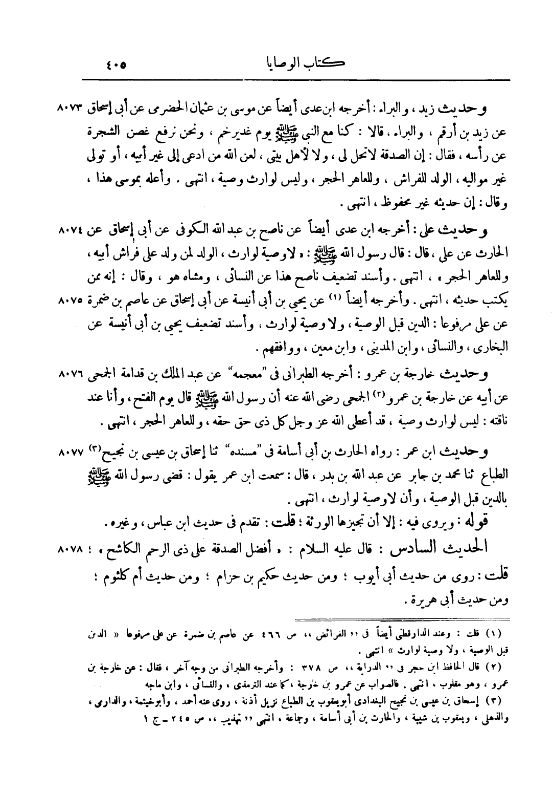 1 قلت: وعند الدارقطني أيضاً في الفرائض ص 466 عن عاصم بن ضمرة عن علي مرفوعاً "الدين قبل الوصية، ولا وصية لوارث" انتهى.