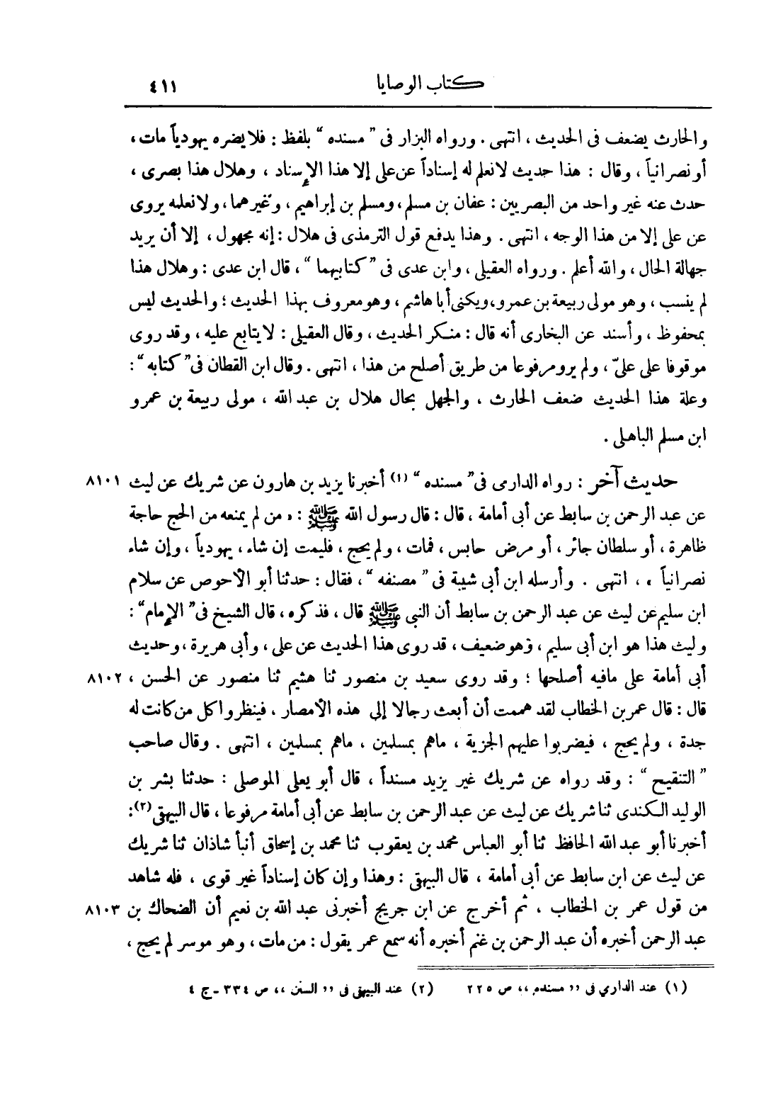 حَدِيثٌ آخَرُ: رَوَاهُ الدَّارِمِيُّ فِي مُسْنَدِهِ1 أَخْبَرَنَا يَزِيدُ بْنُ هَارُونَ عَنْ شَرِيكٍ عَنْ لَيْثٍ عَنْ عَبْدِ الرَّحْمَنِ بْنِ سَابِطٍ عَنْ أَبِي أُمَامَةَ، قَالَ: قَالَ رَسُولُ اللَّهِ صَلَّى اللَّهُ عَلَيْهِ وَسَلَّمَ: "مَنْ لَمْ يَمْنَعْهُ مِنْ الْحَجِّ حَاجَةٌ ظَاهِرَةٌ، أَوْ سُلْطَانٌ جَائِرٌ، أَوْ مَرَضٌ حَابِسٌ، فَمَاتَ، وَلَمْ يَحُجَّ، فَلْيَمُتْ إنْ شَاءَ يَهُودِيًّا، وَإِنْ شَاءَ نَصْرَانِيًّا"، انْتَهَى. وَأَرْسَلَهُ ابْنُ أَبِي شَيْبَةَ فِي مُصَنَّفِهِ، فَقَالَ: حَدَّثَنَا أَبُو الْأَحْوَصِ عَنْ سَلَّامٍ بْنِ سُلَيْمٍ عَنْ لَيْثٍ عَنْ عَبْدِ الرَّحْمَنِ بْنِ سَابِطٍ أَنَّ النَّبِيَّ صَلَّى اللَّهُ عَلَيْهِ وَسَلَّمَ قَالَ، فَذَكَرَهُ، قَالَ الشَّيْخُ فِي الْإِمَامِ: وَلَيْثٌ هَذَا هُوَ ابْنُ أَبِي سُلَيْمٍ، وَهُوَ ضَعِيفٌ، قَدْ رَوَى هَذَا الْحَدِيثَ عَنْ عَلِيٍّ، وَأَبِي هُرَيْرَةَ، وَحَدِيثُ أَبِي أُمَامَةَ عَلَى مَا فِيهِ أَصْلَحُهَا، وَقَدْ رَوَى سَعِيدُ بْنُ مَنْصُورٍ ثَنَا هُشَيْمِ ثَنَا مَنْصُورٌ عَنْ الْحَسَنِ، قَالَ: قَالَ عُمَرُ بْنُ الْخَطَّابِ لَقَدْ هَمَمْت أَنْ أَبْعَثَ رِجَالًا إلَى هَذِهِ الْأَمْصَارِ، فَيَنْظُرُوا كُلَّ مَنْ كَانَتْ لَهُ جِدَةٌ، وَلَمْ يَحُجَّ، فَيَضْرِبُوا عَلَيْهِمْ الْجِزْيَةَ، ما هم بمسلمين، ماهم بِمُسْلِمِينَ، انْتَهَى. وَقَالَ صَاحِبُ التَّنْقِيحِ: وَقَدْ رَوَاهُ عَنْ شَرِيكٍ غَيْرُ يَزِيدَ مُسْنَدًا، قَالَ أَبُو يَعْلَى الْمَوْصِلِيُّ: حَدَّثَنَا بِشْرُ بْنُ الْوَلِيدِ الْكِنْدِيُّ ثَنَا شَرِيكٌ عَنْ لَيْثٍ عَنْ عَبْدِ الرَّحْمَنِ بْنِ سَابِطٍ عَنْ أَبِي أُمَامَةَ مَرْفُوعًا، قَالَ الْبَيْهَقِيُّ2: أَخْبَرَنَا أَبُو عَبْدِ اللَّهِ الْحَافِظُ ثَنَا أَبُو الْعَبَّاسِ مُحَمَّدُ بْنُ يَعْقُوبَ ثَنَا مُحَمَّدُ بْنُ إسْحَاقَ أَنْبَأَ شَاذَانُ ثَنَا شَرِيكٌ عَنْ ليث عن سَابِطٍ عَنْ أَبِي أُمَامَةَ، قَالَ الْبَيْهَقِيُّ: وَهَذَا وَإِنْ كَانَ إسْنَادًا غَيْرَ قَوِيٍّ، فَلَهُ شَاهِدٌ مِنْ قَوْلِ عُمَرَ بْنِ الْخَطَّابِ، ثُمَّ أَخْرَجَ عَنْ ابْنِ جُرَيْجٍ أَخْبَرَنِي عَبْدُ اللَّهِ بْنُ نُعَيْمٍ أَنَّ الضَّحَّاكَ بْنَ عَبْدِ الرَّحْمَنِ أَخْبَرَهُ أَنَّ عَبْدَ الرَّحْمَنِ بْنَ غَنْمٍ أَخْبَرَهُ أَنَّهُ سَمِعَ عُمَرَ يَقُولُ: مَنْ مَاتَ، وَهُوَ مُوسِرٌ لَمْ يَحُجَّ،