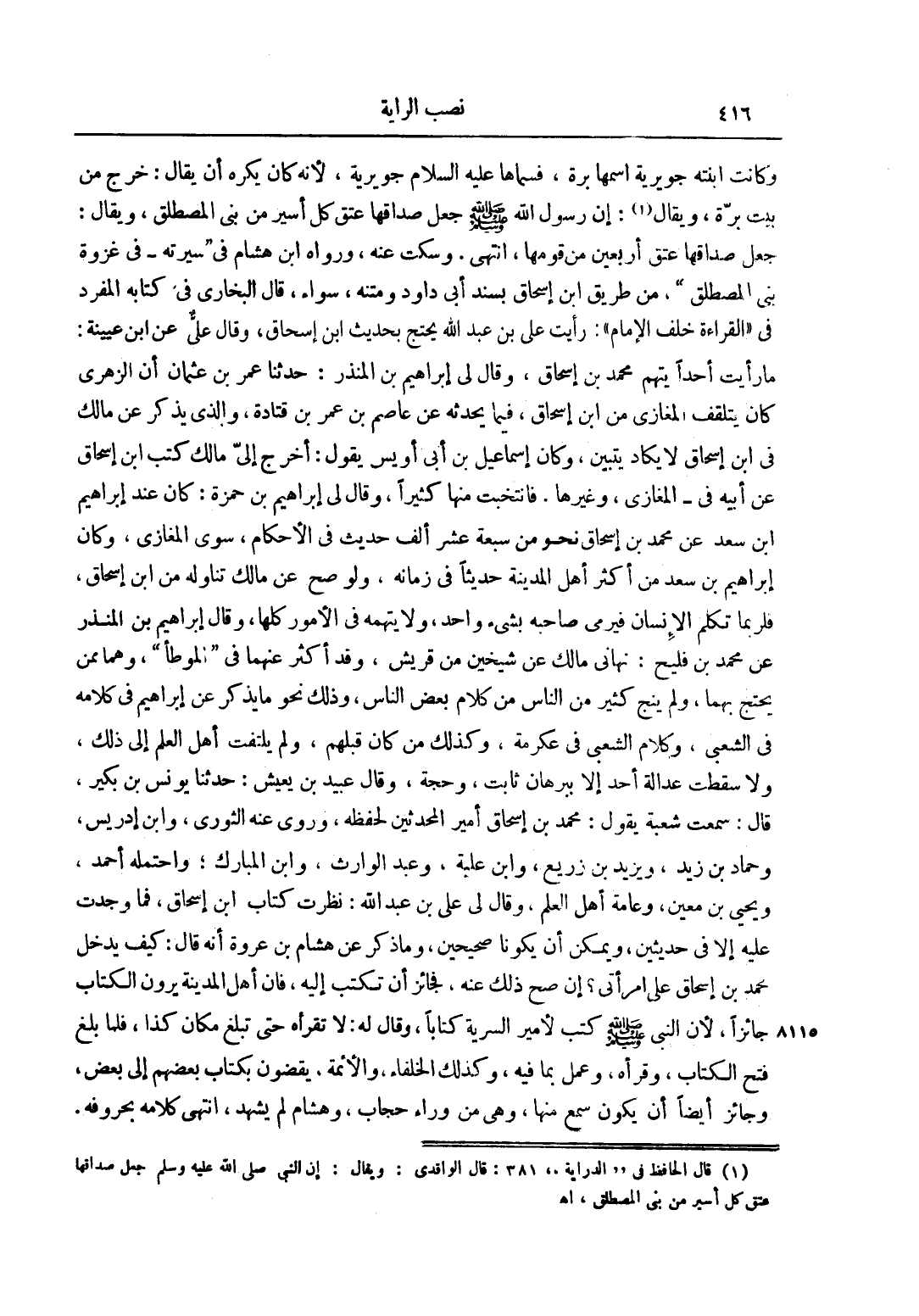 وَكَانَتْ ابْنَتُهُ جَوَيْرِيَةَ اسْمُهَا بَرَّةُ، فَسَمَّاهَا عليه السلام جُوَيْرِيَةَ، لِأَنَّهُ كَانَ يَكْرَهُ أَنْ يُقَالَ: خَرَجَ مِنْ بَيْتِ بَرَّةَ، وَيُقَالُ1 إنَّ رَسُولَ اللَّهِ صَلَّى اللَّهُ عَلَيْهِ وَسَلَّمَ جَعَلَ صَدَاقَهَا عِتْقَ كُلِّ أَسِيرٍ مِنْ بَنِي الْمُصْطَلِقِ، وَيُقَالُ: جَعَلَ صَدَاقَهَا عِتْقَ أَرْبَعِينَ مِنْ قَوْمِهَا، انْتَهَى. وَسَكَتَ عَنْهُ، وَرَوَاهُ ابْنُ هِشَامٍ فِي سِيرَتِهِ فِي غَزْوَةِ بَنِي الْمُصْطَلِقِ، مِنْ طَرِيقِ ابْنِ إسْحَاقَ بِسَنَدِ أَبِي دَاوُد وَمَتْنِهِ، سَوَاءً، قَالَ الْبُخَارِيُّ فِي كِتَابِهِ الْمُفْرَدِ فِي الْقِرَاءَةِ خَلْفَ الْإِمَامِ: رَأَيْت عَلِيَّ بْنَ عَبْدِ اللَّهِ يَحْتَجُّ بِحَدِيثِ ابْنِ إسْحَاقَ، وَقَالَ: عَلِيٌّ عَنْ ابْنِ عُيَيْنَةَ مَا رَأَيْتُ أَحَدًا يَتَّهِمُ مُحَمَّدَ بْنَ إسْحَاقَ، وَقَالَ لِي إبْرَاهِيمُ بْنُ الْمُنْذِرِ: حَدَّثَنَا عُمَرُ بْنُ عُثْمَانَ أَنَّ الزُّهْرِيَّ كَانَ يَتَلَقَّفُ الْمَغَازِيَ مِنْ ابْنِ إسْحَاقَ، فِيمَا يُحَدِّثُهُ عَنْ عَاصِمِ بْنِ عُمَرَ بْنِ قَتَادَةَ، وَاَلَّذِي يُذْكَرُ عَنْ مَالِكٍ فِي ابْنِ إسْحَاقَ لَا يَكَادُ يَتَبَيَّنُ، وَكَانَ إسْمَاعِيلُ بْنُ أَبِي أُوَيْسٍ يَقُولُ: أَخْرَجَ إلَيَّ مَالِكٌ كُتُبَ ابْنِ إسْحَاقَ عَنْ أَبِيهِ فِي الْمَغَازِي، وَغَيْرِهَا. فَانْتَخَبْتُ مِنْهَا كَثِيرًا، وَقَالَ لِي إبْرَاهِيمُ بْنُ حَمْزَةَ كَانَ عِنْدَ إبْرَاهِيمَ بْنِ سَعْدٍ عَنْ محمد بن إسحاق نحواً مِنْ سَبْعَةَ عَشَرَ أَلْفَ حَدِيثٍ فِي الْأَحْكَامِ، سِوَى الْمَغَازِي، وَكَانَ إبْرَاهِيمُ بْنُ سَعْدٍ مِنْ أَكْثَرِ أَهْلِ الْمَدِينَةِ حَدِيثًا فِي زَمَانِهِ، وَلَوْ صَحَّ عَنْ مَالِكٍ تَنَاوُلُهُ مِنْ ابْنِ إسْحَاقَ، فَلَرُبَّمَا تَكَلَّمَ الْإِنْسَانُ فَيَرْمِي صاحبه بشئ وَاحِدٍ، وَلَا يَتَّهِمُهُ فِي الْأُمُورِ كُلِّهَا، وَقَالَ إبْرَاهِيمُ بن المنذر عَنْ مُحَمَّدِ بْنِ فُلَيْحِ: نَهَانِي مَالِكٌ عَنْ شَيْخَيْنِ مِنْ قُرَيْشٍ، وَقَدْ أَكْثَرَ عَنْهُمَا فِي الْمُوَطَّإِ، وَهُمَا ممن يَحْتَجُّ بِهِمَا، وَلَمْ يَنْجُ كَثِيرٌ مِنْ النَّاسِ مِنْ كَلَامِ بَعْضِ النَّاسِ، وَذَلِكَ نَحْوُ مَا يُذْكَرُ عَنْ إبْرَاهِيمَ فِي كَلَامِهِ فِي الشَّعْبِيِّ، وَكَلَامِ الشَّعْبِيِّ فِي عِكْرِمَةَ، وَكَذَلِكَ مَنْ كَانَ قَبْلَهُمْ، وَلَمْ يَلْتَفِتْ أَهْلُ الْعِلْمِ إلَى ذَلِكَ، وَلَا سَقَطَتْ عَدَالَةُ أَحَدٍ إلَّا بِبُرْهَانٍ ثَابِتٍ، وَحُجَّةٍ، وَقَالَ عُبَيْدُ بْنُ يَعِيشَ: حَدَّثَنَا يُونُسُ بْنُ بُكَيْر، قَالَ: سَمِعْت شُعْبَةَ يَقُولُ: مُحَمَّدُ بْنُ إسْحَاقَ أَمِيرُ الْمُحَدِّثِينَ لِحِفْظِهِ، وَرَوَى عَنْهُ الثَّوْرِيُّ، وَابْنُ إدْرِيسَ، وَحَمَّادُ بْنُ زَيْدٍ، وَيَزِيدُ بْنُ زُرَيْعٍ، وَابْنُ عُلَيَّةَ، وَعَبْدُ الْوَارِثِ، وَابْنُ الْمُبَارَكِ، وَاحْتَمَلَهُ أَحْمَدُ، وَيَحْيَى بْنُ مَعِينٍ، وَعَامَّةُ أَهْلِ الْعِلْمِ، وَقَالَ لِي عَلِيُّ بْنُ عَبْدِ اللَّهِ: نَظَرْتُ كِتَابَ ابْنِ إسْحَاقَ، فَمَا وَجَدْتُ عَلَيْهِ إلَّا فِي حَدِيثَيْنِ، وَيُمْكِنُ أَنْ يَكُونَا صَحِيحَيْنِ، وَمَا ذُكِرَ عَنْ هِشَامِ بْنِ عُرْوَةَ أَنَّهُ قَالَ: كَيْفَ يَدْخُلُ مُحَمَّدُ بْنُ إسْحَاقَ عَلَى امْرَأَتِي؟ إنْ صَحَّ ذَلِكَ عَنْهُ، فَجَائِزٌ أَنْ تَكْتُبَ إلَيْهِ فَإِنَّ أَهْلَ الْمَدِينَةِ يَرَوْنَ الْكِتَابَ جَائِزًا، لِأَنَّ النَّبِيَّ صَلَّى اللَّهُ عَلَيْهِ وَسَلَّمَ كَتَبَ لِأَمِيرِ السَّرِيَّةِ كِتَابًا، وَقَالَ لَهُ: "لَا تَقْرَأْ حَتَّى تَبْلُغَ مَكَانَ كَذَا"، فَلَمَّا بَلَغَ فَتَحَ الْكِتَابَ، وَقَرَأَهُ، وَعَمِلَ بِمَا فِيهِ، وَكَذَلِكَ الْخُلَفَاءُ، وَالْ