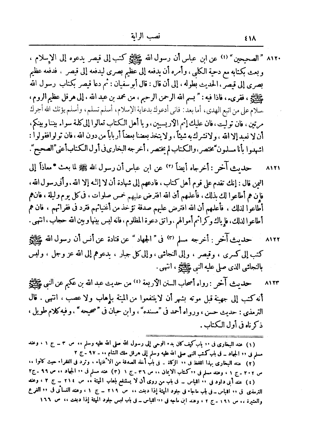 الصَّحِيحَيْنِ1 عَنْ ابْنِ عَبَّاسٍ أَنَّ رَسُولَ اللَّهِ صَلَّى اللَّهُ عَلَيْهِ وَسَلَّمَ كَتَبَ إلَى قَيْصَرَ يَدْعُوهُ إلَى الْإِسْلَامِ، وَبَعَثَ بِكِتَابِهِ مَعَ دِحْيَةَ الْكَلْبِيِّ، وَأَمَرَهُ أَنْ يَدْفَعَهُ إلَى عَظِيمِ بُصْرَى لِيَدْفَعَهُ إلَى قَيْصَرَ، فَدَفَعَهُ عَظِيمُ بُصْرَى إلَى قَيْصَرَ، الْحَدِيثُ بِطُولِهِ، إلَى أَنْ قَالَ: قَالَ أَبُو سُفْيَانَ: ثُمَّ دَعَا قَيْصَرُ بِكِتَابِ رَسُولِ اللَّهِ صَلَّى اللَّهُ عَلَيْهِ وَسَلَّمَ فَقُرِئَ، فَإِذَا فِيهِ: "بسم الله الرحمن الرحيم، مِنْ مُحَمَّدِ بْنِ عَبْدِ اللَّهِ، إلَى هِرَقْلَ عَظِيمِ الرُّومِ، سَلَامٌ عَلَى مَنْ اتَّبَعَ الْهُدَى، أَمَّا بَعْدُ فَإِنِّي أَدْعُوك بِدَاعِيَةِ اللَّهِ، أَسْلِمْ تَسْلَمْ، وَأَسْلِمْ يُؤْتِك اللَّهُ أَجْرَك مَرَّتَيْنِ، فَإِنْ تَوَلَّيْت، فإن عليك إثم الأريسين، ويا أَهْلَ الْكِتَابِ تَعَالَوْا إلَى كَلِمَةٍ سَوَاءٍ بَيْنَنَا وَبَيْنَكُمْ، أَنْ لَا نَعْبُدَ إلَّا اللَّهَ، وَلَا نُشْرِكَ بِهِ شَيْئًا، وَلَا يَتَّخِذَ بَعْضُنَا بَعْضًا أَرْبَابًا مِنْ دُونِ اللَّهِ، فَإِنْ تَوَلَّوْا فَقُولُوا: اشْهَدُوا بِأَنَّا مُسْلِمُونَ" مُخْتَصَرٌ، وَالْكِتَابُ لَمْ يُخْتَصَرْ، أَخْرَجَهُ الْبُخَارِيُّ فِي أَوَّلِ الْكِتَابِ أَعْنِي الصَّحِيحَ.