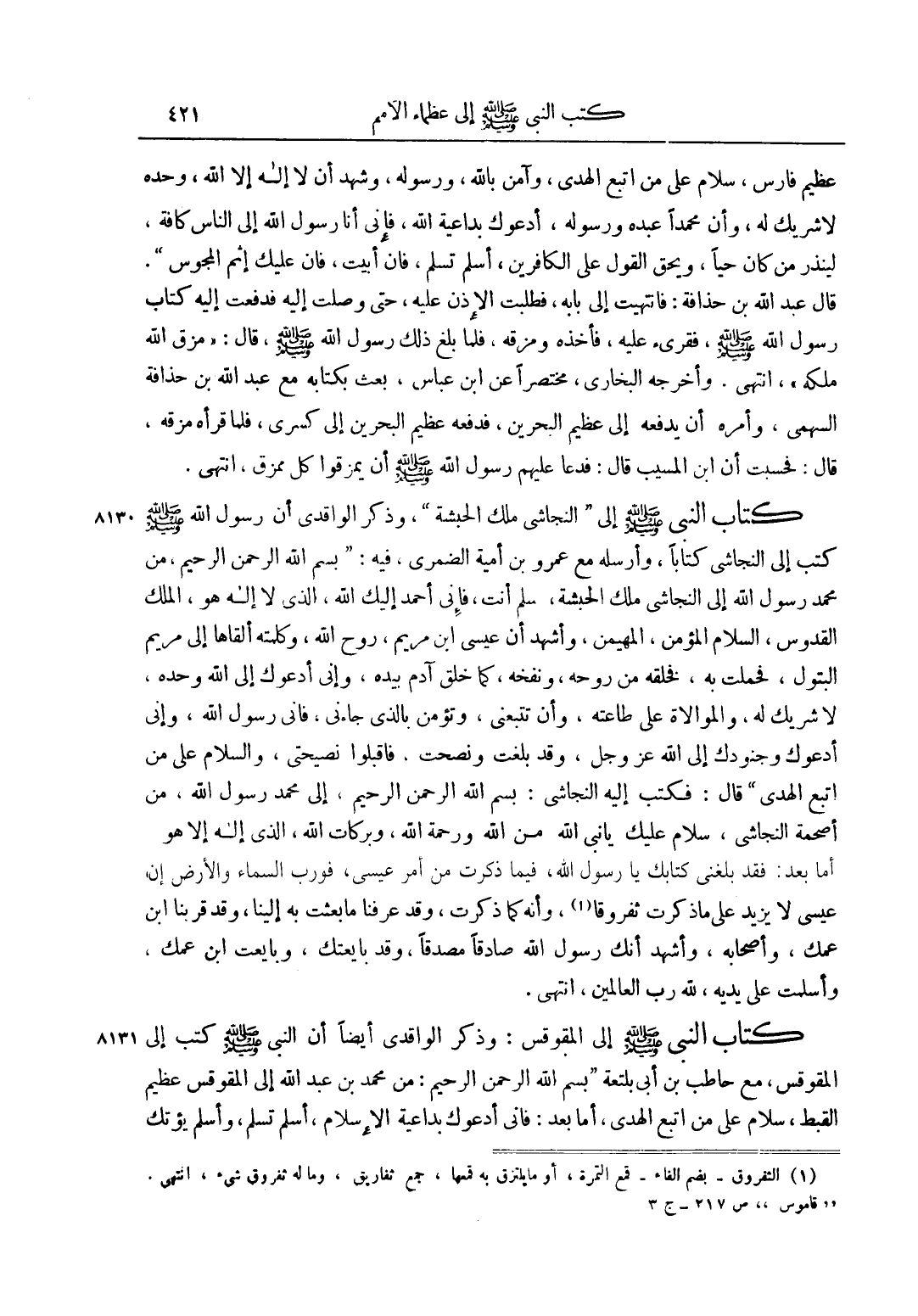 كِتَابُ النَّبِيِّ صَلَّى اللَّهُ عَلَيْهِ وَسَلَّمَ إلَى النَّجَاشِيِّ مَلِكِ الْحَبَشَةِ: وَذَكَرَ الْوَاقِدِيُّ أَنَّ رَسُولَ اللَّهِ صَلَّى اللَّهُ عَلَيْهِ وَسَلَّمَ كَتَبَ إلَى النَّجَاشِيِّ كِتَابًا، وَأَرْسَلَهُ مَعَ عَمْرِو بْنِ أُمَيَّةَ الضَّمْرِيِّ، فِيهِ: "بسم الله الرحمن الرحيم، مِنْ مُحَمَّدٍ رَسُولِ اللَّهِ إلَى النَّجَاشِيِّ مَلِكِ الْحَبَشَةِ، أَسْلِمْ أَنْتَ، فَإِنِّي أَحْمَدُ إلَيْك اللَّهَ، الَّذِي لَا إلَهَ إلَّا هُوَ، الْمَلِكَ الْقُدُّوسَ، السَّلَامَ الْمُؤْمِنَ، الْمُهَيْمِنَ، وَأَشْهَدُ أَنَّ عِيسَى ابن مريم، رروح اللَّهِ، وَكَلِمَتُهُ أَلْقَاهَا إلَى مَرْيَمَ الْبَتُولِ، فَحَمَلَتْ بِهِ، فَخَلَقَهُ مِنْ رُوحِهِ، وَنَفَخَهُ، كَمَا خَلَقَ آدَمَ بِيَدِهِ، وَإِنِّي أَدْعُوك إلَى اللَّهِ وَحْدَهُ، لَا شَرِيكَ لَهُ، والمولاة عَلَى طَاعَتِهِ، وَأَنْ تَتَّبِعَنِي، وَتُؤْمِنَ بِاَلَّذِي جَاءَنِي، فَإِنِّي رَسُولُ اللَّهِ، وَإِنِّي أَدْعُوك وَجُنُودَك إلَى اللَّهِ عَزَّ وَجَلَّ، وَقَدْ بَلَّغْتُ وَنَصَحْتُ، فَاقْبَلُوا نَصِيحَتِي، وَالسَّلَامُ عَلَى مَنْ اتَّبَعَ الْهُدَى" قَالَ: فَكَتَبَ إلَيْهِ النَّجَاشِيُّ: بسم الله الرحمن الرحيم، إلَى مُحَمَّدٍ رَسُولِ اللَّهِ، مِنْ أَصْحَمَةَ النَّجَاشِيِّ، سَلَامٌ عَلَيْك يَا نَبِيَّ اللَّهِ، مِنْ اللَّهِ وَرَحْمَةُ اللَّهِ، وَبَرَكَاتُ اللَّهِ، الَّذِي لَا إلَهَ إلَّا هُوَ، أَمَّا بَعْدُ: فَقَدْ بَلَغَنِي كِتَابُك يَا رَسُولَ اللَّهِ، فَمَا ذَكَرْتَ مِنْ أَمْرِ عِيسَى، فَوَرَبِّ السَّمَاءِ وَالْأَرْضِ إنَّ عِيسَى لَا يَزِيدُ عَلَى مَا ذَكَرْت ثُفْرُوقًا1 وَإِنَّهُ كَمَا ذَكَرْت، وَقَدْ عَرَفْنَا مَا بُعِثْتَ بِهِ إلَيْنَا، وَقَدْ قَرَّبْنَا ابْنَ عَمِّك، وَأَصْحَابَهُ، وَأَشْهَدُ أَنَّك رَسُولُ اللَّهِ صَادِقًا مُصَدَّقًا، وَقَدْ بَايَعْتُك، وَبَايَعْتُ ابْنَ عَمِّك، وَأَسْلَمْتُ على يديه، لله ررب الْعَالَمِينَ، انْتَهَى.