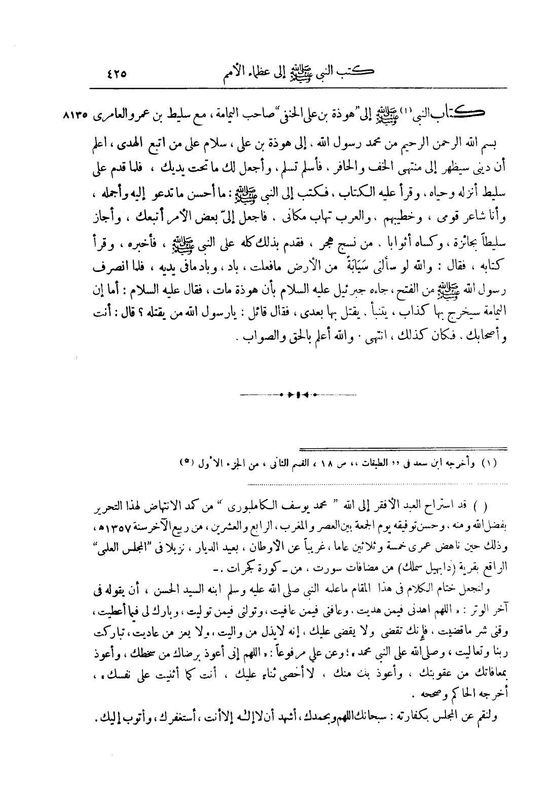 كِتَابُ النَّبِيِّ صَلَّى اللَّهُ عَلَيْهِ وَسَلَّمَ1 إلَى هَوْذَةَ بْنِ عَلِيٍّ الْحَنَفِيِّ صَاحِبِ الْيَمَامَةِ، مَعَ سَلِيطِ بْنِ عَمْرٍو الْعَامِرِيِّ "بِسْمِ اللَّهِ الرَّحْمَنِ الرَّحِيمِ مِنْ مُحَمَّدٍ رَسُولِ اللَّهِ، إلَى هَوْذَةَ بْنِ عَلِيٍّ، سَلَامٌ عَلَى مَنْ اتَّبَعَ الْهُدَى، اعْلَمْ أَنَّ دِينِي سَيَظْهَرُ إلَى مُنْتَهَى الْخُفِّ وَالْحَافِرِ، فَأَسْلِمْ تَسْلَمْ، وَأَجْعَلْ لَك مَا تَحْتَ يَدَيْك"، فَلَمَّا قَدِمَ عَلَى سَلِيطٍ أَنْزَلَهُ وَحَيَّاهُ، وَقَرَأَ عَلَيْهِ الْكِتَابَ، فَكَتَبَ إلَى النَّبِيُّ صَلَّى اللَّهُ عَلَيْهِ وَسَلَّمَ: مَا أَحْسَنَ مَا تَدْعُو إلَيْهِ وَأَجْمَلَهُ، وَأَنَا شَاعِرُ قَوْمِي، وَخَطِيبُهُمْ، وَالْعَرَبُ تَهَابُ مَكَانِي، فَاجْعَلْ إلَيَّ بَعْضَ الْأَمْرِ أَتَّبِعْك، وَأَجَازَ سَلِيطًا بِجَائِزَةٍ، وَكَسَاهُ أَثْوَابًا، مِنْ نَسْجِ هَجَرَ، فَقَدِمَ بِذَلِكَ كُلِّهِ عَلَى النَّبِيِّ صَلَّى اللَّهُ عَلَيْهِ وَسَلَّمَ، فَأَخْبَرَهُ، وَقَرَأَ كِتَابَهُ، فَقَالَ: "وَاَللَّهِ لَوْ سَأَلَنِي شَيْئًا بِهِ مِنْ الْأَرْضِ مَا فَعَلْتُ، بَادَ، وَبَادَ مَا فِي يَدَيْهِ"، فَلَمَّا انْصَرَفَ رَسُولُ اللَّهِ صَلَّى اللَّهُ عَلَيْهِ وَسَلَّمَ من الفتح، جاءه جبرئيل عليه السلام بِأَنَّ هَوْذَةَ مَاتَ، فَقَالَ عليه السلام: "أَمَا إنَّ الْيَمَامَةَ سَيَخْرُجُ بِهَا كَذَّابٌ، يَتَنَبَّأُ، يُقْتَلُ بِهَا بَعْدِي"، فَقَالَ قَائِلٌ: يَا رَسُولَ اللَّهِ مَنْ يَقْتُلُهُ؟ قَالَ: "أَنْتَ وَأَصْحَابُك"، فَكَانَ كَذَلِكَ، انْتَهَى وَاَللَّهُ أَعْلَمُ بِالْحَقِّ وَالصَّوَابِ. (*)