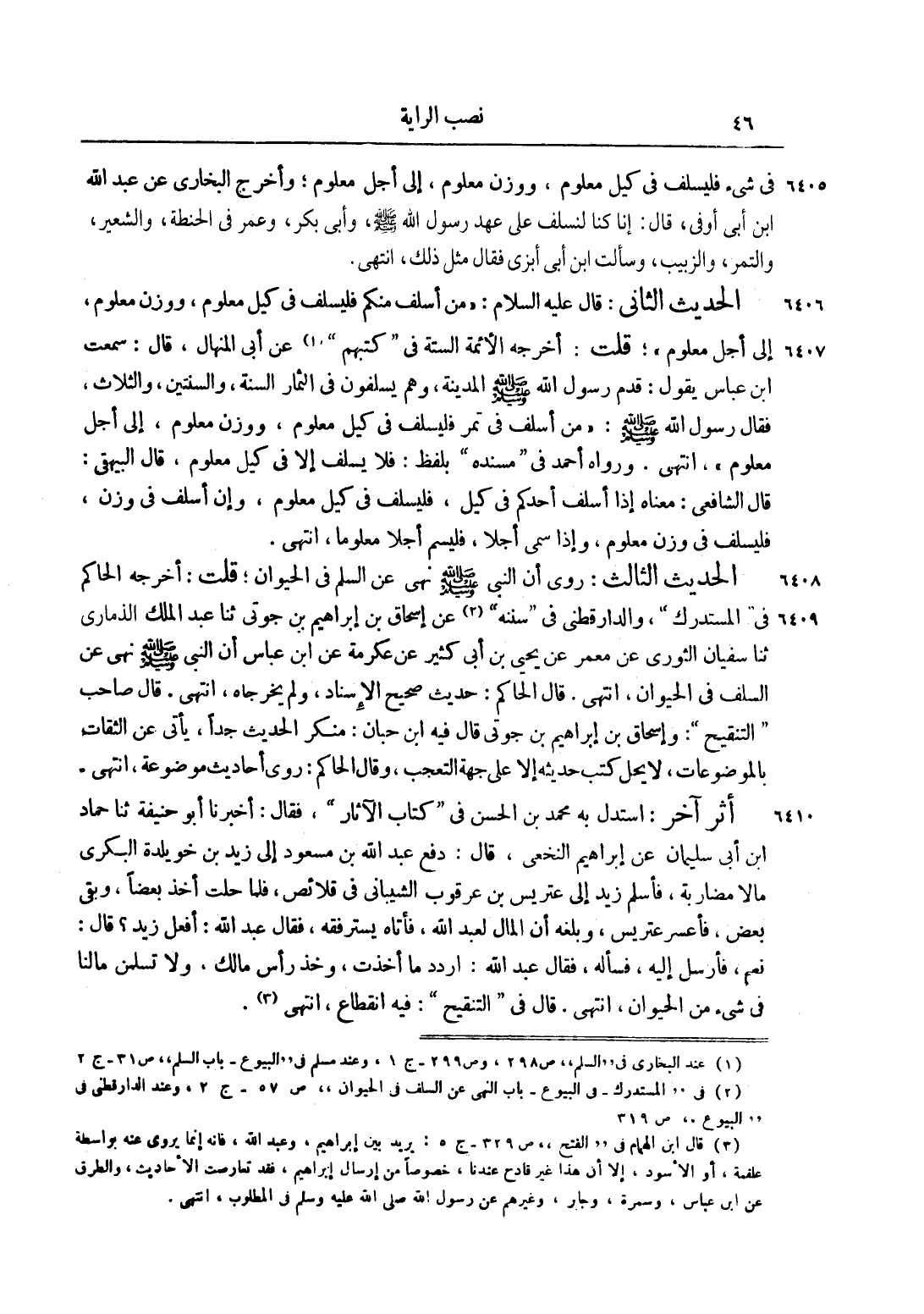 قُلْت: أَخْرَجَهُ الْحَاكِمُ فِي الْمُسْتَدْرَكِ، والدارقطني فِي سُنَنِهِ2 عَنْ إسْحَاقَ بْنِ إبْرَاهِيمَ بْنِ جُوتَى ثَنَا عَبْدُ الْمَلِكِ الزَّمَّارِيَّ ثَنَا سُفْيَانُ الثَّوْرِيُّ عَنْ مَعْمَرٍ عَنْ يَحْيَى بْنِ أَبِي كَثِيرٍ عَنْ عِكْرِمَةَ عَنْ ابْنِ عَبَّاسٍ أَنَّ النَّبِيَّ صَلَّى اللَّهُ عَلَيْهِ وَسَلَّمَ نَهَى عَنْ السَّلَفِ فِي الْحَيَوَانِ، انْتَهَى. قَالَ الْحَاكِمُ: حَدِيثٌ صَحِيحُ الْإِسْنَادِ، وَلَمْ يُخَرِّجَاهُ، انْتَهَى. قال صَاحِبُ التَّنْقِيحِ: وَإِسْحَاقُ بْنُ إبْرَاهِيمَ بْنِ جُوتَى قَالَ فِيهِ ابْنُ حِبَّانَ: مُنْكَرُ الحديث جداً، ويأتي عَنْ الثِّقَاتِ بِالْمَوْضُوعَاتِ، لَا يَحِلُّ كَتْبُ حَدِيثِهِ إلَّا عَلَى جِهَةِ التَّعَجُّبِ، وَقَالَ الْحَاكِمُ: رَوَى أَحَادِيثَ مَوْضُوعَةً، انْتَهَى.