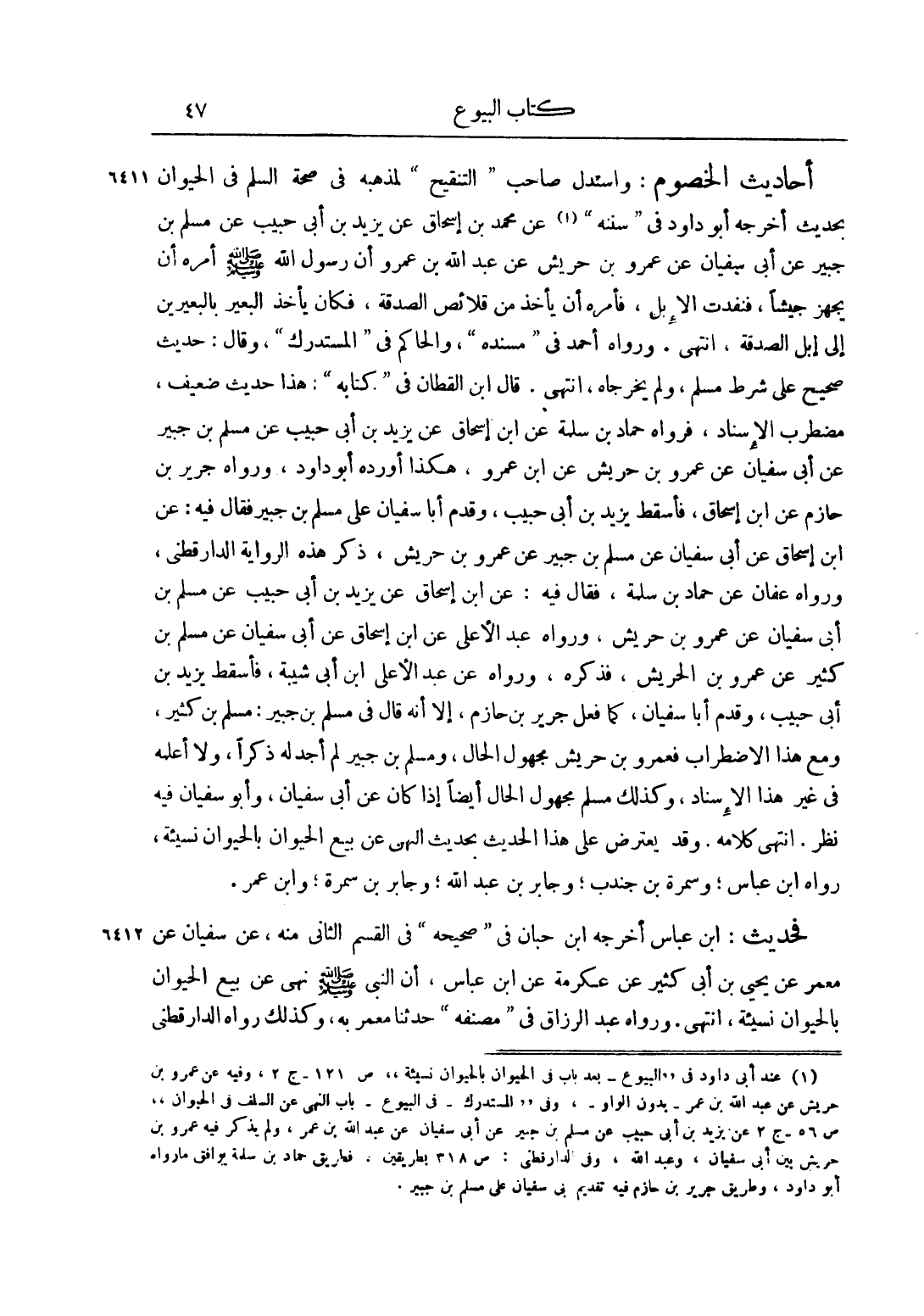 أَحَادِيثُ الْخُصُومِ: وَاسْتَدَلَّ صَاحِبُ التَّنْقِيحِ لِمَذْهَبِهِ فِي صِحَّةِ السَّلَمِ فِي الْحَيَوَانِ بِحَدِيثٍ أَخْرَجَهُ أَبُو دَاوُد فِي سُنَنِهِ1 عَنْ مُحَمَّدِ بْنِ إسْحَاقَ عَنْ يَزِيدَ بْنِ أَبِي حَبِيبٍ عَنْ مُسْلِمِ بْنِ جُبَيْرٍ عَنْ أَبِي سُفْيَانَ عَنْ عَمْرِو بْنِ حَرِيشٍ عَنْ عَبْدِ اللَّهِ بْنِ عَمْرٍو أَنَّ رَسُولَ اللَّهِ صَلَّى اللَّهُ عَلَيْهِ وَسَلَّمَ أَمَرَهُ أَنْ يُجَهِّزَ جَيْشًا، فَنَفِدَتْ الْإِبِلُ، فَأَمَرَهُ أَنْ يَأْخُذَ مِنْ قَلَائِصِ الصَّدَقَةِ، فَكَانَ يَأْخُذُ الْبَعِيرَ بِالْبَعِيرَيْنِ إلَى إبِلِ الصَّدَقَةِ، انْتَهَى. وَرَوَاهُ أَحْمَدُ فِي مُسْنَدِهِ، وَالْحَاكِمُ فِي الْمُسْتَدْرَكِ، وَقَالَ: حَدِيثٌ صَحِيحٌ عَلَى شَرْطِ مُسْلِمٍ، وَلَمْ يُخَرِّجَاهُ، انْتَهَى. قَالَ ابْنُ الْقَطَّانِ فِي كِتَابِهِ: هَذَا حَدِيثٌ ضَعِيفٌ، مُضْطَرِبُ الْإِسْنَادِ، فَرَوَاهُ حَمَّادُ بْنُ سَلَمَةَ عَنْ ابْنِ إسْحَاقَ عَنْ يَزِيدَ بْنِ أَبِي حَبِيبٍ عَنْ مُسْلِمِ بْنِ جُبَيْرٍ عَنْ أَبِي سُفْيَانَ عَنْ عَمْرِو بْنِ حَرِيشٍ عَنْ ابْنِ عَمْرٍو، هَكَذَا أَوْرَدَهُ أَبُو دَاوُد، وَرَوَاهُ جَرِيرُ بْنُ حَازِمٍ عَنْ ابْنِ إسْحَاقَ، فَأَسْقَطَ يَزِيدَ بْنَ أَبِي حَبِيبٍ، وَقَدَّمَ أَبَا سُفْيَانَ عَلَى مُسْلِمِ بْنِ جُبَيْرٍ فَقَالَ فِيهِ: عَنْ ابْنِ إسْحَاقَ عَنْ أَبِي سُفْيَانَ عَنْ مُسْلِمِ بْنِ جُبَيْرٍ عَنْ عَمْرِو بْنِ حَرِيشٍ، ذَكَرَ هَذِهِ الرِّوَايَةَ الدَّارَقُطْنِيُّ، وَرَوَاهُ عَفَّانَ عَنْ حَمَّادِ بْنِ سَلَمَةَ، فَقَالَ فِيهِ: عَنْ ابْنِ إسْحَاقَ عَنْ يَزِيدَ بْنِ أَبِي حَبِيبٍ عَنْ مُسْلِمِ بْنِ أَبِي سُفْيَانَ عَنْ عَمْرِو بْنِ حَرِيشٍ، وَرَوَاهُ عَبْدُ الْأَعْلَى عَنْ ابْنِ إسْحَاقَ عَنْ أَبِي سُفْيَانَ عَنْ مُسْلِمِ بْنِ كَثِيرٍ عَنْ عَمْرِو بْنِ الْحَرِيشِ، فَذَكَرَهُ، وَرَوَاهُ عَنْ عَبْدِ الْأَعْلَى بْنِ أَبِي شَيْبَةَ، فَأَسْقَطَ يَزِيدَ بْنِ أَبِي حَبِيبٍ، وَقَدَّمَ أَبَا سُفْيَانَ، كَمَا فَعَلَ جَرِيرُ بْنُ حَازِمٍ، إلَّا أَنَّهُ قَالَ فِي مُسْلِمِ بْنِ جُبَيْرٍ: مُسْلِمُ بْنُ كَثِيرٍ، وَمَعَ هَذَا الِاضْطِرَابِ فَعَمْرُو بْنُ حَرِيشٍ مَجْهُولُ الْحَالِ، وَمُسْلِمُ بْنُ جُبَيْرٍ لَمْ أَجِدْ لَهُ ذِكْرًا، وَلَا أَعْلَمُهُ فِي غَيْرِ هَذَا الْإِسْنَادِ، وَكَذَلِكَ مُسْلِمٌ مَجْهُولُ الْحَالِ أَيْضًا إذَا كَانَ عَنْ أَبِي سُفْيَانَ، وَأَبُو سُفْيَانُ فِيهِ نَظَرٌ. انْتَهَى كَلَامُهُ. وَقَدْ يُعْتَرَضُ عَلَى هَذَا الْحَدِيثِ بِحَدِيثٍ النَّهْيِ عَنْ بَيْعِ الْحَيَوَانِ بِالْحَيَوَانِ نَسِيئَةً، رَوَاهُ ابْنُ عَبَّاسٍ، وَسَمُرَةُ بْنُ جُنْدَبٍ، وَجَابِرُ بْنُ عَبْدِ اللَّهِ، وَجَابِرُ بْنُ سَمُرَةَ، وَابْنُ عُمَرَ.