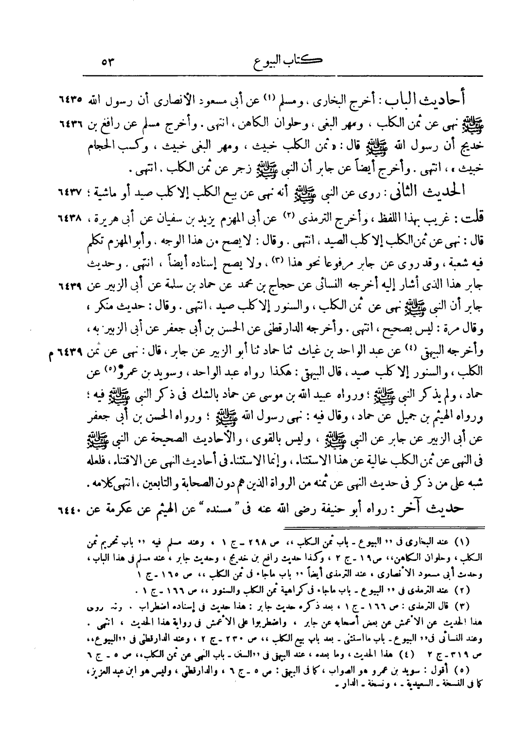 1 عند البخاري في البيوع باب ثمن الكلب ص 298 ج 1، وعند مسلم فيه باب تحريم ثمن الكلب، وحلوان الكاهن ص 19 ج 2، وكذا حديث رافع بن خديج، وحديث جابر، عند مسلم في هذا الباب، وحديث أبي مسعود الأنصاري، عند الترمذي أيضاً باب ما جاء في ثمن الكلب ص 165 ج 1.
