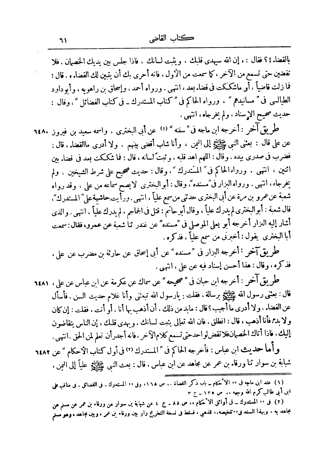 1 عند ابن ماجه في الأحكام باب ذكر القضاء ص 168، وفي المستدرك في الفضائل في مناقب علي ابن أبي طالب كرم الله وجهه ص 135 ج 3.