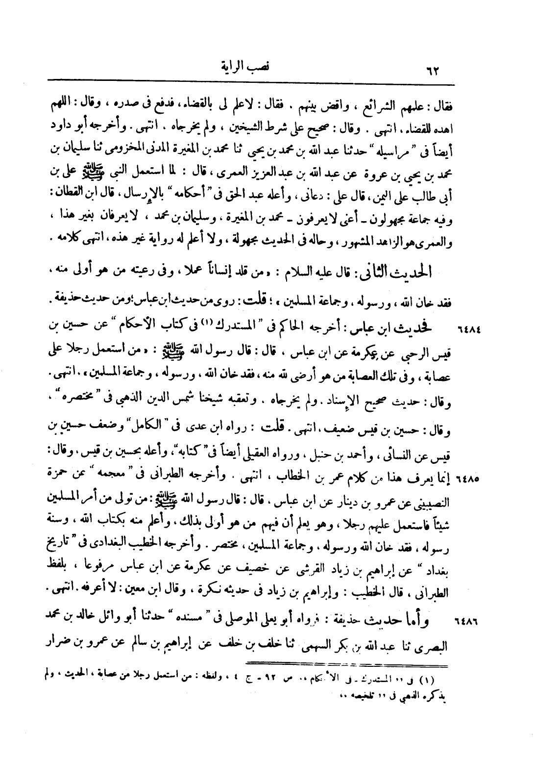 فَحَدِيثُ ابْنِ عَبَّاسٍ: أَخْرَجَهُ الْحَاكِمُ فِي الْمُسْتَدْرَكِ1 فِي كِتَابِ الْأَحْكَامِ عَنْ حُسَيْنِ بْنِ قَيْسٍ الرَّحَبِيِّ عَنْ عِكْرِمَةَ عَنْ ابْنِ عَبَّاسٍ، قَالَ: قَالَ رَسُولُ اللَّهِ صَلَّى اللَّهُ عَلَيْهِ وَسَلَّمَ: "مَنْ اسْتَعْمَلَ رَجُلًا عَلَى عِصَابَةٍ، وَفِي تِلْكَ الْعِصَابَةِ مَنْ هُوَ أَرْضَى لِلَّهِ مِنْهُ، فَقَدْ خَانَ اللَّهَ، وَرَسُولَهُ، وَجَمَاعَةَ الْمُسْلِمِينَ"، انْتَهَى. وَقَالَ: حَدِيثٌ صَحِيحُ الْإِسْنَادِ، وَلَمْ يُخَرِّجَاهُ، وَتَعَقَّبَهُ شَيْخُنَا شَمْسُ الدِّينِ الذَّهَبِيُّ فِي مُخْتَصَرِهِ، وَقَالَ: حُسَيْنُ بْنُ قَيْسٍ ضَعِيفٌ، انْتَهَى. قُلْت: رَوَاهُ ابْنُ عَدِيٍّ فِي الْكَامِلِ وَضَعَّفَ حُسَيْنَ بْنَ قَيْسٍ عَنْ النَّسَائِيّ، وَأَحْمَدَ بْنِ حَنْبَلٍ، وَرَوَاهُ الْعُقَيْلِيُّ أَيْضًا فِي كِتَابِهِ، وَأَعَلَّهُ بِحُسَيْنِ بْنِ قَيْسٍ، وَقَالَ: إنَّمَا يُعْرَفُ هَذَا مِنْ كَلَامِ عُمَرَ بْنِ الْخَطَّابِ، انْتَهَى. وَأَخْرَجَهُ الطَّبَرَانِيُّ فِي مُعْجَمِهِ عن حمزة النصيبيني عَنْ عَمْرِو بْنِ دِينَارٍ عَنْ ابْنِ عَبَّاسٍ، قَالَ: قَالَ رَسُولُ اللَّهِ صَلَّى اللَّهُ عَلَيْهِ وَسَلَّمَ: " مَنْ تولى من أمر المسليمن شَيْئًا فَاسْتَعْمَلَ عَلَيْهِمْ رَجُلًا، وَهُوَ يَعْلَمُ أَنَّ فِيهِمْ مَنْ هُوَ أَوْلَى بِذَلِكَ، وَأَعْلَمُ مِنْهُ بِكِتَابِ اللَّهِ، وَسُنَّةِ رَسُولِهِ، فَقَدْ خَانَ اللَّهَ وَرَسُولَهُ، وَجَمَاعَةَ الْمُسْلِمِينَ"، مُخْتَصَرٌ. وَأَخْرَجَهُ الْخَطِيبُ الْبَغْدَادِيُّ فِي تَارِيخِ بَغْدَادَ عَنْ إبْرَاهِيمَ بْنِ زِيَادٍ الْقُرَشِيِّ عَنْ خَصِيفٍ عَنْ عِكْرِمَةَ عَنْ ابْنِ عَبَّاسٍ مَرْفُوعًا، بِلَفْظِ الطَّبَرَانِيِّ، قَالَ الْخَطِيبُ: وَإِبْرَاهِيمُ بْنُ زِيَادٍ فِي حَدِيثِهِ نُكْرَةٌ، وَقَالَ ابْنُ مَعِينٍ: لَا أَعْرِفُهُ، انْتَهَى.