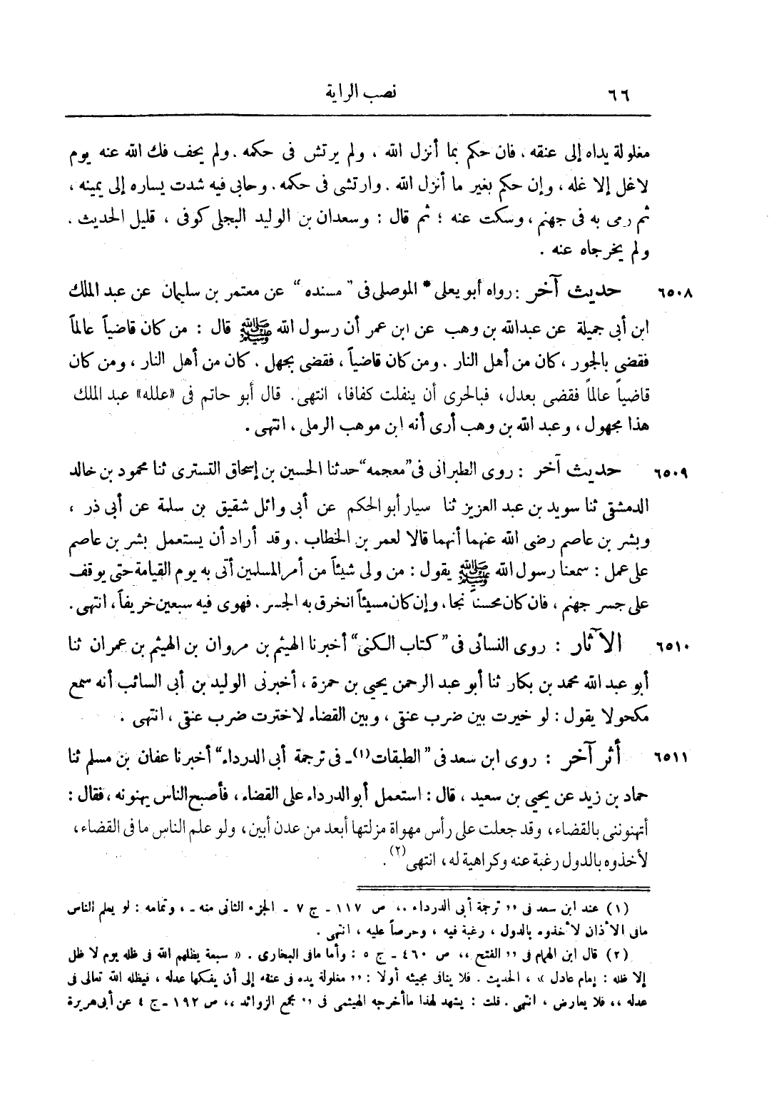حَدِيثٌ آخَرُ: رَوَاهُ أَبُو يَعْلَى الْمَوْصِلِيُّ في مسنده عن معمر بْنِ سُلَيْمَانَ عَنْ عَبْدِ الْمَلِكِ بْنِ أَبِي جَمِيلَةَ عَنْ عَبْدِ اللَّهِ بْنِ وَهْبٍ عَنْ ابْنِ عُمَرَ أَنَّ رَسُولَ اللَّهِ صَلَّى اللَّهُ عَلَيْهِ وَسَلَّمَ قَالَ: "مَنْ كَانَ قَاضِيًا عَالِمًا فَقَضَى بِالْجَوْرِ، كَانَ مِنْ أَهْلِ النَّارِ، وَمَنْ كَانَ قَاضِيًا، فَقَضَى بِجَهْلٍ، كَانَ مِنْ أَهْلِ النَّارِ، وَمَنْ كَانَ قَاضِيًا عَالِمًا فَقَضَى بِعَدْلٍ، فَبِالْحَرِيِّ أَنْ يَنْقَلِبَ كَفَافًا"، انْتَهَى. قَالَ أَبُو حَاتِمٍ فِي عِلَلِهِ عَبْدُ الْمَلِكِ هَذَا مَجْهُولٌ، وَعَبْدُ اللَّهِ بْنُ وَهْبٍ أَرَى ابْنَ مَوْهَبٍ الرَّمْلِيَّ، انْتَهَى.