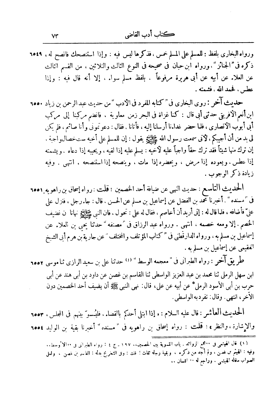 حَدِيثٌ آخَرُ: رَوَى الْبُخَارِيُّ فِي كِتَابِهِ الْمُفْرَدُ فِي الْأَدَبِ مِنْ حَدِيثِ عَبْدِ الرَّحْمَنِ بْنِ زِيَادِ بْنِ أَنْعُمٍ الْأَفْرِيقِيِّ حَدَّثَنِي أَبِي قَالَ: كُنَّا غُزَاةً فِي الْبَحْرِ زَمَنَ مُعَاوِيَةَ، فَانْضَمَّ مَرْكَبُنَا إلَى مَرْكَبِ أَبِي أَيُّوبَ الْأَنْصَارِيِّ، فَلَمَّا حَضَرَ غداءنا أَرْسَلْنَا إلَيْهِ، فَأَتَانَا، فَقَالَ: دَعَوْتُمُونِي وَأَنَا صَائِمٌ، فَلَمْ يَكُنْ لِي بُدٌّ مِنْ أَنْ أُجِيبَكُمْ، لِأَنِّي سَمِعْت رَسُولَ اللَّهِ صَلَّى اللَّهُ عَلَيْهِ وَسَلَّمَ يَقُولُ: "إنَّ لِلْمُسْلِمِ عَلَى أَخِيهِ سِتَّ خِصَالٍ وَاجِبَةٍ، إنْ تَرَكَ مِنْهَا شَيْئًا فَقَدْ تَرَكَ حَقًّا وَاجِبًا عَلَيْهِ لِأَخِيهِ: يُسَلِّمُ عَلَيْهِ إذَا لَقِيَهُ، وَيُجِيبُهُ إذَا دَعَاهُ، وَيُشَمِّتُهُ إذَا عَطَسَ، وَيَعُودُهُ إذَا مَرِضَ، وَيَحْضُرُهُ إذَا مَاتَ، وَيَنْصَحُهُ إذَا اسْتَنْصَحَهُ"، انْتَهَى. وَفِيهِ زِيَادَةُ ذِكْرِ الْوُجُوبِ.
