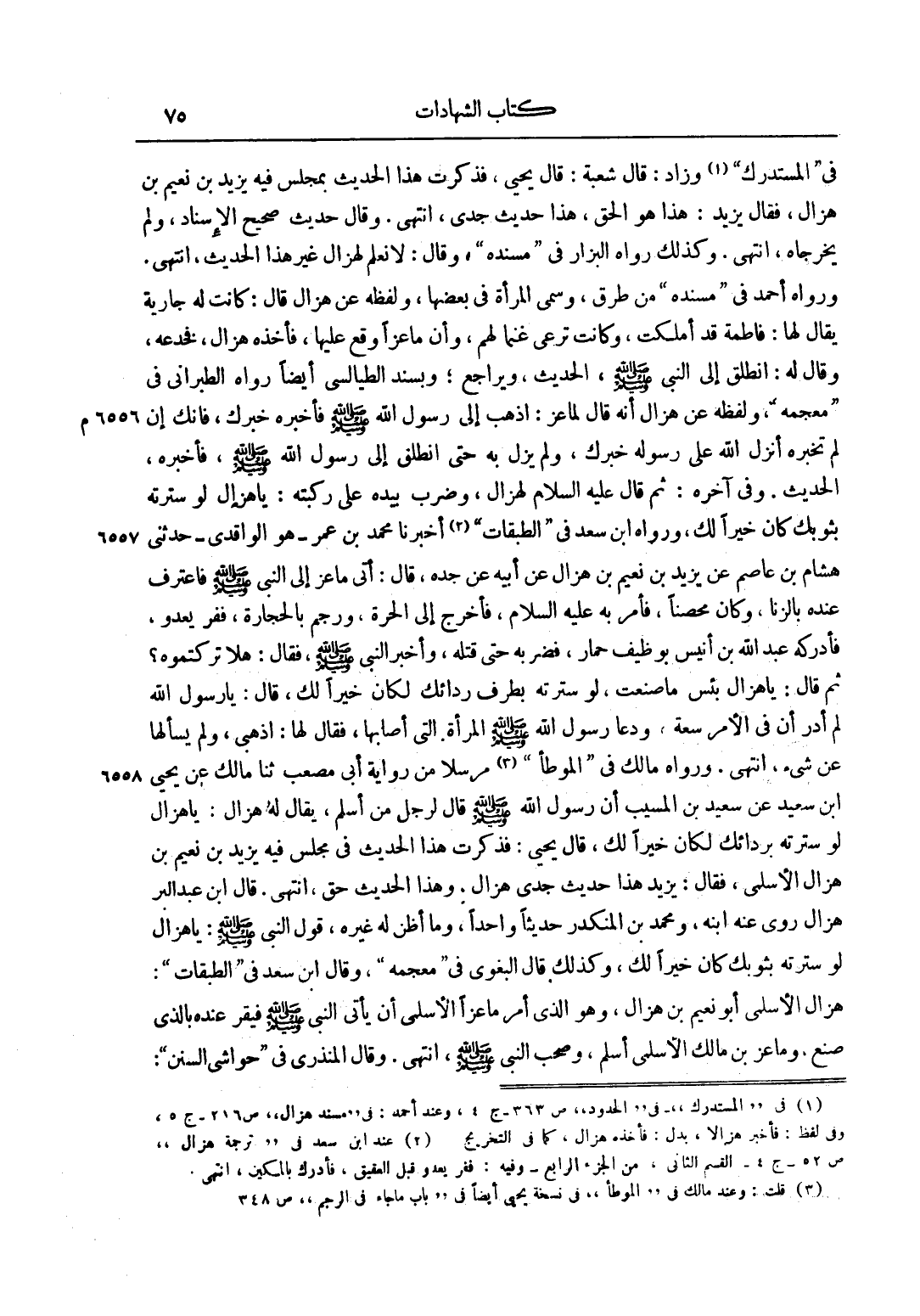 فِي الْمُسْتَدْرَكِ1 وَزَادَ: قَالَ شُعْبَةُ: قَالَ يَحْيَى، فَذَكَرْتُ هَذَا الْحَدِيثَ بِمَجْلِسٍ فِيهِ يَزِيدُ بْنُ نُعَيْمِ بْنِ هَزَّالٍ، فَقَالَ يَزِيدُ: هَذَا هُوَ الْحَقُّ، هَذَا حَدِيثُ جَدِّي، انْتَهَى. وَقَالَ حَدِيثٌ صَحِيحُ الْإِسْنَادِ، وَلَمْ يُخَرِّجَاهُ، انْتَهَى. وَكَذَلِكَ رَوَاهُ الْبَزَّارُ فِي مُسْنَدِهِ، وَقَالَ: لَا نَعْلَمُ لِهَزَّالٍ غَيْرَ هَذَا الْحَدِيثِ، انْتَهَى. وَرَوَاهُ أَحْمَدُ فِي مُسْنَدِهِ مِنْ طُرُقٍ، وَسَمَّى الْمَرْأَةَ فِي بَعْضِهَا، وَلَفْظُهُ عَنْ هَزَّالٍ قَالَ: كَانَتْ لَهُ جَارِيَةٌ يُقَالُ لَهَا فَاطِمَةُ قَدْ أَمْلَكَتْ، وَكَانَتْ تَرْعَى غَنَمًا لَهُمْ، وَأَنَّ مَاعِزًا وَقَعَ عَلَيْهَا، فَأَخَذَهُ هَزَّالٌ، فَخَدَعَهُ، وَقَالَ لَهُ: انْطَلِقْ إلَى النَّبِيِّ صَلَّى اللَّهُ عَلَيْهِ وَسَلَّمَ، الْحَدِيثَ، وَيُرَاجَعُ، وَبِسَنَدِ الطَّيَالِسِيِّ أَيْضًا رَوَاهُ الطَّبَرَانِيُّ فِي مُعْجَمِهِ، وَلَفْظُهُ عَنْ هَزَّالٍ أَنَّهُ قَالَ لِمَاعِزٍ: اذْهَبْ إلَى رَسُولِ اللَّهِ صَلَّى اللَّهُ عَلَيْهِ وَسَلَّمَ فَأَخْبِرْهُ خَبَرَك، فَإِنَّك إنْ لَمْ تُخْبِرْهُ أَنْزَلَ اللَّهُ عَلَى رَسُولِهِ خَبَرَك، وَلَمْ يَزَلْ بِهِ حَتَّى انْطَلَقَ إلَى رَسُولِ اللَّهِ صَلَّى اللَّهُ عَلَيْهِ وَسَلَّمَ، فَأَخْبَرَهُ، الْحَدِيثَ. وَفِي آخِرِهِ: ثُمَّ قَالَ عليه السلام لِهَزَّالٍ، وَضَرَبَ بِيَدِهِ عَلَى رُكْبَتِهِ: "يَا هَزَّالُ لَوْ سَتَرْتَهُ بِثَوْبِك كَانَ خَيْرًا لَك"، رواه ابْنُ سَعْدٍ فِي الطَّبَقَاتِ2 أَخْبَرَنَا مُحَمَّدُ بْنُ عُمَرَ هُوَ الْوَاقِدِيُّ حَدَّثَنِي هِشَامُ بْنُ عَاصِمٍ عَنْ يَزِيدَ بْنِ نُعَيْمِ بْنِ هَزَّالٍ عَنْ أَبِيهِ عَنْ جَدِّهِ، قَالَ: أَتَى مَاعِزٌ إلَى النَّبِيِّ صَلَّى اللَّهُ عَلَيْهِ وَسَلَّمَ فَاعْتَرَفَ عِنْدَهُ بِالزِّنَا، وَكَانَ مُحْصَنًا، فَأَمَرَ بِهِ عليه السلام، فَأُخْرِجَ إلَى الْحَرَّةِ، وَرُجِمَ بِالْحِجَارَةِ، فَفَرَّ يَعْدُو، فَأَدْرَكَهُ عَبْدُ اللَّهِ بْنُ أُنَيْسٌ بِوَظِيفِ حِمَارٍ، فَضَرَبَهُ حَتَّى قَتَلَهُ، وَأَخْبَرَ النَّبِيَّ صَلَّى اللَّهُ عَلَيْهِ وَسَلَّمَ، فَقَالَ: "هَلَّا تَرَكْتُمُوهُ"؟ ثُمَّ قَالَ: "يَا هَزَّالُ بِئْسَ مَا صَنَعْت، لَوْ سَتَرْتَهُ بِطَرَفِ رِدَائِك لَكَانَ خَيْرًا لَك"، قَالَ: يَا رَسُولَ اللَّهِ لَمْ أَدْرِ أَنَّ فِي الْأَمْرِ سَعَةً، وَدَعَا رَسُولُ اللَّهِ صَلَّى اللَّهُ عَلَيْهِ وَسَلَّمَ الْمَرْأَةَ الَّتِي أَصَابَهَا، فَقَالَ لَهَا: "اذْهَبِي"، وَلَمْ يَسْأَلْهَا عَنْ شَيْءٍ، انْتَهَى. وَرَوَاهُ مَالِكٌ فِي الْمُوَطَّإِ3 مُرْسَلًا مِنْ رِوَايَةِ أَبِي مُصْعَبٍ ثَنَا مَالِكٌ عَنْ يَحْيَى بْنِ سَعِيدٍ عَنْ سَعِيدِ بْنِ الْمُسَيِّبِ أَنَّ رَسُولَ اللَّهِ صَلَّى اللَّهُ عَلَيْهِ وَسَلَّمَ قَالَ لِرَجُلٍ مِنْ أَسْلَمَ، يُقَالُ لَهُ هَزَّالٌ: " يَا هَزَّالُ لَوْ سَتَرْتَهُ بِرِدَائِك لَكَانَ خَيْرًا لَك"، قَالَ يَحْيَى: فَذَكَرْتُ هَذَا الْحَدِيثَ فِي مَجْلِسٍ فِيهِ يَزِيدُ بْنُ نُعَيْمِ بْنِ هَزَّالٍ الْأَسْلَمِيُّ، فَقَالَ يَزِيدُ: هَذَا حَدِيثُ جَدِّي هَزَّالٍ. وَهَذَا الْحَدِيثُ حَقٌّ، انْتَهَى. قَالَ ابْنُ عَبْدِ الْبَرِّ هَزَّالٌ رَوَى عَنْهُ ابْنُهُ، وَمُحَمَّدُ بْنُ الْمُنْكَدِرِ حَدِيثًا وَاحِدًا، وَمَا أَظُنُّ لَهُ غَيْرَهُ، قَوْلُ النَّبِيِّ صَلَّى اللَّهُ عَلَيْهِ وَسَلَّمَ: "يَا هَزَّالُ لَوْ سَتَرْتَهُ بِثَوْبِك كَانَ خَيْرًا لَك"، وَكَذَلِكَ قَالَ الْبَغَوِيّ فِي مُعْجَمِهِ، وَقَالَ ابْنُ سَعْدٍ فِي الطَّبَقَاتِ: هَزَّالٌ الْأَسْلَمِيُّ أَبُو نُعَيْمِ بْنُ هَزَّالٍ، وَهُوَ الَّذِي أَمَرَ مَاعِزًا الْأَسْلَمِيَّ أَنْ يَأْتِيَ النَّ