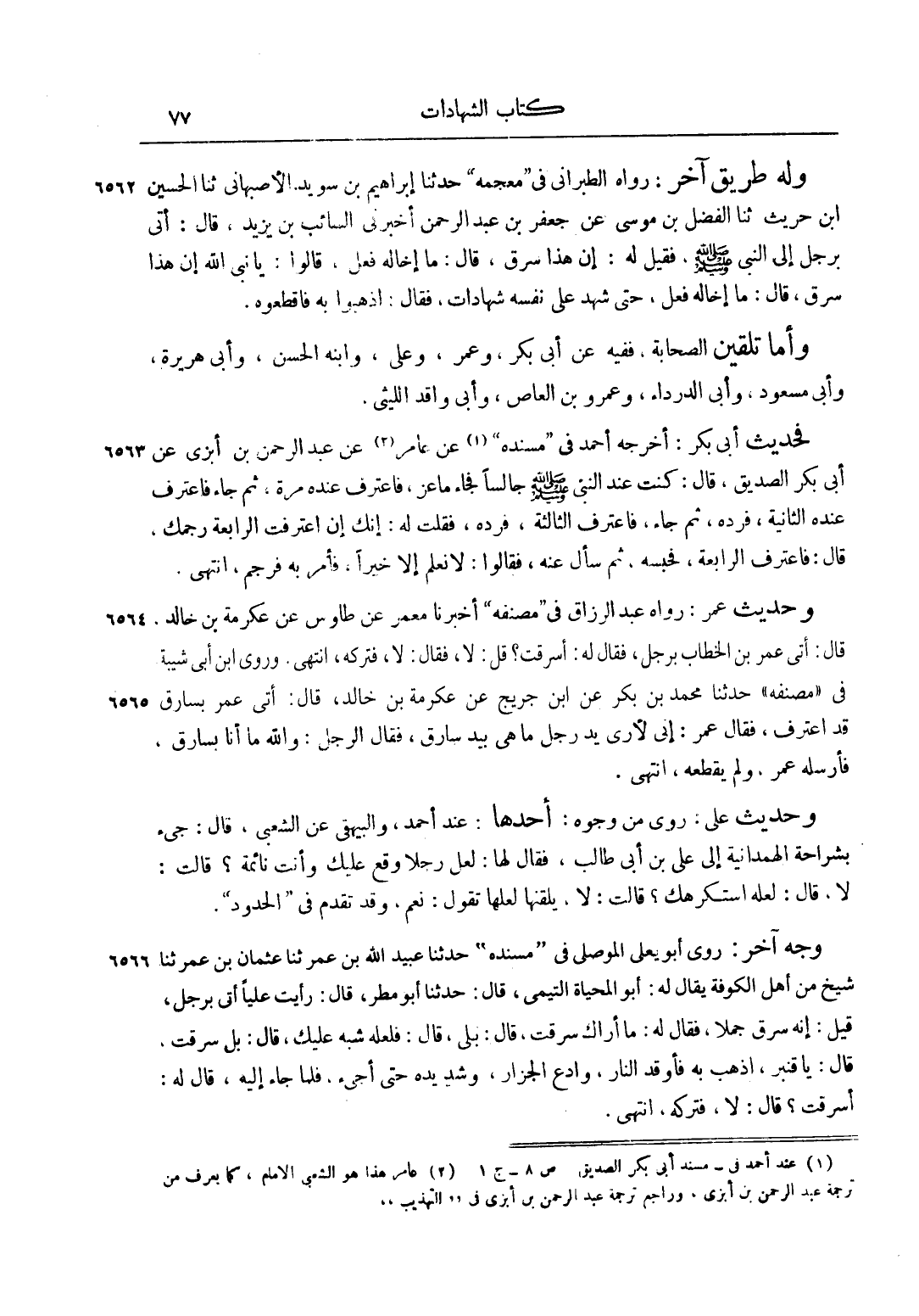 وَحَدِيثُ عُمَرَ: رَوَاهُ عَبْدُ الرَّزَّاقِ فِي مُصَنَّفِهِ أَخْبَرَنَا مُعْمَرٌ عَنْ طَاوُسٍ عَنْ عِكْرِمَةَ بْنِ خَالِدٍ، قَالَ: أُتِيَ عُمَرُ بْنُ الْخَطَّابِ بِرَجُلٍ، فَقَالَ لَهُ: أَسَرَقْت؟ فَقَالَ: لَا، فَتَرَكَهُ، انْتَهَى. وَرَوَى ابْنُ أَبِي شَيْبَةَ فِي مُصَنَّفِهِ حَدَّثَنَا مُحَمَّدُ بْنُ بَكْرٍ عَنْ ابْنِ جُرَيْجٍ عَنْ عِكْرِمَةَ بْنِ أَبِي خَالِدٍ، قَالَ: أُتِيَ عُمَرُ بِسَارِقٍ قَدْ اعْتَرَفَ، فَقَالَ عُمَرُ: إنِّي لَأَرَى يَدَ رَجُلٍ مَا هِيَ بِيَدِ سَارِقٍ، فَقَالَ الرَّجُلُ: وَاَللَّهِ مَا أَنَا بِسَارِقٍ، فَأَرْسَلَهُ عُمَرُ، وَلَمْ يَقْطَعْهُ، انْتَهَى.