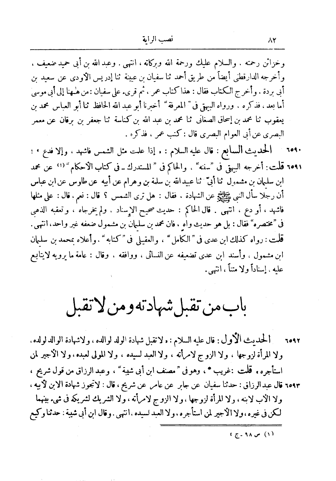 الْحَدِيثُ الْأَوَّلُ: قَالَ عليه السلام: "لَا تُقْبَلُ شَهَادَةُ الْوَلَدِ لِوَالِدِهِ، وَلَا شَهَادَةُ الْوَالِدِ لِوَلَدِهِ، وَلَا الْمَرْأَةِ لِزَوْجِهَا، وَلَا الزَّوْجِ لِامْرَأَتِهِ، وَلَا الْعَبْدِ لِسَيِّدِهِ، وَلَا الْمَوْلَى لِعَبْدِهِ، وَلَا الْأَجِيرِ لِمَنْ اسْتَأْجَرَهُ" قُلْت: غَرِيبٌ، وَهُوَ فِي مُصَنَّفِ ابْنِ أَبِي شَيْبَةَ، وَعَبْدِ الرَّزَّاقِ مِنْ قَوْلِ شُرَيْحٍ، قَالَ عَبْدُ الرَّزَّاقِ: حَدَّثَنَا سُفْيَانُ عَنْ جَابِرٍ عَنْ عَامِرٍ عَنْ شُرَيْحٍ، قَالَ: لَا تَجُوزُ شَهَادَةُ الِابْنِ لِأَبِيهِ، وَلَا الْأَبِ لِابْنِهِ، وَلَا الْمَرْأَةِ لِزَوْجِهَا، وَلَا الزَّوْجِ لِامْرَأَتِهِ، وَلَا الشَّرِيكِ لِشَرِيكِهِ فِي شَيْءٍ بَيْنَهُمَا، لَكِنْ فِي غَيْرِهِ، وَلَا الْأَجِيرِ لِمَنْ اسْتَأْجَرَهُ، وَلَا الْعَبْدِ لِسَيِّدِهِ، انْتَهَى. وَقَالَ ابْنُ أَبِي شَيْبَةَ: حَدَّثَنَا وَكِيعٌ