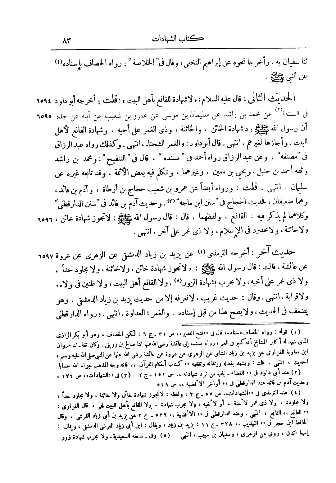الْحَدِيثُ الثَّانِي: قَالَ عليه السلام: "لَا شَهَادَةَ لِلْقَانِعِ بِأَهْلِ الْبَيْتِ". قُلْت: أَخْرَجَهُ أَبُو دَاوُد فِي سُنَنِهِ2 عَنْ مُحَمَّدِ بْنِ رَاشِدٍ عَنْ سُلَيْمَانَ بْنِ مُوسَى عَنْ عَمْرِو بن شعيب به عَنْ أَبِيهِ عَنْ جَدِّهِ أَنَّ رَسُولَ اللَّهِ صَلَّى اللَّهُ عَلَيْهِ وَسَلَّمَ رَدَّ شَهَادَةَ الْخَائِنِ، وَالْخَائِنَةِ، وَذِي الْغَمْرِ عَلَى أَخِيهِ، وَشَهَادَةَ الْقَانِعِ لِأَهْلِ الْبَيْتِ، وَأَجَازَهَا لِغَيْرِهِمْ، انْتَهَى. قَالَ أَبُو دَاوُد: وَالْغَمْرُ الشَّحْنَاءُ، انْتَهَى. وَكَذَلِكَ رَوَاهُ عَبْدُ الرَّزَّاقِ في مصنفه، وعن عَبْدِ الرَّزَّاقِ رَوَاهُ أَحْمَدُ فِي مُسْنَدِهِ، قَالَ فِي التَّنْقِيحِ: وَمُحَمَّدُ بْنُ رَاشِدٍ وَثَّقَهُ أَحْمَدُ بْنُ حَنْبَلٍ، وَيَحْيَى بْنُ مَعِينٍ، وَغَيْرُهُمَا، وَتَكَلَّمَ فِيهِ بَعْضُ الْأَئِمَّةِ، وَقَدْ تَابَعَهُ غَيْرُهُ عَنْ سُلَيْمَانَ. انْتَهَى. قُلْت: وَرَوَاهُ أَيْضًا عَنْ عَمْرِو بْنِ شُعَيْبٍ حَجَّاجُ بْنُ أَرْطَاةَ، وَآدَمُ بْنُ فَائِدٍ، وَهُمَا ضَعِيفَانِ، فَحَدِيثُ الْحَجَّاجِ فِي سُنَنِ ابْنِ مَاجَهْ3، وَحَدِيثُ آدَمَ بْنِ فَائِدٍ فِي سُنَنِ الدَّارَقُطْنِيِّ وَكِلَاهُمَا لَمْ يَذْكُرْ فِيهِ: الْقَانِعَ، وَلَفْظُهُمَا، قَالَ: قَالَ رَسُولُ اللَّهِ صَلَّى اللَّهُ عَلَيْهِ وَسَلَّمَ: "لَا تَجُوزُ شَهَادَةُ خَائِنٍ، وَلَا خَائِنَةٍ، وَلَا مَحْدُودٍ فِي الْإِسْلَامِ، وَلَا ذِي غَمْرٍ عَلَى آخَرَ"، انْتَهَى.