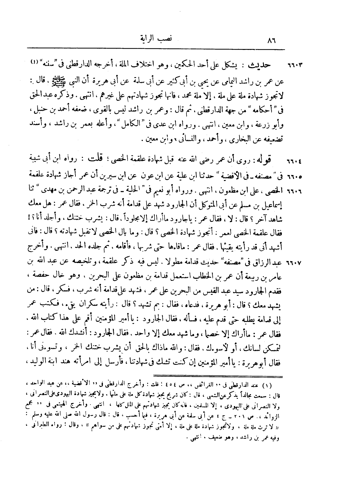 1 عند الدارقطني في الفرائض ص 454، قلت: وأخرج الدارقطني في الأقضية عن عبد الواحد، قال: سمعت مجالداً يذكر عن الشعبي، قال: كان شريح يجيز شهادة كل ملة على ملتها. ولا يجيز شهادة اليهودي على النصراني، ولا النصراني على اليهودي، إلا المسلمين، فإنه كان يجبز شهادتهم على الملل كلها، انتهى. وأخرج الهيثمي في مجمع الزوائد ص 201 ج 4 عن أبي سلمة عن أبي هريرة، فيما أحسب، قال: قال رسول الله صَلَّى اللَّهُ عَلَيْهِ وَسَلَّمَ: "لا ترث ملة ملة، ولا تجوز شهادة ملة على ملة، إلا أمتي تجوز شهادتهم على من سواهم"، وقال: رواه الطبراني، وفيه عمر بن راشد، وهو ضعيف، انتهى.