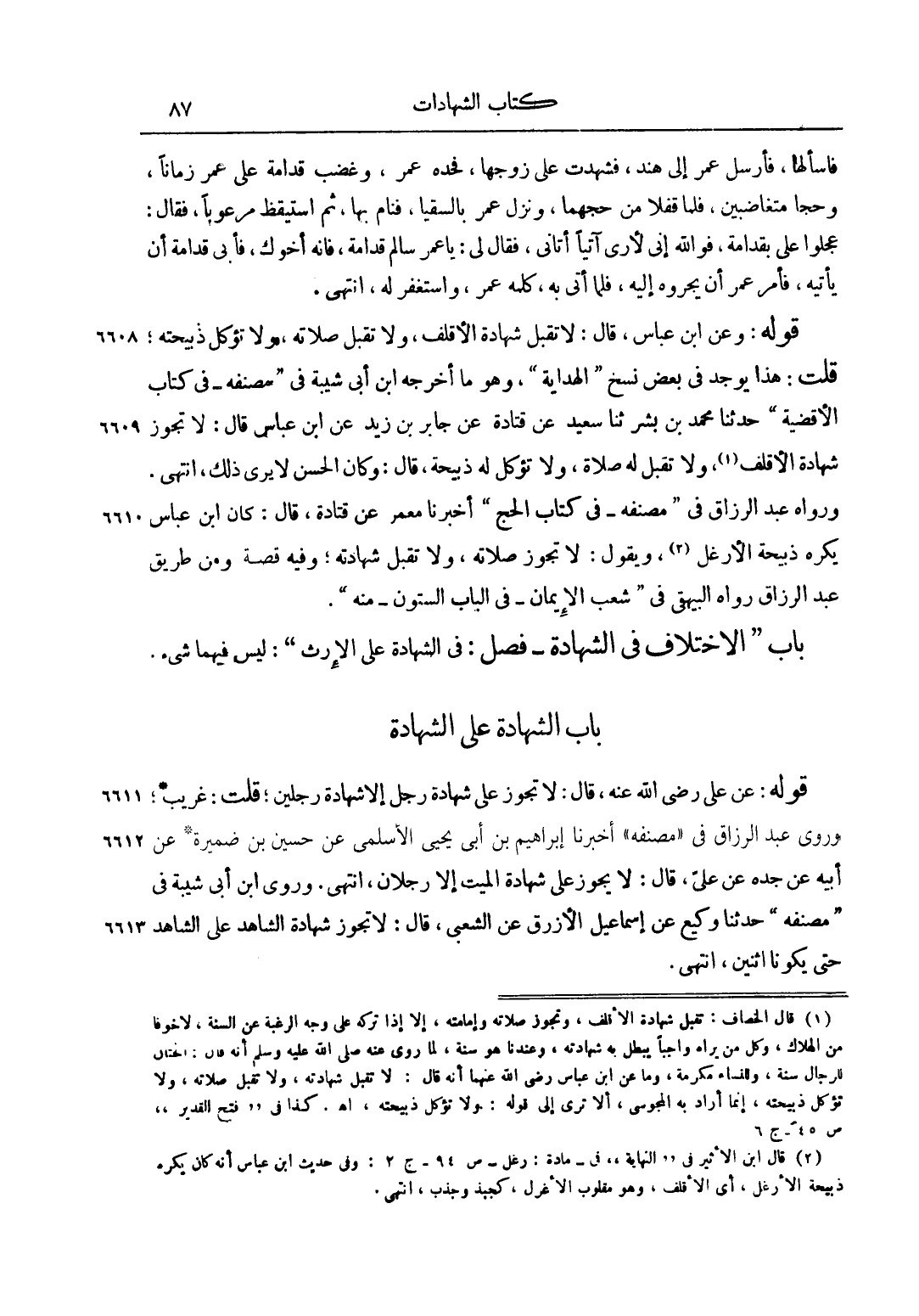 قَوْلُهُ: عَنْ عَلِيٍّ رضي الله عنه، قَالَ: لَا تَجُوزُ عَلَى شَهَادَةِ رَجُلٍ إلَّا شَهَادَةُ رَجُلَيْنِ، قُلْت: غَرِيبٌ، وَرَوَى عَبْدُ الرَّزَّاقِ فِي مُصَنَّفِهِ أَخْبَرَنَا إبْرَاهِيمُ بْنُ أَبِي يَحْيَى الْأَسْلَمِيُّ عَنْ حُسَيْنِ بْنِ ضُمَيْرَةَ عَنْ أَبِيهِ عَنْ جَدِّهِ عَنْ عَلِيٍّ، قَالَ: لَا يَجُوزُ عَلَى شَهَادَةِ الْمَيِّتِ إلَّا رَجُلَانِ، انْتَهَى. وَرَوَى ابْنُ أَبِي شَيْبَةَ فِي مُصَنَّفِهِ حَدَّثَنَا وَكِيعٌ عَنْ إسْمَاعِيلَ الْأَزْرَقِ عَنْ الشَّعْبِيِّ، قَالَ: لَا تَجُوزُ شَهَادَةُ الشَّاهِدِ عَلَى الشَّاهِدِ حَتَّى يَكُونَا اثْنَيْنِ، انْتَهَى.