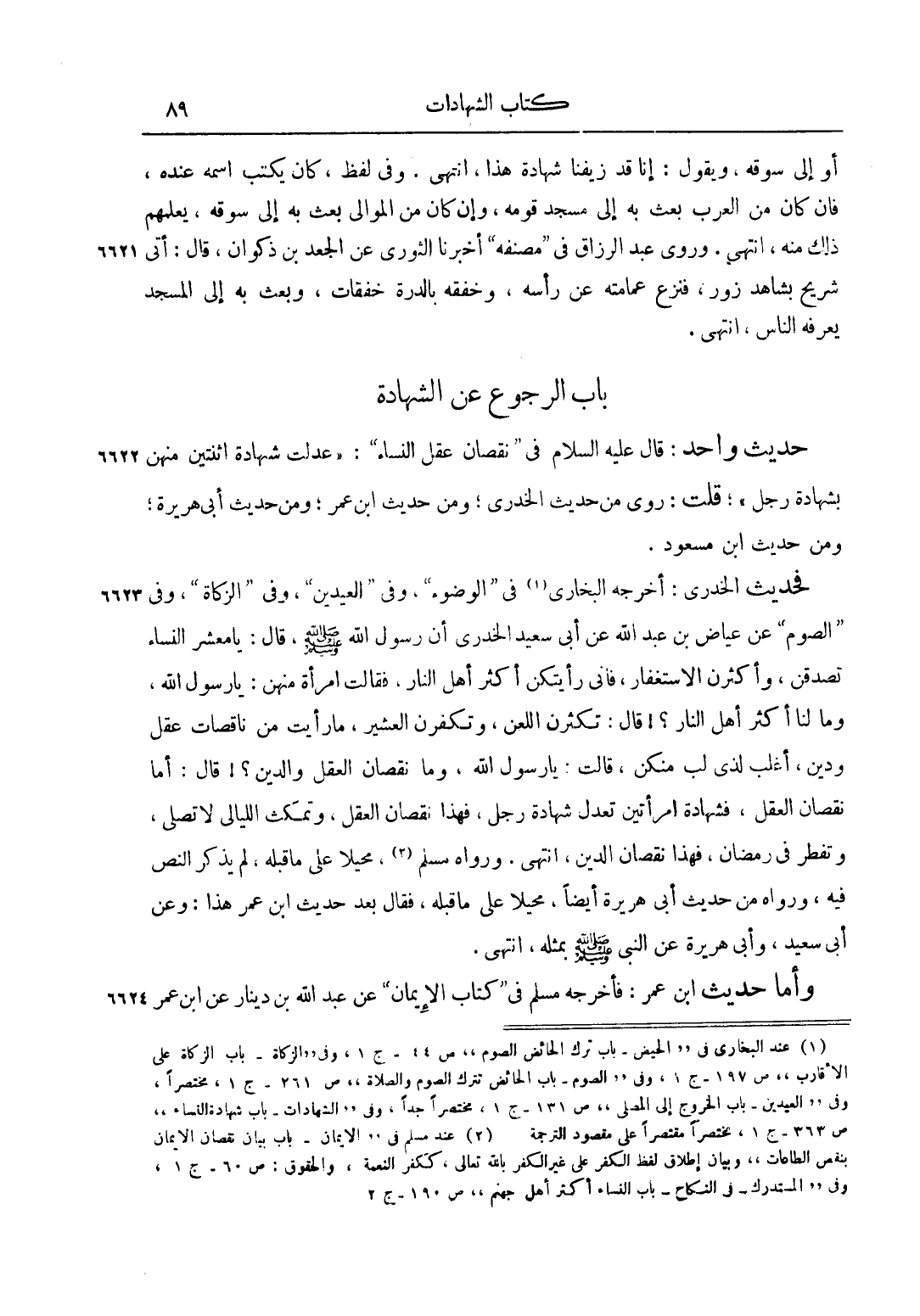 حَدِيثٌ وَاحِدٌ: قَالَ عليه السلام فِي نُقْصَانِ عَقْلِ النِّسَاءِ: "عَدَلَتْ شَهَادَةُ اثْنَتَيْنِ مِنْهُنَّ بِشَهَادَةِ رَجُلٍ". قُلْت: رُوِيَ مِنْ حَدِيثِ الْخُدْرِيِّ، وَمِنْ حَدِيثِ ابْنِ عُمَرَ، وَمِنْ حَدِيثِ أَبِي هُرَيْرَةَ، وَمِنْ حَدِيثِ ابْنِ مَسْعُودٍ.